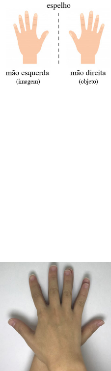 242 Figura 195: imagem da mão direita. Fonte: autor. A mão esquerda é idêntica direita? Ou seja, a mão direita (objeto) e a mão esquerda (imagem) são idênticas? Aparentemente, sim... Se forem idênticas, é possível sobrepor uma à outra. As mãos não se sobrepõem (Figura 196). Figura 196: as mãos direita e esquerda não se sobrepõe. Fonte: autor. Perceba que as mãos são parecidas, mas não são sobreponíveis, ou seja, não são idênticas. As mãos possuem uma relação de imagem, onde uma é a imagem especular da outra, mas não são sobreponíveis 243 (não vale colocar uma de frente para a outra; isso não seria sobreposi- ção). Apesar de serem parecidas, o arranjo dos dedos é diferente. Se você não está convencido de que as mãos não são idênticas, pense no seguinte: se elas fossem idênticas, qualquer uma das mãos (esquerda ou direita) cabe- ria em qualquer uma das luvas (esquerda ou direita) (Figura 197). Figura 197: as mãos e o encaixe nas luvas. Fonte: reprodução Freepik. Viu! Essa é uma forma bem simples de comprovar que as mãos são semelhantes, mas não idênticas! A operação de sobreposição de objeto e imagem está rela- cionado à simetria. Simetria é um elemento que permeia os vários segmentos do conhecimento humano: as artes, a arquitetura, a natureza (a biologia), a matemática, etc. Se desejar conhecer mais, faça uma pesquisa sobre simetria. De uma maneira bem simples: um objeto (ou uma enti- dade qualquer) é simétrico quando ao ser “dividido” ao meio as duas partes “são iguais”.
