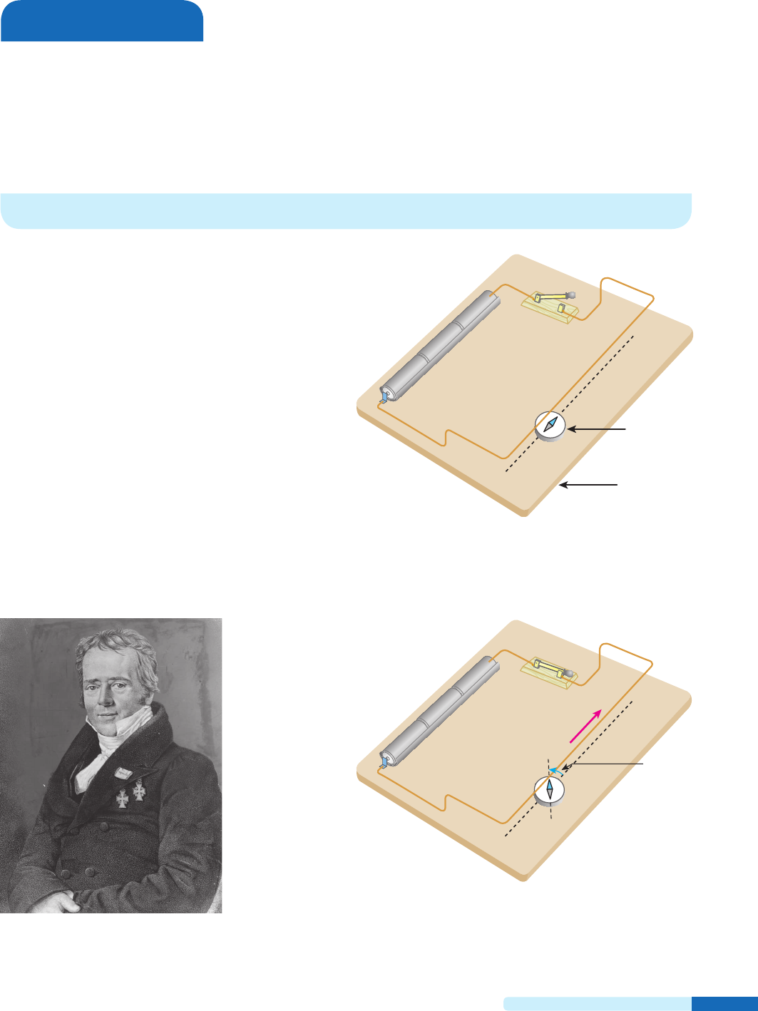 Tópico 2 – A origem do campo magnético 249 A origem do campo magnético Bloco 1 Tópico 2 1. Introdução Já conhecemos as origens dos campos gravita- cional e eletrostático: uma massa cria um campo gravitacional, e uma carga elétrica estacionária cria um campo eletrostático. Vamos, agora, estudar a origem do campo mag- nético. Em 1820, o dinamarquês Hans Christian Oers- ted (1777-1851), professor de Física da Universidade de Copenhague, mostrou experimentalmente que os fenômenos elétricos e os magnéticos não eram tão independentes como se supunha até então. Oersted descobriu que um fio percorrido por corrente elétri- ca, colocado nas proximidades de uma bússola, era capaz de provocar desvio na agulha magnética. Des- sa maneira, comprovou-se a ligação existente entre eletricidade e magnetismo. Hans Christian Oersted, físico dinamarquês, que muito contribuiu para o desenvolvimento do Eletromagnetismo e de suas aplicações tecnológicas. H u lt o n A rc h iv e/ G et ty I m ag es Na figura, a agulha da bússola já se estabilizou na direção norte-sul. A chave está aberta e, portanto, não circula corrente no fio condutor AB (de cobre), disposto paralelamente à agulha e acima dela. A N S Chave Pilhas B Madeira Bússola + – As três figuras a seguir ilustram a experiência de Oersted: Fechando-se a chave, o condutor AB é percorrido por uma corrente i, no sentido indicado. A agulha sofre um desvio, estabilizando-se numa direção diferente da anterior. Abrindo-se a chave, a agulha volta a se estabilizar na direção norte-sul. A N S B + – Desvio i TF3-249_275_P3T2_5P.indd 249 20/08/12 13:23 Parte III – Eletromagnetismo250 Para interpretar o resultado desse experimento, é preciso lembrar que a agulha da bússola se esta- biliza na direção do campo magnético no local em que ela se encontra, com seu polo norte magnético apontando no sentido desse campo. Na primeira das três figuras, a agulha estava ali- nhada com o campo magnético da Terra. Nas outras duas figuras, porém, a agulha se estabilizou em di- reções diferentes, alinhando-se, portanto, com um campo magnético diferente do da Terra. Constata-se, então, que a corrente elétrica no fio AB criou um campo magnético que, compos- to com o da Terra, produziu um campo magnético resultante, com o qual a agulha passou a se alinhar. Portanto: Cargas elétricas em movimento, ou seja, cor- rentes elétricas, criam um campo magnético na região do espaço que as circunda, sendo, portan- to, fontes de campo magnético. Neste momento, podemos questionar a origem do campo magnético de um ímã. Para um ímã produzir seu campo magnético, ele não precisa ser ligado a uma pilha ou a uma bateria, ou seja, não precisamos fazer uma corrente elétrica passar por ele. Do ponto de vista clássico, a causa do campo magnético de um ímã, entretanto, continua sendo correntes elétricas: são pequeníssimas correntes de- vidas ao movimento dos elétrons dos átomos que constituem o ímã, como veremos no item 5 deste Tópico. Notas: - père mostrou, também experimentalmente, que um fio de cobre enrolado em forma de hélice cilíndrica, chama- do solenoide, produzia externamente os mesmos efeitos que um ímã em forma de barra reta, quando nesse fio era estabelecida uma corrente elétrica. determinado referencial cria, nesse referencial, um cam- po elétrico E, por estar eletrizado, e um campo magnéti- co B, por estar eletrizado e em movimento. Réplica do equipamento usado por Oersted em seu experimento. D K L im it ed /C o rb is /L at in st o ck Faça você mesmo Invertendo o sentido da corrente, a agulha sofre um desvio no sentido oposto. A N S B – + Desvio i Corrente elétrica gera campo magnético Coloque a bússola construída no experimento proposto no “Faça você mesmo” do Tópico 1 em um recipiente de vidro, plástico ou alumínio, e enrole nele um fio de cobre esmaltado, dando várias voltas, como mostra a figura. Coloque água no reci- piente, de modo que o pedaço de isopor (com a agulha imantada) fique próximo do fio de cobre. Posicione o recipiente de tal forma que a agulha fique alinhada com o fio de cobre sobre ela. Raspe as pontas (1) e (2) do fio de cobre para retirar o esmalte isolante que existe nele. Em seguida, ligue as pon- tas aos terminais de uma pilha comum e observe o desvio da agulha imantada. Esse desvio comprova o surgimento de um campo magnético criado pela corrente elétrica que passa pelo fio. Obviamente, você pode realizar um experimento equivalente a este, usando uma outra bússola qualquer. Fio de cobre(2) (1) TF3-249_275_P3T2_5P.indd 250 20/08/12 13:23 Tópico 2 – A origem do campo magnético 251 2. Campo magnético gerado por um fio retilíneo muito longo (infinito) Linhas de indução Na prática, quando nos referimos a “fio muito lon- go” ou “fio infinito”, estamos considerando as regiões próximas do fio e bem afastadas de suas extremidades. A figura a seguir sugere um experimento em que será gerado um campo magnético supostamente in- tenso o suficiente para podermos ignorar o campo magnético da Terra. Um fio retilíneo AB perfura uma placa, de pape- lão, madeira ou plástico, perpendicularmente. Esse fio está ligado a um gerador, capaz de produzir nele uma corrente elétrica de grande intensidade i. Placa A B i Gerador + – Observamos que as linhas de indução desse campo são circunferências dispostas em um plano perpendicular ao fio, todas com centro nesse fio. Para descobrir o sentido dessas linhas de indu- ção, usamos uma bússola, em vez de limalhas de fer- ro. Deslocamos a bússola sobre a placa, mantendo-a sempre à mesma distância do fio. Observe, na ilus- tração a seguir, os posicionamentos da agulha. i Se pulverizarmos limalha de ferro sobre a placa, poderemos observar a configuração das linhas de indução do campo magnético gerado pelo fio. R ic h ar d M eg n a/ Fu n d am en ta l P h o to g ra p h s Padrão do campo mag