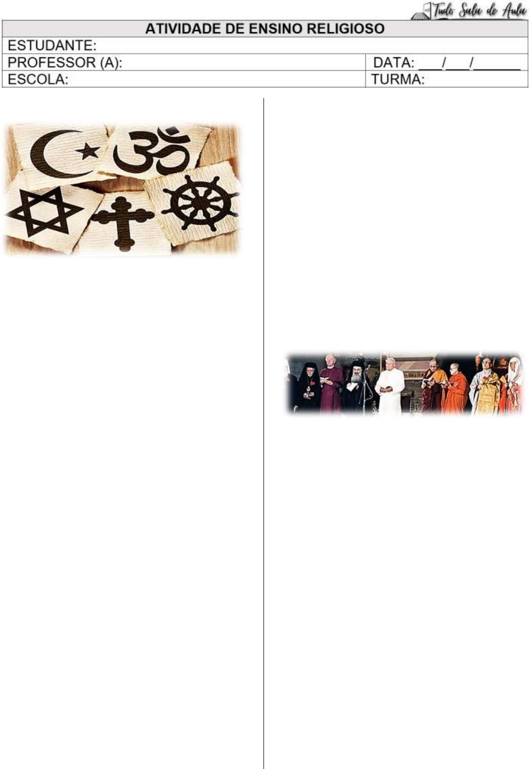 O DIÁLOGO INTER-RELIGIOSO Após o século XX, acentuou-se um processo de grandes transformações no mundo. Assim, a preocupação pela paz entre as grandes nações, a consciência ambiental e a busca pelo diálogo inter-religioso tornaram-se questões amplamente debatidas entre as sociedades. Essas transformações em curso são impulsionadas por dois elementos prementes: o receio de que a humanidade caminhe rumo à sua própria extinção e a crescente interconexão global. Deste modo, cabe a reflexão: como o diálogo inter-religioso pode contribuir para a paz no mundo? A busca pela Paz O diálogo inter-religioso é uma prática fundamental para a construção de uma sociedade mais justa e tolerante. Por meio dele, as diferentes religiões podem se conhecer e estabelecer um diálogo baseado no respeito mútuo, contribuindo para uma convivência pacífica entre seus seguidores. A amizade entre as diferentes religiões é um resultado direto desse diálogo construtivo, uma vez que se estabelece a convicção de que todas as religiões têm algo para contribuir com a construção de um mundo melhor. Dessa forma, o preconceito e a intolerância perdem espaço, permitindo que as pessoas alcancem um nível mais profundo de compreensão do outro, independentemente das crenças que professam. Além do diálogo inter-religioso (ação que promove a boa relação entre todas as religiões), há também outras iniciativas que favorecem a paz entre as pessoas: o Ecumenismo, que busca a aproximação entre as diferentes denominações do Cristianismo e o Diálogo Interconviccional, que busca aproximação com aqueles que não possuem religião definida. Desafios do Diálogo Inter-religioso Estabelecer um diálogo inter-religioso não é uma tarefa fácil, especialmente em um mundo onde muitas vezes se glorifica a própria religião em detrimento das outras. No entanto, é preciso lembrar que a tolerância e o respeito são valores fundamentais para a construção de uma sociedade justa e equilibrada. Nesse sentido, o diálogo inter-religioso é um meio importante para atingir essa meta. Assim, destaca-se que esse diálogo não é somente uma questão de interesse religioso, mas sim, uma questão de interesse geral. Afinal, a amizade entre as diferentes religiões contribui diretamente para a paz, a harmonia e a convivência pacífica entre as pessoas, independentemente de suas crenças. União na Diversidade Ouvir e entender a crença do outro não significa que concordamos com o que está sendo dito, entretanto, é uma oportunidade de coexistirmos e aprendermos juntos, sem perdermos nossa identidade individual. Nenhuma religião tem o monopólio da verdade absoluta, já que o mistério que as envolve é universal. Desse modo, o objetivo do diálogo inter-religioso não é a conversão de pessoas ou a união de todas as crenças em uma só, mas sim a busca por uma convivência pacífica. Texto: Tudo Sala de Aula. ATIVIDADE SOBRE O QUE VOCÊ APRENDEU 1. O diálogo inter-religioso é uma prática que visa promover a compreensão e o respeito mútuo entre diferentes crenças. Assim sendo, o diálogo inter- religioso pode ser definido como a) a ideia de que as diferentes religiões do mundo devem buscar pela supremacia mundial. b) a união de doutrinas e crenças das mais diferentes religiões em uma única fé. c) um intercâmbio respeitoso entre indivíduos e grupos com diferentes crenças religiosas. d) a única forma para promover a paz e a cooperação entre as sociedades no mundo. 2. Os meios de comunicações e transportes quebraram várias fronteiras e permitiram às pessoas conhecerem outras culturas e religiões. Com tanta diversidade religiosa no mundo, há necessidade do diálogo inter-religioso? Justifique sua resposta. _______________________________________ _______________________________________ _______________________________________ _______________________________________ 3. Segundo o texto, após o século XX, acentuou- se um processo de grandes transformações no mundo. Diante dessas transformações, que questões são atualmente debatidas amplamente entre as sociedades? _______________________________________ _______________________________________ _______________________________________ 4. Sabe-se que as religiões orientam a humanidade desde a sua origem. Desse modo, para você, quais compromissos todas as religiões devem assumir atualmente visando a relação pacífica entre as nações? _______________________________________ _______________________________________ _______________________________________ _______________________________________ 5. Assinale as afirmativas em (F) para Falso e (V) para Verdadeiro. a. ( ) O diálogo inter-religioso busca o respeito mutuamente, procurando evitar conflitos com motivação religiosa. b. ( ) Dialogar é abrir espaço para o outro, deixar que pessoas diferentes adentrem nosso território de ideias. c. ( ) As religiões precisam dialogar e se respeitar mutuamente, entretanto, o diálogo inter- religioso não evita conflitos de natureza religiosa. d. ( ) O diálogo inter-religioso é um dos elementos fundamentais mais efetivos para suprir a busca da humanidade pela paz. e. ( ) Demonstrar superioridade de uma religião em relação a outras contribui para um diálogo inter-religioso proveitoso. 6. É um dos objetivos do diálogo inter-religioso a) converter as pessoas a uma determinada religião. b) demonstrar superioridade de uma religião em relação a outras. c) isolar e excluir aqueles que praticam uma religião diferente. d) promover o entendimento e a cooperação entre diferentes religiões. 7. Segundo o texto, em que contribui a amizade entre as diferentes religiões? _______________________________________ _______________________________________ _______________________________________ _______________________________________ 8. Defina com suas palavras as seguintes expressões: a) Ecumenismo. _________________________________