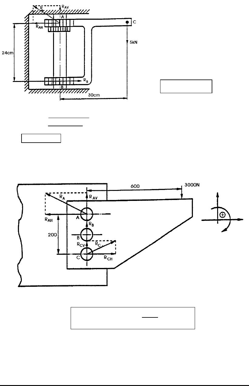SENAI/SC Resistência dos Materiais 20 33..33..11 EExxeerrccíícciiooss RReessoollvviiddooss Ex. 1 O suporte vertical ABC desliza livremente sobre o eixo AB, porém é mantido na posição da figura através de um colar preso no eixo. Desprezando o atrito, determinar as reações em A e B, quando estiver sendo aplicada no ponto C do suporte, uma carga de 5kN. ∑ MA = 0 24 RB = 5 x 30 RB = 6,25 kN ∑ FH = 0 RAH - RB = 6,25 kN ∑ FV = 0 Reação em A: RA = √ R2 AV + R2 AH. RA = √ 52 + 6,252 RA = 8 kN Ex. 2 A figura a seguir, representa uma junta rebitada, composta por rebites de diâmetros iguais. Determinar as forças atuantes nos rebites. Como os diâmetros dos rebites são iguais, na vertical as cargas serão iguais: O rebite B, por estar na posição intermediária, não possui reação na horizontal. O rebite A está sendo "puxado" para a direta, portanto possuirá uma reação horizontal para a esquerda. O rebite C, ao contrário de A, esta sendo "empurrado" para a esquerda, portanto possuirá reação horizontal para a direita. RAV = 5 kN RAV = RB = RCV = 3000 = 1000N 3