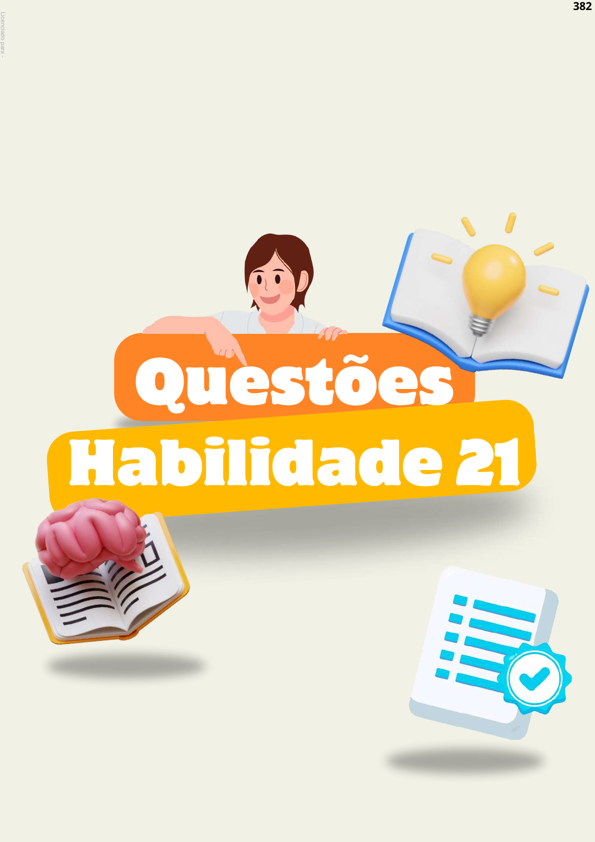 Questões Habilidade 21 382Licenciado para - A rthur P om peu P ereira de M enzes - 05655454343 - P rotegido por E duzz.com 1) Enem 2011 - Questão 01 No mundo árabe, países governados há déca- das por regimes políticos centralizadores contabili- zam metade da população com menos de 30 anos; desses, 56% têm acesso à internet. Sentindo- se sem perspectivas de futuro e diante da estagnação da economia, esses jovens incubam vírus sedentos por modernidade e democracia. Em meados de dezembro, um tunisiano de 26 anos, vendedor de frutas, põe fogo no próprio corpo em protesto por trabalho, justiça e liberdade. Uma série de manifestações eclode na Tunísia e, como uma epidemia, o vírus li- bertário começa a se espalhar pelos países vizinhos, derrubando em seguida o presidente do Egito, Hosni Mubarak. Sites e redes sociais – como o Facebook e o Twitter – ajudaram a mobilizar manifestantes do norte da África a ilhas do Golfo Pérsico. SEQUEIRA, C. D.; VILLAMÉA, L. A epidemia da Liberdade. Istoé Internacional. 2 mar. 2011 (adaptado). Considerando os movimentos políticos mencionados no texto, o acesso à internet permitiu aos jovens árabes A. reforçar a atuação dos regimes políticos existentes. B. tomar conhecimento dos fatos sem se envolver. C. manter o distanciamento necessário à sua segurança. D. disseminar vírus capazes de destruir programas dos computadores. E. difundir ideias revolucionárias que mobilizaram a população. 2) Enem 2012 - Questão 12 Cartaz da Revolução Constitucionalista. Disponível em: http://veja.abril.com.br. Acesso em: 29 jun. 2012. Elaborado pelos partidários da Revolução Cons- titucionalista de 1932, o cartaz apresentado pretendia mobilizar a população paulista contra o governo federal. Essa mobilização utilizou-se de uma referência histórica, associando o processo revolucionário A à experiência francesa, expressa no chamado à luta contra a ditadura. B aos ideais republicanos, indicados no destaque à bandeira paulista. C ao protagonismo das Forças Armadas, representadas pelo militar que empunha a bandeira. D ao bandeirantismo, símbolo paulista apresentado em primeiro plano. E ao papel figurativo de Vargas na política, enfatiza 3) Enem 2013 - Questão 25 Disponível em: http://tv-video-edc.blogspot.com. Acesso em: 30 maio 2010 . A charge revela uma crítica aos meios de comunicação, em especial à internet, porque A questiona a integração das pessoas nas redes virtuais de relacionamento. B considera as relações sociais como menos im- portantes que as virtuais. C enaltece a pretensão do homem de estar em to- dos os lugares ao mesmo tempo. D descreve com precisão as sociedades humanas no mundo globalizado. E concebe a rede de computadores como o espaço mais eficaz para a construção de relações sociais. 383Licenciado para - A rthur P om peu P ereira de M enzes - 05655454343 - P rotegido por E duzz.com 4) Enem 2014 - Questão 41 Em 1961, o presidente De Gaulle apelou com êxito aos recrutas franceses contra o golpe militar dos seus comandados, porque os soldados podiam ouvi-lo em rádios portáteis. Na década de 1970, os discursos do aiatolá Khomeini, líder exilado da futura Revolução Iraniana, eram gravados em fita magnética e prontamente levados para o Irã, copiados e difundidos. HOBSBAWM, E. Era dos extremos: o breve século XX (1914-1991). São Paulo: Cia. das Letras, 1995. Os exemplos mencionados no texto evidenciam um uso dos meios de comunicação identificado na A manipulação da vontade popular. B promoção da mobilização política. C insubordinação das tropas militares. D implantação de governos autoritários. E valorização dos socialmente desfavorecidos. 5) Enem 2015 - Questão 39 Na sociedade contemporânea, onde as relações sociais tendem a reger-se por imagens midiáticas, a imagem de um indivíduo, principalmente na indústria do espetáculo, pode agregar valor econômico na medida de seu incremento técnico: amplitude do espelhamento e da atenção pública. Aparecer é então mais do que ser; o sujeito é famoso porque é falado. Nesse âmbito, a lógica circulatória do mercado, ao mesmo tempo que acena democraticamente para as massas com supostos “ganhos distributivos” (a informação ilimitada, a quebra das supostas hierar- quias culturais), afeta a velha cultura disseminada na esfera pública. A participação nas redes sociais, a obsessão dos selfies, tanto falar e ser falado quanto ser visto são índices do desejo de “espelhamento”. SODRÉ, M. Disponível em: http://alias.estadao.com.br. Acesso em: 9 fev. 2015 (adaptado). A crítica contida no texto sobre a sociedade contemporânea enfatiza A a prática identitária autorreferente. B a dinâmica política democratizante. C a produção instantânea de notícias. D os processos difusores de informações. E os mecanismos de convergência tecnológica. 6) Enem 2016 - Questão 15 Hoje, a indústria cultural assumiu a herança civilizatória da democracia de pioneiros e empre- sários, que tampouco desenvolvera uma fineza de sentido para os desvios espirituais. Todos são livres para dançar e para se divertir, do mesmo modo que, desde a neutralização histórica da religião, são livres para entrar em qualquer uma das inúmeras seitas. Mas a liberdade de escolha da ideologia, que reflete sempre a coerção econômica, revela-se em todos os setores como a liberdade de escolher o que é sem- pre a mesma coisa. ADORNO, T; HORKHEIMER, M. Dialética do esclarecimento: fragmentos filosóficos. Rio de Janeiro: Zahar, 1985. A liberdade de escolha na civilização ocidental, de acordo com a análise do texto, é um(a) A legado social. B patrimônio político. C produto da moralidade. D conquista da humanidade. E ilusão da contemporaneidade. 7) Enem 2016 - Questão 42 Não estou mais pensando como costumava pensar. Percebo isso de modo mais acentuado quando estou lendo. Mergulhar num livro, ou num longo artigo, co