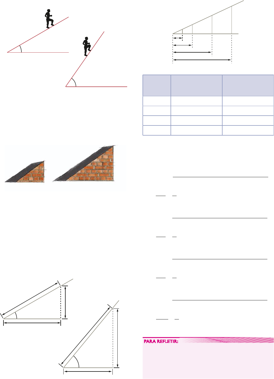 1. INTRODUÇÃO Observe uma pessoa que sobe 2 tipos de rampa. subida 30¡ subida 55¡ Dizemos que a segunda rampa é mais íngreme ou tem aclive maior, pois a medida de abertura do ângulo de subida é maior (558 . 308). Vejamos agora a seguinte situação-problema. Sem conhecer as medidas de abertura dos ângulos de subida, como saber qual das 2 rampas abaixo é a mais íngreme? 4 m 7 m 5 m 3 m Situações como essa, que envolvem medidas de comprimento dos lados e medidas de abertura dos ângulos de um triângulo, podem ser resolvidas com o estudo da Trigonometria. Faça a leitura do texto Trigo- nometria: história e importância, na página 364. 2. ÍNDICE DE SUBIDA Para cada ponto P alcançado na subida, temos as medidas de comprimento de um percurso, um afasta- mento e uma altura. Veja os exemplos. percurso afastamento altura P percurso afastamento altura P Il u s tr a ç õ e s : B a n c o d e i m a g e n s /A rq u iv o d a e d it o ra Observe a rampa e a tabela a seguir. 2 m 4 m 8 m 12 m 1 m 2 m 4 m 6 m A B C D Ponto Medida de comprimento do afastamento Medida de comprimento da altura A 2 m 1 m B 4 m 2 m C 8 m 4 m D 12 m 6 m Para cada um dos pontos, a razão entre as medidas de comprimento da altura e do afastamento corres- pondente é dada por: 5 5ponto : medida de comprimento da altura medida de comprimento do afastamento A 5 5 1m 2 m 1 2 5 5Bponto : medida de comprimento da altura medida de comprimento do afastamento 5 5 2 m 4 m 1 2 5 5Cponto : medida de comprimento da altura medida de comprimento do afastamento 5 5 4 m 8 m 1 2 5 5Dponto : medida de comprimento da altura medida de comprimento do afastamento 5 5 6 m 12 m 1 2 PARA REFLETIR: A proporcionalidade das medidas de comprimento é decorrente da semelhança dos triângulos retângulos. Comprove construindo a figura com as medidas de com- primento em centímetros e conservando a medida de abertura do ângulo de subida. M a u ro N a k a ta / A rq u iv o d a e d it o ra CAPêTULO 11 • TRIGONOMETRIA NO TRIÂNGULO RETÂNGULO 347 Contexto e Aplicacoes Matematica_U5_C11_346a373.indd 347 8/22/18 2:27 PM Note que a razão entre as medidas de comprimen- to da altura e do afastamento, para cada ponto de uma mesma subida, é uma constante (é sempre a mesma). No exemplo dado, essa constante é 1 2 e a ela damos o nome índice de subida. 5índice de subida medida de comprimento da altura medida de comprimento do afastamento Na figura abaixo, por exemplo, o índice de subida da rampa é 2 3 , isto é, a cada 3 unidades que nos afas- tamos, elevamo-nos 2 unidades. 3 2 4 6 6 9 A B C PARA REFLETIR: • Como devem ser as medidas de comprimento da altura e do afastamento para que o índice de subida seja 1? • E maior do que 1? 1. Que subida é mais íngreme: uma com índice 1 ou outra com índice 1 3 ? PARA REFLETIR: Dadas 2 subidas, qual é a mais íngreme: a de índice de subida maior ou menor? 2. Para determinada rampa, temos os dados da ta- bela abaixo. Complete a tabela e calcule o índice de subida. Ponto Medida de comprimento do afastamento Medida de comprimento da altura A 4 m 8 m B 4 m C 1 m D 6 m E 5 m F 10 m 3. Desenhe uma rampa com índice de subida igual a 3 2 . 4. Em uma subida de índice igual a 1 2 , se nos afas- tarmos 50 m, então a quantos metros nos eleva- remos do chão? 5. Em uma subida de índice igual a 2 5 , se nos ele- varmos a uma altura de medida de comprimento de 4 m, então qual será a medida de comprimen- to do afastamento correspondente? 6. Em construção civil, o índice de subida é muito usado para fazer referências às inclinações de telhados, calhas, rampas, ruas e rodovias. Em vez de utilizar o termo índice de subida, na cons- trução civil usa-se inclinação. Assim, um telhado com índice de subida de 0,15 é um telhado com inclinação de 15%; uma rampa com índice de subida de 1 2 é uma rampa com inclinação de 50%. Considere o seguinte telhado, cuja vista frontal é um triângulo isósceles de base de medida de comprimento de 8 m. Se a inclinação do telhado é de 15%, então qual é a medida de comprimen- to h da altura desse telhado? 8 m h RELACIONANDO A MEDIDA DE ABERTURA DO ÂNGULO DE SUBIDA E O ÍNDICE DE SUBIDA Até agora, verificamos o quanto uma subida é ín- greme usando a medida de abertura do ângulo de su- bida ou, então, o índice de subida. a a 1 h 1 b a 2 h 2 • Quanto maior a medida de abertura do ângulo de subida, mais íngreme é a subida. • Quanto maior o índice de subida, mais íngreme é a subida. Será que podemos associar esses 2 coeficientes em uma mesma subida? É o que veremos a seguir. PARA REFLETIR: Relacione com ., , ou 5 as medidas de abertura a e b dos ângulos e as razões h a e h a 1 1 2 2 das figuras acima. EXERCÍCIOS Il u s tr a ç õ e s : B a n c o d e i m a g e n s /A rq u iv o d a e d it o ra UNIDADE 5 • GEOMETRIA PLANA E TRIGONOMETRIA NO TRIÂNGULO RETÂNGULO348 Contexto e Aplicacoes Matematica_U5_C11_346a373.indd 348 8/22/18 2:27 PM 3. A IDEIA DE TANGENTE Usaremos a palavra tangente para associar a me- dida de abertura do ângulo de subida e o índice na mesma subida. A tangente da medida de abertura do ângulo de subida é igual ao índice de subida associado a ela e será indicada por k 1 . a afastamento altura tangente da medida de abertura de um ângulo de subida 5 k 1 tan a 5 k 1 tan a 5 medida da altura medida do afastamento 5 índice de subida Temos agora condições de resolver a situação-pro- blema apresentada no início deste capítulo. Vamos retomar as 2 figuras e depois construir os modelos matemáticos delas, que são 2 triângulos re- tângulos. 4 m 7 m 5 m 3 m 3 4 a 7 5 b • Índice de subida da primeira figura: tan a 5 3 4 • Índice de subida da segunda figura: tan b 5 5 7 Como . 3 4 5 7 , a primeira subida é a mais íngreme. PARA REFLETIR: Podemos concluir que . 3 4 5 7 reduzindo as 2 frações ao mesmo denominador ou transformando-as em decimais. M a u ro N a k a ta /A rq u iv o d a e d it o ra OBSERVAÇÃO: Al