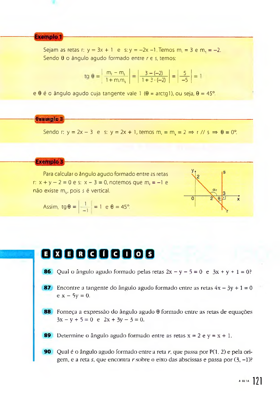 Sejam as retas r: y = 3x + 1 e s: y = -2x -1 Temos m, = 3 e m, = -2. Sendo 0 o ângulo agudo formado entre r e s, temos: | mr - ms 3 - (-2) 5 | 1 + m,m5 1 + 3 ■ (-2) -5 e 8 é o ângulo agudo cuja tangente vale 1 (8 = arctgl), ou seja, 8 = 45° Sendo r: y = 2x - 3 e s: y = 2x + 1, temos m, = ms = 2 => r // s => 8 = 0°. Para calcular o ângulo agudo formado entre e s retas r: x + y - 2 = 0 e s : x - 3 = 0, notemos que m, = -1 e não existe m5, pois s é vertical. Assim, tg8 = 1-1 = 1 e 8 = 45° 86 Qual o ângulo agudo formado pelas retas 2x - y - 5 = 0 e 3x + y + I = 0? 87 Encontre a tangente do ângulo agudo formado entre as retas 4x - 3y + 1 = 0 e x - 5y = 0. 88 Forneça a expressão do ângulo agudo 0 formado entre as retas de equações 3x - y + 5 = 0 e 2x + 3y - 3 = 0. 89 Determine o ângulo agudo formado entre as retas x = 2 e y = x + 1. 90 Qual é o ângulo agudo formado entre a reta r, que passa por P(1. 2) e pela origem, e a reta s, que encontra /-sobre o eixo das abscissas e passa por (3, -1)? A Kb 1A 121 91 Conduza pela origem as retas que formam ângulo de 45° com r: 6x + 2y - 3 = 0. 92 Dados os pontos A(4, -1), B(2, -1) e 0,5 + yj3 . ^3 ). determine os ângulos internos do triângulo ABC. 93 São dados os pontos A(3, 0), B(10, 1) e M(6, k). Determine os valores de k para os quais o ângulo BA.Vl mede 45c. 94 (ESPM-SP) Qual é o maior ângulo, em radianos, formado pelas diagonais do quadrilátero ABCD?Dados: A(5, 5): B(5, -4); C(2, -4); D(2, 2). O Distância entre ponto e reta A primeira aplicação importante de perpendicüaridade é a pesquisa sobre a distância entre um ponto e uma reta, muito útil para a determinação de alturas de triângulos e retas tangentes a circunferências. Mas há muitas outras aplicações. A distância entre um ponto e uma reta nada mais é que uma distância entre dois pontos: o ponto dado e o pé da perpendicular à reta dada, conduzida pelo ponto dado. Assim, dados P e r : dK , = d De posse da equação de r é possível encontrar a equação de s _L r, s passando por P. Interceptando r e s, obtemos Q; basta encontrar a distância entre P e O . e o problema se resolve. Adotando r: ax + by + c = 0 e P(x0, y0) como a reta e o ponto em questão e seguindo, , , |axQ + by0 + c|o processo descrito acima, chegamos a dP , = - — — —L .Va2 + b2 Esta é a expressão usada para se obter a distância de um ponto a uma reta. Devemos ter sempre dP , 5* 0. M - M L M A I I C A : T iÊ M C lA t A PI IC A Ç O C S Exemplo 1 Sejam P(2,3) e r: 3x - 4y + 1 = 0. Para achar a distância entre eles, basta substituir as coordenadas de P na equação geral de r e os coeficientes a e b no radicando: 3 • 2 - 4 ■ 3 + 1dt , = — = ^ -W + M F = -£-=* d fi r = 1 Exemplo 2 Dados os vértices de um triângulo ABC: A(l, 1), B(3, 3) e C(0, 4), para achar o compri mento da altura hc, relativa ao lado AB, determinamos inicialmente a reta suporte do lado AB: é a primeira bissetriz, que possui equação x - y = 0. Só falta achar a distância entre C e ela: d = hc 1 • 0 - 1 • 4 + 0 _ 4Vl2 + H ) ? ” V2 I □ t-DQOQO 95 Encontre a distância entre o ponto P e a reta r, em cada caso:a) P(2. 3) e r: 5x + 12y - 7 = 0 c) PCI, 11) e r: 4x - y + 7 = 0b) PC5. -4) e r: 3x + 4y + 6 = 0 d) PC2, —3) er: y = 5x + 13 96 (PUC-SP) Determine a distância do ponto 0(1, 1) à reta /.cuja equação é x + y - 3 = 0. 97 Dados os pontos A(2, 5). B(3, -1) e C(6. 0). encontre a altura relativa ao lado BC do triângulo ABC. 98 Determine o comprimento da altura relativa ao lado BC do triângulo ABC, sendo A<—3. 0). B(6. 8) e C a origem do sistema cartesiano. 99 (UF-CE) Considere o triângulo cujos vértices são os pontos A(2, 0), B(0, 4) e CÍ2^5 ,4 + -y5 )• Determine a medida da altura relativa ao lado AB. A R IT A 123