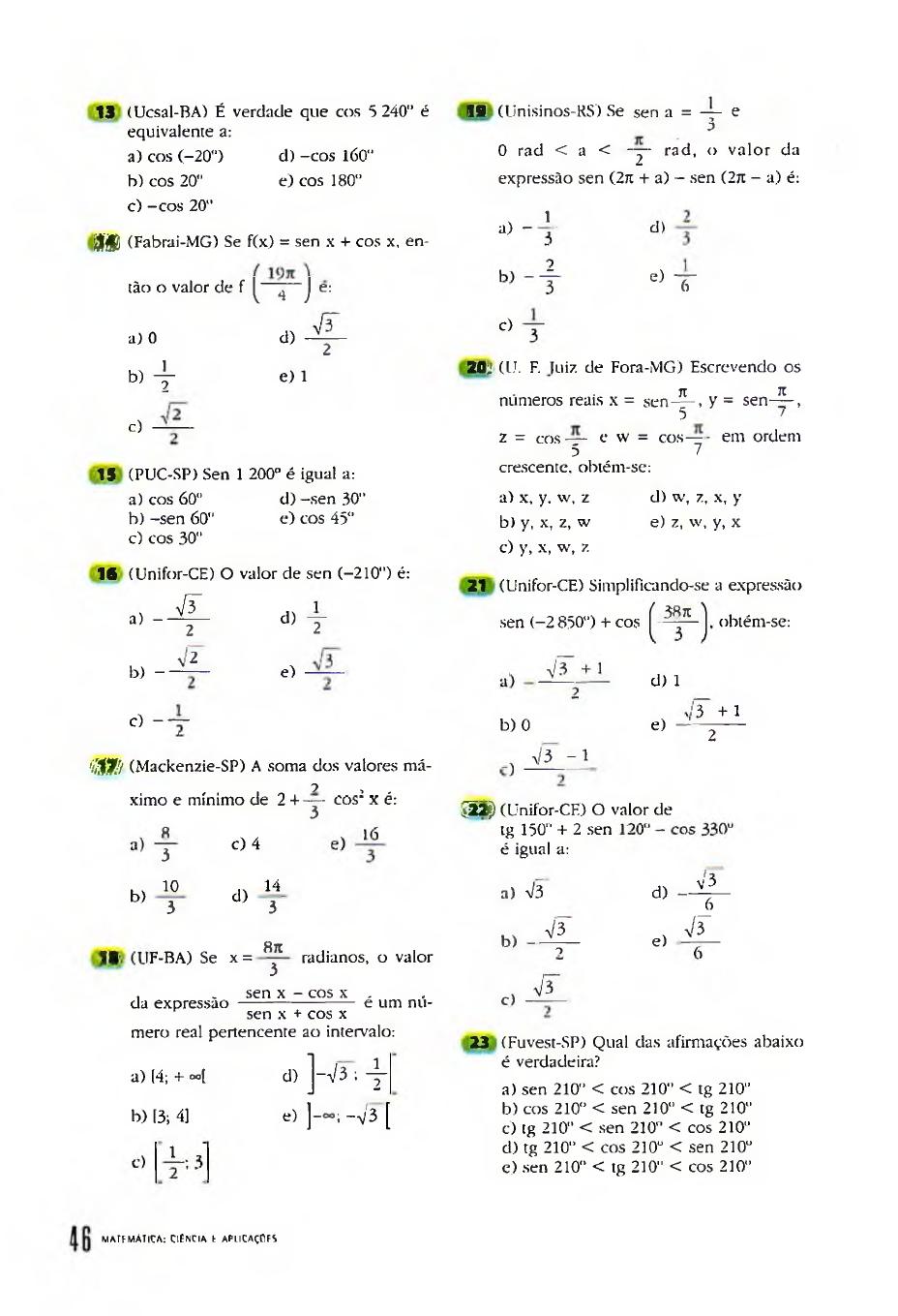 13 (Ucsal-BA) É verdade que cos 5 240" é equivalente a:a) cos ( - 20°) d) -co s 160"b) cos 20" e) cos 180"c) -c o s 20" m (Fabrai-MG) Se f(x) = sen x + cos x, en- c) 13? (PUC-SP) Sen 1 200° é igual a:a) cos 60" d) -sen 30"b) -sen 60" e) cos 45"c) cos 30" 16 (Unifor-CE) O valor de sen (-210") é:a) - b) - VL2 y[2 d ) Te) c) - ~ m (Mackenzie-SP) A soma dos valores má? , ,ximo e mínimo de 2 + -y- cos' x é: na (Unisinos-KS) Se sen a = — e30 rad < a < -y - rad, o valor da expressão sen (2n + a) - sen (2ti - a) é: 1a) - tão o valor de f ^ 4 J e: c)a) 0 d) 2 b) 4 " e) 1 20 (U e) t 30} (LJ. F. Juiz de Fora-MG) Escrevendo os - ■ K 7Cnúmeros reais x = sen— , y = sen— , 5z = c o s— e w = cos— - em ordem 5 7crescente, obtém-se:a) x, y. w, z d) w, z, x, yb) y, x, z, w e) z, w, y, xc) y, x, w, z 21) (Unifor-CE) Simplificando-se a expressão 38 TCsen (-2 850") + cos CM obtém-se: b) 0 e) ;'3 +1 2 y/3 -1 5 2 ) (Unifor-CE) O valor de8 c) 4 tg 150" + 2 sen3 é igual a:103 d) 143 a) x/3 F-BA) Se X = 8lt: 3 radianos, o valor » - ^ b) . . sen x - cos x . .da expressão --------------------- e um nu-sen x + cos xmero real pertencente ao intervalo: d) - e) V3_ 6 V T C) a) (4; + ~[b) [3; 4] 1 d) ]-V 3 ; - ye) ]— ; - v T [ 23) (Fuvest-SP) Qual das afirmações abaixo é verdadeira?a) sen 210" < cos 210" < tg 210"b) cos 210" < sen 210" < tg 210"c) tg 210" < sen 210" < cos 210"d) tg 210" < cos 210" < sen 210"e) sen 210" < tg 210" < cos 210" m a t f m à T ic A : C iê n c ia t a p l ic a ç Of S I ÜJF.-CE) Se n = 1 II , f , , 71 ) K, .sen-r- + | 1 + sen----cos , - 2 6 v 3 ) 6 1 7t ( , , n J 7t—— c o s — 1 + sen - Lsen-^- 2 6 V 3 / oentão n ’+ 1 é igual a: a) 2 c ) 4 h) d) 19 3 3 (25 (UF-RS) Se 0 = 83", então:a) tan 0 < cos 0 < sen 0.b) sen 0 < cos 0 < tan 0.c) cos 0 < sen 0 < tan 0.d) sen 0 < tan 0 < cos 0.e) cos 0 < tan 0 < sen 0. BB (liF-AL) A expressão1 + sen 300° ̂ igual a:tg 340° + cos(—120°) V3a) h) c) (Unifor-CE) Se cos 3 y3 4 2 - v'3 d) 2 + V3 e) - 2 + v'3 ■tíx + - y j = a, entãoo valor de sen (37t + x) é:a) -a b) - - d) e) a c) -V a J - 1 ■ I (Cesgranrio-RJ) Se ü < a < Jt_ 2 '— < b < it e sen a = sen b = então a + b vale: (PUC-RS) Se a 6 | 0; ■ * ■ | e se y = log sen a + log tan - a j , então y está necessariamente no intervalo: a) (0; 1) d) (0; 2) b> I o--4 e) ( - 1; 1)c) ( -~ i 0) 30 (FF.I-SP) A sequência de valores: 7t 71 7t 71sen——, sen— . sen — ...... sen— .2 3 ̂ na) é estritamente crescente.b) é estritamente decrescente.c) possui valores negativos.d) possui valores iguais.e) é uma progressão aritmética. m (Cesgranrio-RJ) Sendo 7 cos (Sn: - x) - 3 cos(37t + x)A - 8 sen í-^-----x j 71com x & — + l<7t. k 6 Z , então:a) A = - lb) 2A = Ic) 2A + 1 = 0d) 4A + 3 = Ue) 5A - i = 0 (F. Objetivo-AM) A sequência (sen X : cos x; 1 — sen X ; . . . ) é uma progressãoaritmética e 0 s x í — . O décimo ler.2mo dessa sequência é:, v'3 + 3 9 - 8y3:i> ------ — d)2 S + 4 2 7 - v '3 a) Jt c) 4 ~ e) — 5 2 C ) 2 b) 3n d ) 471 c)2 3 2 ILINÇllfN CiR riH AR tS (U F - A .M ) Se 3 sen" x + 2 cos: x com 0 < x < J L , então:i 114 ' 35) (Funrei-MG) Se existe um ângulo .v tal quesen x = --------- Jm - 2 e'm - 1 a) b) c) d) e) sen x = sen x = sen x = sen x sen x = 1 tg x = V m - 2 ,— C COS X = -------2 2 então a soma de todos os valores possí-veis de m é igual a:\3 1e cos x = — a) 4 b) 6 c) 5 d) 7 e) 32 4 - 2] 36 (U. E. Londrina-PR) A função dada porcos x = — f(x) = (tg x) ■ (cotg x) está definida se, esomente se:1 \3 ----- e cos x = --------- a) x é um número real qualquer. 2 7 b) x * 2ktt, sendo k £ Z . $ 1c cos x = ------ c) x * ktt, sendo k £ Z .2 2 d) x * krt i sendo k £ Z . 4 341 (UF-MT) Considere a circunferência trigonométrica abaixo. A alternativa que indica o segmento cujo módulo é igual a sec a é:a) Õ B c) Õ G e) Õ1b) Õ D d) ÕH e) x * ----- , sendo k £ Z .4 37) (Fuvest-SP) Numa circunferência, c, é o comprimento de arco de — radianos e c, é o comprimento da secante determinada por este arco, como ilustrado na figura abaixo. Então, a razão c,/c, é iguala -7- multiplicado por:a) 2 1 Um relógio foi acertado exatamente ao meio-dia. Determine o horário que estará marcando esse relógio após o ponteiro menor ter percorrido um ângu lo de 73”. 2 Um pequeno animal caminha em uma vala circular de 64 cm de raio. Na primei ra hora percorre 1 m e, a partir da segunda hora, metade da distância percorrida M A ltM Á T irA : CIÊNCIA f APtlCAÇÕFS
