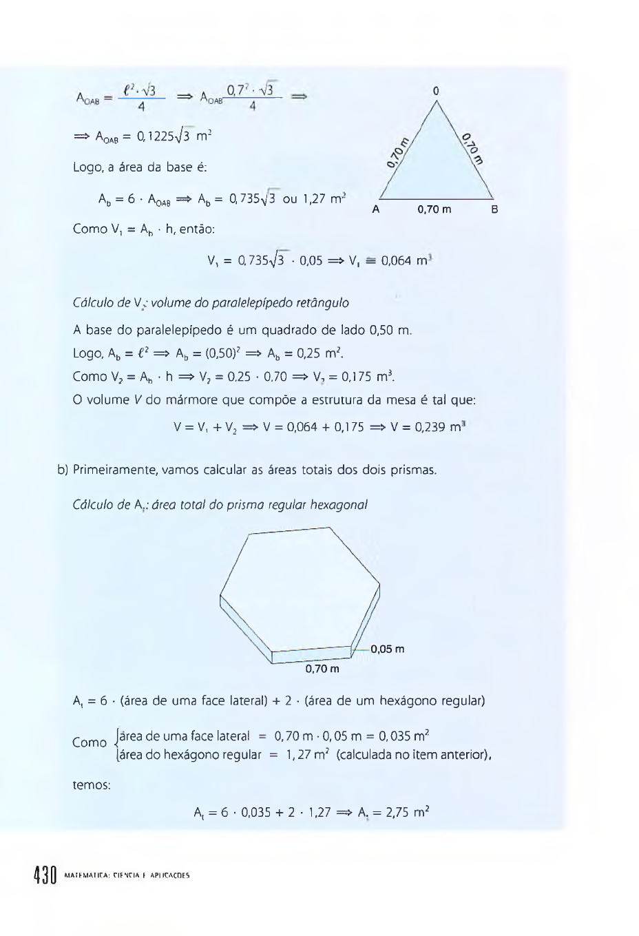 => Aoab = 0,1225^3 m2 Logo, a área da base é: Ab = 6 • Aoab =*• Ab = 0,735V3 ou 1,27 nrv A 0,70 m B Como V, = Ab • h, então: V, = 0,735^3 ■ 0,05 => V, = 0,064 m Cálculo de VÇ volume do paralelepípedo retângulo A base do paralelepípedo é um quadrado de lado 0,50 m. Logo, Ab = e => Ab = (0,50)J => Ab = 0,25 m2. Como V? = Ah • h => V7 = 0.25 ■ 0,70 => V, = 0,175 mB. O volume V do mármore que compõe a estrutura da mesa é tal que: b) Primeiramente, vamos calcular as áreas totais dos dois prismas. Cálculo de A.: área total do prisma regular hexagonal A, = 6 ■ (área de uma face lateral) + 2 ■ (área de um hexágono regular) Como Jarea de uma face lateral = 0,70 m • 0,05 m = 0,035 m2 [área do hexágono regular = 1,27m2 (calculada no item anterior), temos: V = V, + V2 => V = 0,064 + 0,175 => V = 0,239 m: 0,70 m 0,05 m A, = 6 • 0,035 + 2 ■ 1,27 => A. = 2,75 rrv7430 MAIhMATICA: CIFMCIA f APIIÇACQES Cálculo de A',: área total do paralelepípedo retângulo Lembremos que: A', = 4 ■ (área de uma face lateral) + 2 - (área de um quadrado) Temos: A', = 4 • (0,50 ■ 0,70) + 2 ■ (0,50)2 A', = 1,90 m2 Logo, a área total a ser impermeabilizada é: A, + A', = 4,65 m2 Se o fabricante cobra R$ 20,00 para aplicar a resina em uma superfície de 1 nrv, então a quantia a ser paga pela aplicação nas superfí cies dos prismas é: 4,65 • 20 = 93 reais 20 Calcule a área lateral, a área total e o volume de cada um dos prismas, cujas medidas estão indicadas nas figuras abaixo.a) prisma reto b) prisma regular c) prisma oblíquo(triangular) (hexagonal) (base quadrada) PKlSMA 21 Represente, por meio de expressões algébricas, a área lateral, a área total e o volume de cada um dos prismas, cujas medidas estão indicadas nas figuras abaixo.a) prisma regular (triangular) 2a b) prisma regular (hexagonal) c) prisma reto (triangular) 22 A base de um prisma de 10 cm de altura é um triângulo retângulo isósceles de 6 cm de hipotenusa. Calcule a área lateral e o volume do prisma. 23 Determine a área lateral e o volume de um prisma reto de 25 cm de altura, cuja base é um hexágono regular de apótema W 3 cm. 24 Determine a aresta da base de um prisma triangular regular, sendo seu volume 8 m* e sua altura 80 cm. 25 Um prisma reto tem por base um hexágono regular. Qual é o lado do hexágono e a altura do prisma, sabendo-se que o volume é de 4 m' e a superfície lateral de 12 m2? 26 Um fazendeiro vende 1 litro de leite em uma embalagem de papelão que tem a forma de um prisma reto de base quadrada, com dimensões 7 cm,7 cm e 21 cm. Ele pretende vender outro tipo de leite numa nova embalagem, que tem a forma de um prisma reto, cuja base é um triângu lo isósceles de 32 cm de perímetro e cujos lados iguais medem 10 cm.a) Qual deve ser a altura da nova embalagem para que ela tenha o mesmo volume da primeira?b) Na fabricação de qual das duas embalagens será usada uma menor quantidade de papelão? De quanto será a diferença? MATEMÁTICA: ClÊNClA E APUCAC^FS