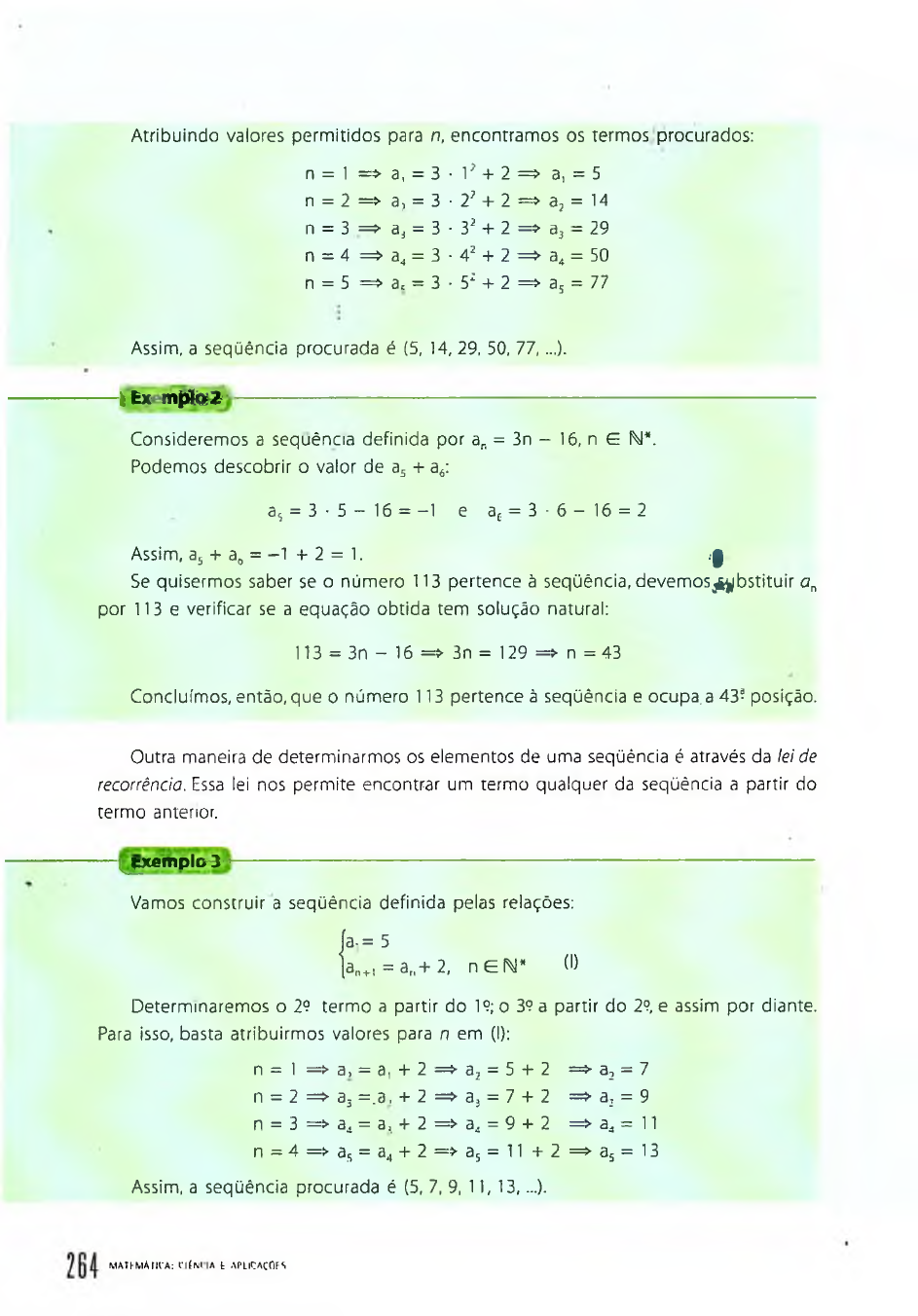 Atribuindo valores permitidos para n, encontramos os termos procurados: n = 1 => a, = 3 • 1* + 2 => a, = 5 n = 2 = > a , = 3 - 2 ’ + 2 = > a , = 14 n = 3 => a3 = 3 ■ 3J + 2 = * a3 = 29 n = 4 => a4 = 3 ■ 42 + 2 => a4 = 50 n = 5 => at = 3 • 5: + 2 => a5 = 77 Assim, a seqüência procurada é (5, 14, 29, 50, 77 ,...). — |fc x mjpta Z ----------------------------------------------------------------------------------------- Consideremos a sequência definida por ar, = 3n - 16, n G N*. Podemos descobrir o valor de a5 + a6: a5 = 3 ■ 5 - 16 = -1 e ac = 3 - 6 - 1 6 = 2 Assim, a5 + a„ = -1 + 2 = 1. J Se quisermos saber se o número 113 pertence à seqüência, devem os^ bstitu ir on por 113 e verificar se a equação obtida tem solução natural: 113 = 3n - 16 => 3n = 129 =► n = 43 Concluímos, então, que o número 113 pertence à seqüência e ocupa, a 43! posição. Outra maneira de determinarmos os elementos de uma seqüência é através da lei de recorrência. Essa lei nos permite encontrar um termo qualquer da seqüência a partir do termo anterior. y ic e m p l& ja ----------------------------------------------------------------------------------------- Vamos construir a seqüência definida pelas relações: |a -= 5 (an+, = a „+ 2 , n £ M * ^ Determinaremos o 29 termo a partir do 19; o 3? a partir do 29, e assim por diante. Para isso, basta atribuirmos valores para n em (I): n = 1 => a, = a, + 2 => a2 = 5 + 2 => a2 = 7 n = 2 => a3 = .a , + 2 = > a 3 = 7 + 2 => a: = 9 n = 3 = > a i = a, + 2 = > a 4 = 9 + 2 => a„ = 11 n = 4 => a5 = a4 + 2 => a5 = 11 + 2 => a5 = 13 Assim, a seqüência procurada é (5, 7, 9, 11, 13,...). M AThM AnCA : CIÉNLIA fc APLlÇAÇfiFS Q O G O B O G O Q Q 1 Determine os seis primeiros termos da sequência definida por an = 1 + 2n. n G N*. 2 3 4 5 6 7 8 9 10 11 Escreva os cinco primeiros termos da sequência definida por an = 2" — 1, n G N*.Determine os oito primeiros lermos da seqüência definida por an = —— , n G N*.Qual o 9? termo da seqüência definida por an = 3n2- 2n+ 1, n G W*?A respeito da seqüência definida por an = 2n + 7. para n G bJ*, determine: a) o 20? termo; b) a soma de seus cinco primeiros termos.Seja a seqüência definida por an = -35 + 4n. n G M*. Verifique se os números a seguir pertencem a ela. Em caso afirmativo, dê também as posições deles na seqüência.a ) - I I b) 30 c) 65Seja a seqüência definida por an = ( - l) n + 3, n G M e n í 1.a) Escreva seus dez prüneiros termos.b) Qual o seu 100? termo?Construa a seqüência definida por:fa, = -3 ̂an + i — an .4" i n G N e n 3= 1 Construa a seqüência definida por: j a , = -2 [a„ , i = 2 + a ; n G Fy e n 1 Determine o 5? termo da seqüência definida pela seguinte relação de recorrência: í a t = 2 *n G N ’ Determine os dez primeiros termos da seqüência definida por:f a | = 1; a j — 1 [ an + i an + i 4" an; n G f̂ J PR m R FSSO tS 12 Temos duas sequências úr„) e (b a), definidas, para n E IN e n 1, por an = -8 + 5n e b„ = 51 - 2n.a) Verifique se o número 47 pertence a essas sequências.b) A partir d», que termo os elementos da seqüência a v são maiores que os da sequência i>n? 13 (Covest-PE) Sobre os números da seqüência an = n’ - n. n E N*. analise as seguintes afirmações:a) São múltiplos de 3. c) Não são primos.b) Não podem ser múltiplos de 7. 14 (UE-RN) Uma pessoa que pesa 140 quilos submete-se a um regime alimentar, ohtendo o seguinte resultado: nas quatro primeiras semanas, perde 3 quilos por semana; nas quatro seguintes, 2 quilos por semana: daí em diante, apenas 1/2 quilo por semana.Calcule em quantas semanas a pessoa estará pesando:a) 122 quilos. b) 72 quilos. O Progressões Aritméticas Introdução Observe a seguinte seqüência: (4, 7, 10, 13, 16, 19,...) Notemos que a diferença entre um termo qualquer dessa seqüência e seu antecedente é sempre igual a 3: 7 - 4 = 3; 1 0 - 7 = 3; 1 3 - 1 0 = 3; 16 - 13 = 3; 19 - 16 = 3; ... Podemos observar ainda que, considerando três termos consecutivos da seqüência, o termo central é dado pela média aritmética entre os outros dois termos: (a„ a„ a ,); % (a2, a,, a j ; z (a-., a.., a5) ü (4, 7, 10) (7, 10, 13) (10, 13, 16) lemos: 7 = 4 + 10 2 10 7 + 13 2 13 = 10 + 16 2 M ATFMATICA: Ç IÍN C IA F APLitAÇÜ LS