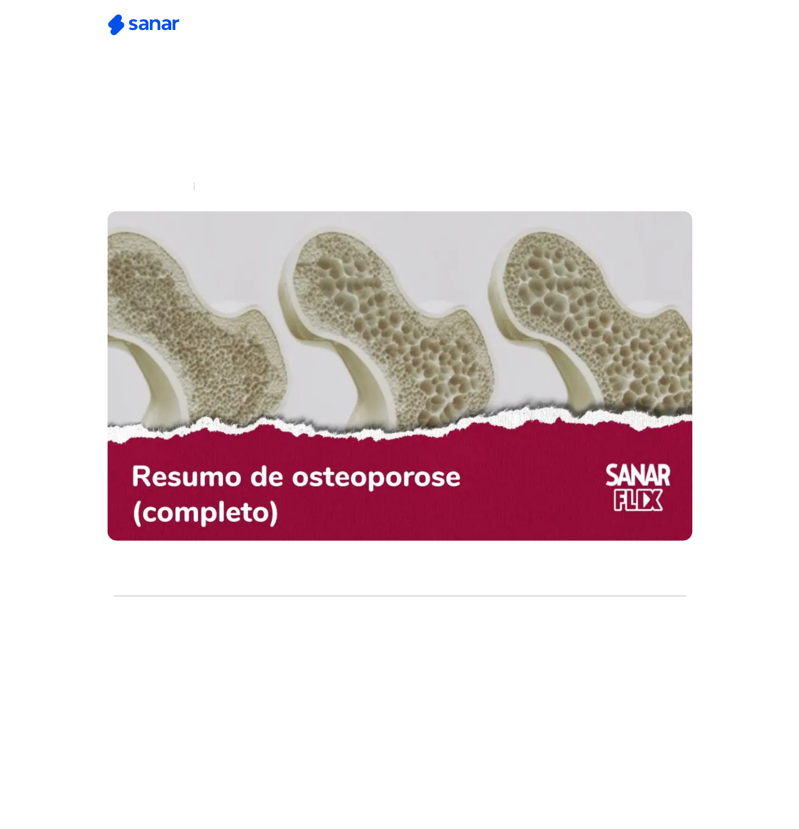 Home > Ciclos da Medicina > Ciclo Básico > Resumo de osteoporose: epidemiologia, fisiopatologia, quadro clínico, diagnóstico e tratamento – Sanarflix Resumo de osteoporose: epidemiologia, fisiopatologia, quadro clínico, diagnóstico e tratamento – Sanarflix Redação Sanar 31/08/2020 Índice 1. Definição 2. Epidemiologia 3. Fisiopatologia do osteoporose 4. Quadro clínico da osteoporose 5. Diagnóstico de osteoporose 6. Tratamento de osteoporose 7. Mapa mental 7.1. Posts relacionados: Definição A osteoporose é uma condição clínica caracterizada por perda progressiva de massa óssea e deterioração da microarquitetura do tecido ósseo, sendo a principal causa de fraturas na população acima de 50 anos. É uma doença silenciosa que afeta especialmente as mulheres na pós-menopausa e idosos e tem elevada taxa de morbimortalidade. O principal objetivo no diagnóstico e tratamento precoce é a prevenção das fraturas. Epidemiologia A osteoporose e afeta mais de 200 milhões de pessoas em todo o mundo e é uma das principais causas de morbidade e mortalidade em idosos. Ocorre mais comumente em mulheres na pós- menopausa. Estima-se que cerca de 50% das mulheres e 20% dos homens com idade igual ou superior a 50 anos sofrerão uma fratura osteoporótica ao longo da vida. https://sanarmed.com/ https://sanarmed.com/category/ciclos-da-medicina/ https://sanarmed.com/category/ciclos-da-medicina/ciclo-basico/ https://sanarmed.com/author/sanar/ https://sanarmed.com/ Há morbimortalidade acentuada associada às fraturas em pessoas com idade avançada, principalmente de quadril. Aproximadamente 5% desses indivíduos que apresentam fratura morrem durante a internação hospitalar, 12% morrem nos 3 meses subsequentes e 20% morrem no ano seguinte ao da fratura, conforme dados norte-americanos. No Brasil, são escassos os dados precisos sobre a prevalência da osteoporose e incidência de quedas e fraturas, assim como sobre custos relacionados a esses eventos. Estimativas revelam que a população brasileira propensa a desenvolver osteoporose aumentou de 7,5 milhões, em 1980, para 15 milhões, em 2000. Outros fatores de riscos incluem hipogonadismo, terapia com glicocorticóides, doenças gastrointestinais, de�ciência de vitamina D, terapia com drogas anticonvulsivantes, hipercalciúria e abuso de álcool. Fisiopatologia do osteoporose A característica óssea de indivíduos com osteoporose incluem tamanho ósseo pequeno, microarquitetura desfavorável (por exemplo, comprimento aumentado do colo femoral), microarquitetura rompida e porosidade cortical. Indivíduo normal (painel esquerdo) e um paciente com osteoporose (painel direito). Fonte: UptoDate Indivíduo normal (painel esquerdo) e um paciente com osteoporose (painel direito). Outro aspecto importante na osteoporose é a viabilidade diminuída de osteócitos. Essas células são antigos osteoblastos enterrados dentro osso mineralizado que sente e responde a mudanças nas forças mecânicas. Com a depleção dessas células, o osso vai perdendo sua capacidade de ganhar resistência. A obtenção do pico de massa óssea varia de acordo com o gênero, etnia, tamanho do corpo e região óssea. Em meninas saudáveis, o período de pico de acúmulo de massa óssea ocorre entre as idades de 11 e 14 anos. A perda óssea começa antes da menopausa, conforme ilustrado por vários estudos prospectivos que relataram vários graus de perda óssea durante a transição da menopausa, mais frequentemente em mulheres com distúrbios de ovulação subclínicos ou sintomas da perimenopausa. Nos homens, o pico da densidade óssea espinhal é alcançado em aproximadamente 20 anos, enquanto o pico da densidade do rádio e diá�se femoral é alcançado um pouco mais tarde perdem aproximadamente 30% do osso trabecular e 20% do osso cortical durante a vida. A perda óssea trabecular parece começar na vida adulta jovem, enquanto a perda óssea cortical é menos pronunciada ou começa mais tarde na vida. No entanto, a perda da densidade óssea é menos acentuada nos homens. Os hormônios desempenham papel fundamental na patogênese da osteoporose, por isso mulheres pós-menopausa são grupo de risco. Os estrogênios e androgênios diminuem a reabsorção óssea, restringem a taxa de remodelação óssea e ajudam a manter um equilíbrio focal entre a formação e reabsorção óssea. Esses efeitos são o resultado de in�uências hormonais na taxa de nascimento de osteoclastos e progenitores de osteoblastos na medula óssea, bem como efeitos pró-apoptóticos em osteoclastos e efeitos antiapoptóticos em osteoblastos maduros e osteócitos. Quadro clínico da osteoporose A osteoporose geralmente geralmente permanece assintomática até que haja uma fratura. Esse é um fato importante porque muitos pacientes sem sintomas presumem incorretamente que não devem ter osteoporose. Por outro lado, os pacientes que sentem dores em quadris ou pés presumem erroneamente que suas queixas se devem à osteoporose, mas isso é improvável sem que fraturas ocorram. Em comparação, a dor é comum na osteomalácia na ausência de fraturas ou outras deformidades ósseas. A fratura vertebral é a manifestação clínica mais comum da osteoporose. A maioria dessas fraturas é assintomática, sendo diagnosticados como um achado incidental na radiogra�a de tórax ou abdominal. As manifestações clínicas da fratura vertebral sintomática incluem dor ao movimento e diminuição do tamanho. As fraturas de quadril também são relativamente comuns na osteoporose, afetando até 15% das mulheres e 5% dos homens até os 80 anos de idade. Além disso, podem ocorrer fraturas do rádio distal (fraturas de Colles). As fraturas de Colles são mais comuns em mulheres logo após a menopausa, enquanto o risco de fratura de quadril aumenta exponencialmente com a idade. Diagnóstico de osteoporose O diagnóstico da osteoporose pode ser clínico, nos casos de indivíduos com fatores de r