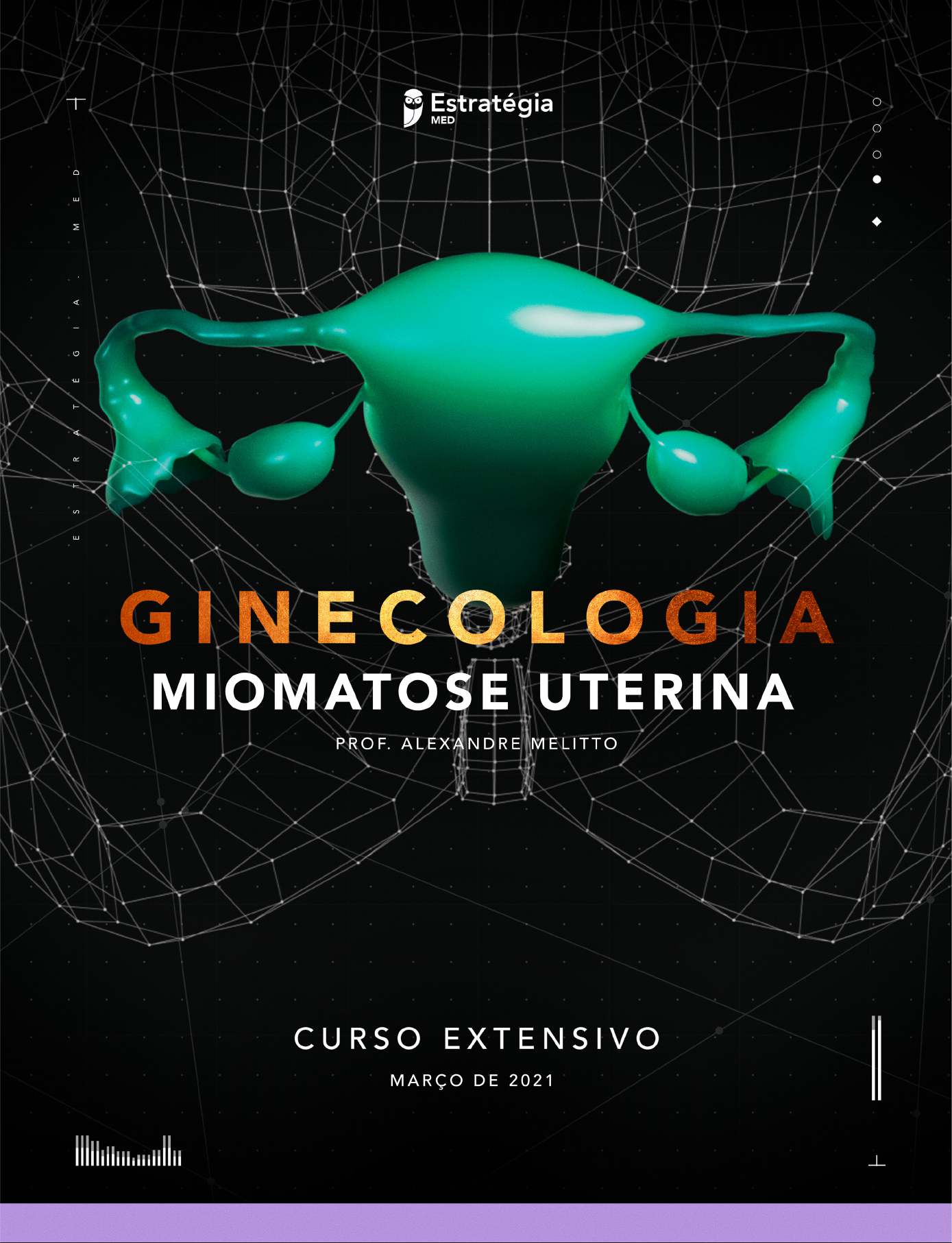 Estratégia MED GINECOLOGIA 2Prof. Alexandre Melitto|Miomatose Uterina APRESENTAÇÃO PROF. ALEXANDRE MELITTO Meu nome é Alexandre Santos Melitto, somos colegas de profissão. Fiz minha graduação na Escola Paulista de Medicina – UNIFESP e, após a graduação, fui aprovado para a Residência Médica em Ginecologia e Obstetrícia da mesma instituição. Na época, fui aprovado também na UNICAMP, FCMSCSP (Santa Casa), Santos (Lusíadas) e FMABC. Após o término da Residência de Ginecologia e Obstetrícia, fui aprovado para a Residência Médica em Mastologia da Escola Paulista de Medicina – UNIFESP. Tendo concluído as duas residências, continuei a pós-graduação defendendo minha tese de Mestrado também na UNIFESP, e Estratégia MED GINECOLOGIA 3Prof. Alexandre Melitto|Miomatose Uterina @estrategiamed /estrategiamed Estratégia Med t.me/estrategiamed cursando atualmente o Doutorado. Cursei o MBA em gestão de Saúde da Fundação Getúlio Vargas. Atualmente, sou docente e coordenador da disciplina de Ginecologia e Obstetrícia da Faculdade de Medicina da Universidade Anhembi Morumbi – Laureate Universities, lecionando há mais de 10 anos e ocupo cargo efetivo de médico assistente do Centro de Referência em Saúde da Mulher – Hospital Pérola Byington. Também já fui preceptor da Residência Médica de Mastologia da UNIFESP – EPM durante 5 anos. Minha formação e o exercício profissional trouxeram-me competência e experiência para desenvolver este curso e garantir a melhor performance para as provas de Residência Médica. Neste curso tenho uma missão: fazê-lo conquistar sua vaga de Residente! Seu sonho é a minha meta! Conte comigo como um parceiro nesta jornada!!! Todos que passaram na prova de Residência lembram-se deste período como um tempo de privação, seja de tempo livre, lazer, hobbies, viagens, descanso e até mesmo convivência familiar. Posso dizer que é temporário, passageiro e que, no final, a conquista supera qualquer sacrifício!!! https://www.instagram.com/estrategiamed/?hl=pt https://www.facebook.com/estrategiamed1/ https://www.youtube.com/channel/UCyNuIBnEwzsgA05XK1P6Dmw https://t.me/estrategiamed Estratégia MED 4 GINECOLOGIA Miomatose Uterina Prof. Alexandre Melitto | Curso Extensivo | Março 2021 SUMÁRIO INTRODUÇÃO 6 METODOLOGIA DO CURSO 6 1.0 CONSIDERAÇÕES INICIAIS 8 2.0 DEFINIÇÃO 8 2.1EPIDEMIOLOGIA 9 2.2 CLASSIFICAÇÃO 10 3.0 FISIOPATOLOGIA 11 3.1 HISTOLOGIA 11 3.2 INFLUÊNCIA HORMONAL 11 3.3 DEGENERAÇÕES 13 4.0 FATORES DE RISCO E DE PROTEÇÃO 15 5.0 QUADRO CLÍNICO 18 5.1 SINTOMAS 18 5.2 EXAME FÍSICO 20 6.0 DIAGNÓSTICO 23 6.1 ULTRASSONOGRAFIA 23 6.2 HISTEROSSONOGRAFIA 25 6.3 RESSONÂNCIA MAGNÉTICA 25 6.4 HISTEROSCOPIA 26 7.0 DIAGNÓSTICO DIFERENCIAL 27 8.0 TRATAMENTO 28 8.1 TRATAMENTO CLÍNICO 28 8.2 TRATAMENTO CIRÚRGICO 32 8.2.1 TRATAMENTO CIRÚRGICO CONSERVADOR 33 8.2.1.1 MIOMECTOMIA LAPAROSCÓPICA 35 Estratégia MED 5 GINECOLOGIA Miomatose Uterina Prof. Alexandre Melitto | Curso Extensivo | Março 2021 8.2.1.2 MIOMECTOMIA LAPAROTÔMICA 36 8.2.1.3 MIOMECTOMIA HISTEROSCÓPICA 37 8.2.1.4 EMBOLIZAÇÃO DAS ARTÉRIAS UTERINAS 42 8.2.1.5 LIGADURA DAS ARTÉRIAS UTERINAS 46 8.2.1.6 ABLAÇÃO ENDOMETRIAL 46 8.2.1.7 MIÓLISE POR ULTRASSOM FOCALIZADO DE ALTA INTENSIDADE (HIFU) GUIADO POR RESSONÂNCIA MAGNÉTICA 47 8.2.2 TRATAMENTO CIRÚRGICO DEFINITIVO 48 9.0 RESUMO 51 9.1 FLUXOGRAMA 52 10.0 LISTA DE QUESTÕES 54 11.0 REFERÊNCIAS BIBLIOGRÁFICAS 54 12.0 CONSIDERAÇÕES FINAIS 55 Estratégia MED 6 GINECOLOGIA Miomatose Uterina Prof. Alexandre Melitto | Curso Extensivo | Março 2021 INTRODUÇÃO Caro Candidato(a) e Colega! A equipe do Estratégia MED tem a missão de ajudar e acompanhar sua jornada rumo a sonhada vaga de Residência Médica. Este material faz parte do Curso de Ginecologia, com teoria e exercícios resolvidos e comentados. Existem atualmente no Brasil 337 Faculdades de Medicina, estando nosso país em segundo lugar no ranking mundial em número de Escolas Médicas. Temos um grande déficit de vagas de Residência Médica ofertadas para os egressos dessas Universidades. Ou seja, é notório que o desafio de ser aprovado em um concurso de Residência Médica será cada vez maior. A finalidade deste curso é oferecer conteúdo teórico e, sobretudo, assertivo para os estudos, contribuindo para atingir seu objetivo de ser aprovado em um programa de Residência Médica. O conhecimento médico cresce de maneira exponencial, existindo inúmeros tratados para cada especialidade, atualizados através de artigos científicos publicados em periódicos. O recém-formado tem a necessidade de tornar seus estudos mais objetivos, concentrando-se e focando nas informações realmente importantes e frequentes nas provas de Residência Médica. Este material segue esta lógica. METODOLOGIA DO CURSO Para cumprirmos a nossa missão de prepará-lo para os concursos de Residência Médica e entregar a você um material completo, nosso curso de Ginecologia seguirá a seguinte metodologia: Estudaremos a TEORIA de Ginecologia por completo; Resolveremos QUESTÕES de provas recentes e inéditas, comentadas, alternativa por alternativa; Demonstraremos o posicionamento da BANCA; E realizaremos SIMULADOS; Assim sendo, você terá um curso que contemplará o que o candidato realmente precisa para obter sua aprovação: teoria (com as mais recentes atualizações científicas), muitas questões resolvidas e alguns simulados para testar seu progresso. Tudo isso da maneira mais prática possível, através de textos escritos e videoaulas. Através de uma análise ampla das questões de concursos de Residência Médica de todo o país nos últimos 5 anos, fizemos um levantamento dos temas cobrados em Ginecologia. O gráfico abaixo mostra a frequência com que estes temas aparecem nas provas: Estratégia MED 7 GINECOLOGIA Miomatose Uterina Prof. Alexandre Melitto | Curso Extensivo | Março 2021 0,00% 1,00% 2,00% 3,00% 4,00% 5,00% 6,00% 7,00% 8,00%