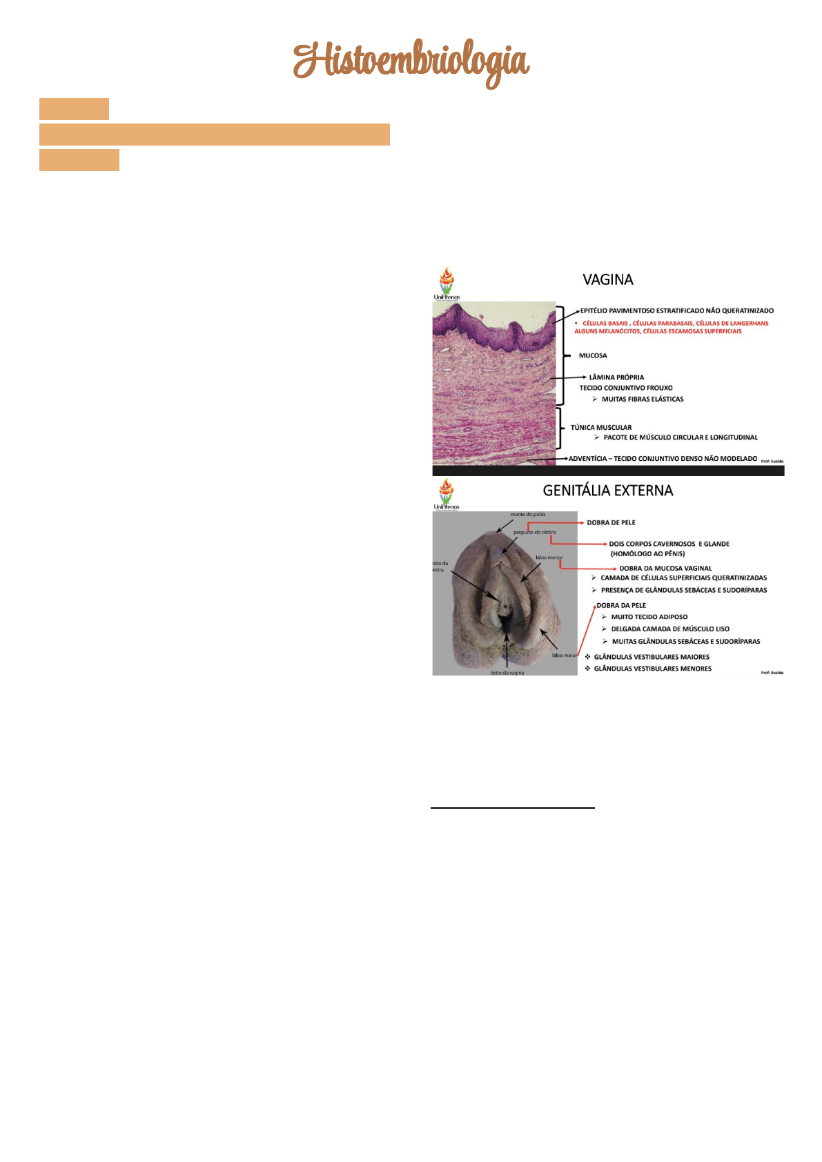 Hist��m�i�l�gia AULA 4 (14/11) Continuação de sistema reprodutor feminino VAGINA/CANAL VAGINAL: ● Parte veio dos ductos paramesonéfricos. ● Uma vez formado, ele vai ter uma mucosa, uma muscular e uma adventícia. ● A mucosa tem um epitélio pavimentoso estratificado não queratinizado, e nesse epitélio vai ter células basais, células parabasais, células pré-queratinizadas e células queratinizadas, mas que não estão relacionadas com o processo de queratinização que é estudado na pele. ● Nesse epitélio é o local onde faz o exame de citologia esfoliativa, anteriormente esses exames eram para detectar as fases do ciclo menstrual, mas hoje é para detectar a presença de células cancerígenas, principalmente associadas ao colo do útero. ● Outro item que já foi estudado é as bactérias que estão nesse local que produzem ácido lático a partir do glicogênio que é armazenado por essas células. Esse armazenamento de glicogênio é devido o aumento na taxa de estrógeno, então na fase estrogênica, acaba aumentando justamente a produção do glicogênio dentro das células. ● A lâmina própria é um conjuntivo frouxo, mas também possui muita fibra elástica, por isso pode ser chamado de conjuntivo frouxo fibroelástico, é a área que dá, juntamente com a adventícia, maior elasticidade para a região do canal vaginal. ● E por fora, teremos depois da parte da mucosa, uma túnica muscular, mas não chega a ser uma túnica muscular definida. É observada a presença de musculatura lisa e a presença de musculatura longitudinal, o circular está mais próximo da mucosa e o longitudinal está mais próximo da adventícia. ● Por fim, a túnica adventícia, que, ao contrário dos outros locais do corpo, que normalmente a adventícia é conjuntivo frouxo, na região do canal vaginal será um conjuntivo denso não modelado, e esse conjuntivo também apresenta muita fibra elástica. Com isso, esse canal é ligado aos órgãos vizinhos. ● O canal vaginal é considerado o órgão de cópula feminino, ele com o colo do útero seria o canal de parto normal. Resposta à pergunta: o parto dilata o colo do útero e o canal, mas não ocorre mudança de epitélio. GENITÁLIA EXTERNA FEMININA: ● É homóloga à genitália externa masculina. ● Na imagem: temos a dobra de pele - que está cobrindo o clitóris, seria um prepúcio rudimentar. O clitóris - que veio do falo primordial, que não teve ação da testosterona, por isso vai ter dois corpos TRANSCRIÇÕES BETA XVII - 1 Hist��m�i�l�gia cavernosos, mas não ocorre o crescimento dele. Mas, consequentemente, você fala que é o órgão de excitação feminina por ter muita terminação nervosa, mas a característica seria justamente a presença desses dois corpos cavernosos, que seriam homólogos ao penis. ● Externamente, você vê os lábios menores, que é a continuação do canal vaginal externamente, então a parede do canal vaginal quando vai externo/abre na área vestibular ele dá origem aos lábios menores. Nesse caso vai ter uma série de camadas de células que podem estar parcialmente queratinizadas, na realidade a gente fala que está na transição entre o epitélio queratinizado e não queratinizado e, nessa área de lábios menores, já têm glândulas sebáceas e sudoríparas. ● Externamente aos lábios menores é encontrado os lábios maiores/grandes lábios, que são dobras da pele, só que na embriologia essa região é proveniente das saliências lábio escrotais. Quando diferencia vai ser visto uma dobra de pele com mais tecido adiposo, então ali vai ter epiderme queratinizada, derme tem conjuntivo frouxo e abaixo vai ter um tecido conjuntivo adiposo unilocular, além disso aparecem glândulas sebáceas, sudoríparas, folículo piloso, pelos, são essas as estruturas histológicas que vai ser visto na região dos lábios maiores. ● A área onde tem lábios maiores e menores, você chama de região vestibular e nele tem glândulas formada por dois grupos, as glândulas vestibulares maiores que está uma do lado da outra na região dos lábios maiores e uma grande quantidade de glândulas vestibulares menores que vai estar na região do clitoris, na abertura da uretra. ● Esses dois grupos de glândulas secretam muco, uma secreção viscosa com a função lubrificante quando comparado com os outros tipos celulares. ● As glândulas vestibulares maiores são homólogas às glândulas bulbouretrais que estão no início da base do penis. ● Histologicamente, essas são as estruturas da genitália externa: labios maiores, labios menores, clitoris, pois essas estruturas demandam o desenvolvimento da genitália externa indiferenciada na 7ª semana para masculino ou feminino. GLÂNDULAS MAMÁRIAS: ● Trata-se de um anexo da pele e durante o desenvolvimento embrionário, tanto masculino quanto feminino, vai ocorrer invaginações do ectoderma que vão produzir os ductos da glândula. ● Mas, como no masculino não tem ação de estrógeno, essa glândula não vai desenvolver e os ductos vão permanecer pequenos e inativos. ● Já na parte feminina, os ductos das glândulas, antes de ter a puberdade, vai ter a presença do ducto galactóforo, há uma dilatação chamada de seio galactóforo e cada ducto desse desemboca no mamilo que é uma região de pele com musculatura lisa no sentido circular. ● Em uma criança feminina vai ter justamente isso: o ducto galactóforo, seio galactóforo e algumas ramificações dos ductos galactóforos. Então, esse seria o caracterizado para a glândula, ou seja, uma glândula que está inativa que não está em desenvolvimento. TRANSCRIÇÕES BETA XVII - 2 Hist��m�i�l�gia ● A glândula mamária como um todo tem por volta de 20 a 25 ductos deste, então em uma criança feminina, a região da glândula mamária tem 20 a 25 glândulas que seria o seio galactóforo, os ductos galactóforos, e alguns ductos terminais. ● Cada