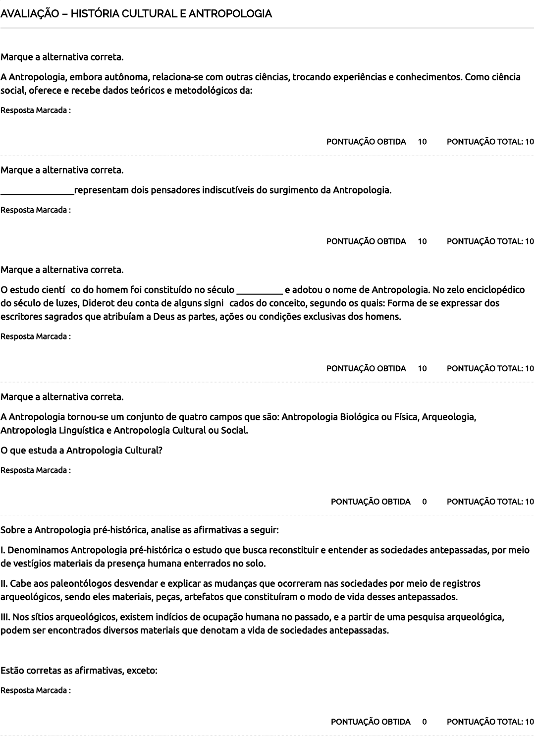 AVALIAÇÃO – HISTÓRIA CULTURAL E ANTROPOLOGIA PONTUAÇÃO TOTAL: 10PONTUAÇÃO OBTIDA 10 Marque a alternativa correta. A Antropologia, embora autônoma, relaciona-se com outras ciências, trocando experiências e conhecimentos. Como ciência social, oferece e recebe dados teóricos e metodológicos da: Resposta Marcada : Psicologia. PONTUAÇÃO TOTAL: 10PONTUAÇÃO OBTIDA 10 Marque a alternativa correta. ________________representam dois pensadores indiscutíveis do surgimento da Antropologia. Resposta Marcada : Buffon e Saint-Hilaire. PONTUAÇÃO TOTAL: 10PONTUAÇÃO OBTIDA 10 Marque a alternativa correta. O estudo científico do homem foi constituído no século __________ e adotou o nome de Antropologia. No zelo enciclopédico do século de luzes, Diderot deu conta de alguns significados do conceito, segundo os quais: Forma de se expressar dos escritores sagrados que atribuíam a Deus as partes, ações ou condições exclusivas dos homens. Resposta Marcada : XVIII PONTUAÇÃO TOTAL: 10PONTUAÇÃO OBTIDA 0 Marque a alternativa correta. A Antropologia tornou-se um conjunto de quatro campos que são: Antropologia Biológica ou Física, Arqueologia, Antropologia Linguística e Antropologia Cultural ou Social. O que estuda a Antropologia Cultural? Resposta Marcada : Todas as alternativas estão corretas. PONTUAÇÃO TOTAL: 10PONTUAÇÃO OBTIDA 0 Sobre a Antropologia pré-histórica, analise as a�rmativas a seguir: I. Denominamos Antropologia pré-histórica o estudo que busca reconstituir e entender as sociedades antepassadas, por meio de vestígios materiais da presença humana enterrados no solo. II. Cabe aos paleontólogos desvendar e explicar as mudanças que ocorreram nas sociedades por meio de registros arqueológicos, sendo eles materiais, peças, artefatos que constituíram o modo de vida desses antepassados. III. Nos sítios arqueológicos, existem indícios de ocupação humana no passado, e a partir de uma pesquisa arqueológica, podem ser encontrados diversos materiais que denotam a vida de sociedades antepassadas. Estão corretas as a�rmativas, exceto: Resposta Marcada : I e II. 22/06/2024, 21:10 Course Status – Faculdade Educavales https://ava.educavales.universaeducacional.com.br/course-status/ 1/2 70 / 100 PONTUAÇÃO TOTAL: 10PONTUAÇÃO OBTIDA 10 Marque a alternativa correta. O período da crítica é considerado mais fecundo da Antropologia. Os cânones iniciais da Antropologia foram criticados. Novas abordagens foram propostas. Houve um avanço formidável também nas ciências paralelas. Os meios de comunicação progrediram gradativamente permitindo, assim, uma divulgação e comunicação de ideias mais e�cientes. Em que ano esse período foi iniciado? Resposta Marcada : 1900. PONTUAÇÃO TOTAL: 10PONTUAÇÃO OBTIDA 0 Analise as a�rmativas a seguir. I. Antropologia é uma disciplina que investiga as origens, os desenvolvimentos e as semelhanças das sociedades humanas, assim como as diferenças entre elas. II. A antropologia é um movimento epistemológico importante no pensamento cienti�co, pois o homem deixa de se perceber como o “centro da humanidade” e passa a olhar o outro, a �m de acessar, conhecer, estudar e compreender o seu modo de habitar o mundo. III. O objetivo principal da Antropologia é estudar a sociedade humana, instituições sociais e cultura, em sua forma mais elementar. Marque a alternativa correta: Resposta Marcada : Somente I está correta PONTUAÇÃO TOTAL: 10PONTUAÇÃO OBTIDA 10 Marque a alternativa correta. De todas as ciências sociais, a ____________ é a que mantém relações mais íntimas com a Antropologia, em função de seus interesses teóricos e práticos, salvaguardando a especificidade de cada uma. Resposta Marcada : Sociologia. PONTUAÇÃO TOTAL: 10PONTUAÇÃO OBTIDA 10 Marque a alternativa correta. O campo da___________, por causa de sua ênfase no signi�cado interacional situado e seu estudo intensivo de eventos comunicativos e princípios estruturantes interventor, tem contribuições especi�cas para dar à pesquisa educacional sobre práticas de letramento. Resposta Marcada : Antropologia Linguística. PONTUAÇÃO TOTAL: 10PONTUAÇÃO OBTIDA 10 Sobre o Método Indutivo marque a opção correta. Resposta Marcada : Parte de premissas dos fatos observados para chegar a uma conclusão que contém informações sobre fatos ou situações não observadas. Total 22/06/2024, 21:10 Course Status – Faculdade Educavales https://ava.educavales.universaeducacional.com.br/course-status/ 2/2