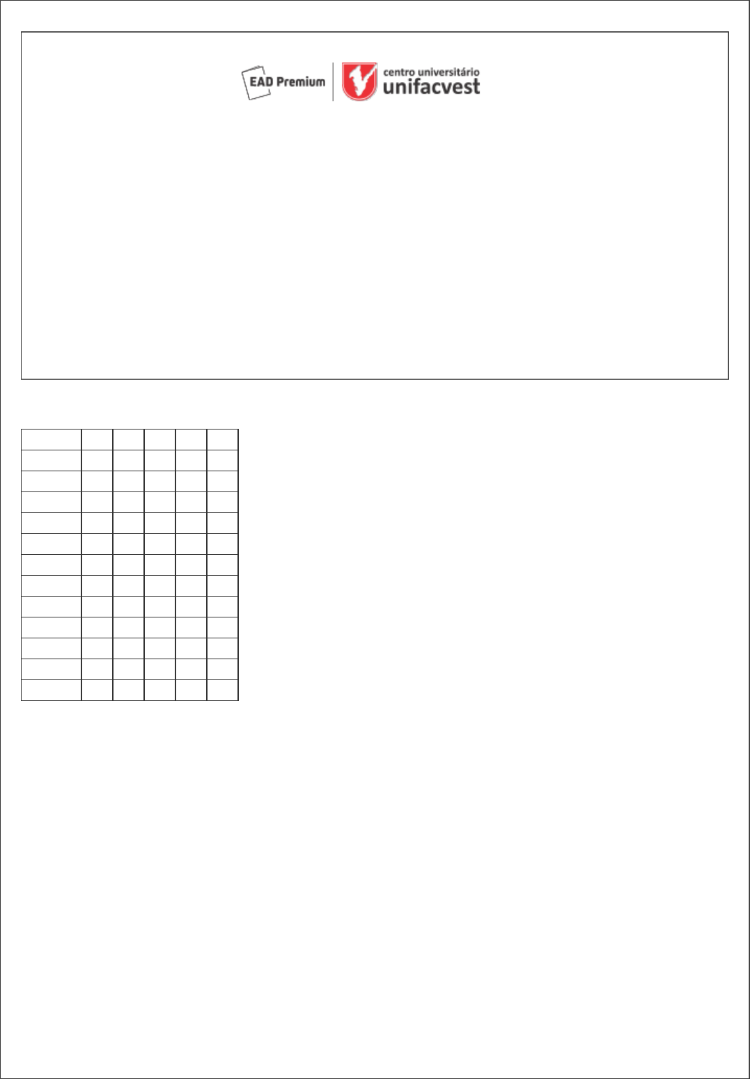 Requisição: 6829662 Matricula: 836458 Data: 04/03/2024 12:23 Página: 1/5 Prova presencial regular Curso: 12 MESES - SEGUNDA LICENCIATURA EM ARTES - UNIFACVEST EAD Módulo: 1 Grupo: 237 Município: POÕ - SP Disciplina(s): 101087 - ARTES VISUAIS - PINTURA Nome: 836458 - SIMONE ALVES ABREU Data: ___/___/_________ Hora:___|___|___ Assinatura do aluno: ________________________________________________________ Preencha o gabarito abaixo com X na coluna correta. Atente para a coluna de numeração e das alternativas. Questões A B C D E 1 2 3 4 5 6 7 8 9 10 11 12 1 ) Qual elemento deve ser acrescentado à receita de têmpera para transformá-la em têmpera gorda? Assinale a alternativa correta. A ) Própolis. B ) Óleo de linhaça C ) Álcool. D ) Aguarrás. E ) Gesso cré. 2 ) Requisição: 6829662 Matricula: 836458 Data: 04/03/2024 12:23 Página: 2/5 Fonte: AMÉRICO, P. Batalha do Avaí. 1872 - 1877. Óleo sobre tela: 600 x 1100 cm. Museu Nacional de Belas Artes, Rio de Janeiro. A pintura produzida pelo brasileiro Pedro Américo retrata uma cena da Guerra do Paraguai e pode ser classificada como ______________. Assinale a alternativa que completa corretamente a lacuna. A ) Retrato. B ) Marinha. C ) Pintura histórica. D ) Pintura de gênero. E ) Pintura sacra. 3 ) Neste trabalho, o artista Kurt Schwitters colou papéis, combinando pinturas e aguadas. Qual técnica pode definir essa obra? Assinale a alternativa correta. SCHWITTERS, K. Aforismo. 1923. Guache e papéis colados sobre papel: 8,9 x 7,3 cm. Galeria Tate, Londres Requisição: 6829662 Matricula: 836458 Data: 04/03/2024 12:23 Página: 3/5 A ) Aquarela sobre papel. B ) Têmpera sobre papel. C ) Técnica mista sobre papel. D ) Têmpera sobre madeira. E ) Óleo sobre tela. 4 ) O pastel seco se caracteriza por ser produzido com uma quantidade mínima de aglutinante, o que o faz ser considerado uma pintura com o uso quase que puro do pigmento. Quanto ao pastel oleoso, quais produtos envolvem sua produção? Assinale a alternativa correta. A ) Uma quantidade considerável de pigmento e água. B ) Pigmento e uma quantidade mínima de aglutinante. C ) Pigmento e goma adragante. D ) Pigmento e uma quantidade considerável de aglutinante. E ) Pigmento e goma karaia. 5 ) Qual tipo de técnica de pintura é produzido em um suporte cuja armação é feita de chumbo e se aproveita da passagem de luz para gerar efeitos pictóricos? Assinale a alternativa correta. A ) Vitral B ) Grafite. C ) Afresco. D ) Body art. E ) Aguada. 6 ) A repetição e combinação de certos padrões vibratórios por meio de formas, figuras geométricas, linhas ou cores e que produzem uma sensação tátil ou óptica é conhecida como ______________. Assinale a alternativa que completa corretamente a lacuna. A ) Textura. B ) Plano. C ) Linha. D ) Forma. E ) Ponto. 7 ) Requisição: 6829662 Matricula: 836458 Data: 04/03/2024 12:23 Página: 4/5 As técnicas de pintura com lápis de cor e pastel são consideradas pinturas a seco devido a qual característica? Assinale a alternativa correta. A ) Secagem lenta. B ) Não é necessário esperar secar. C ) Necessita aditivo para retardar secagem. D ) Necessita aditivo para antecipar secagem. E ) Secagem rápida. 8 ) Quais das características a seguir se aplicam à pintura com têmpera a ovo? Assinale a alternativa correta. A ) Secagem rápida, brilho intenso e opacidade. B ) Secagem rápida, cores permanentes, opacidade. C ) Secagem lenta, brilho intenso e transparência. D ) Secagem lenta, cores permanentes, transparência. E ) Secagem lenta, cores permanentes, transparência. 9 ) Entre as linguagens artísticas apresentadas a seguir, assinale qual influenciou diretamente os rumos da história da pintura, desenvolvendo o modo de observar uma imagem. A ) Cinema. B ) Artes cênicas. C ) Dança. D ) Música. E ) Fotografia. 10 ) Sobre as características do lápis de cor, indique se as afirmativas são verdadeiras (V) ou falsas (F): I. Suas cores devem apresentar aderência ao papel e intensidade. II. A mina colorida deve estar bem posicionada no centro da madeira. III. Geralmente são adequados a qualquer tipo de papel. IV. Podem amarelar alguns tipos de papéis após o uso. A ) V, F, V, F. B ) F, F, F, F. C ) V, V, V, V. Requisição: 6829662 Matricula: 836458 Data: 04/03/2024 12:23 Página: 5/5 D ) F, F, F, V. E ) V, V, V, F. 11 ) Entre as técnicas de pintura a seguir, quais podem ser consideradas pintura a seco? Assinale a alternativa correta. A ) Aquarela e acrílica. B ) Pastel e lápis de cor. C ) Tinta a óleo e acrílica. D ) Têmpera e guache. E ) Aquarela e guache. 12 ) Sobre o uso da paleta de pintura, assinale a alternativa correta A ) Superfície onde se apoiam as tintas e onde é possível misturá-las. B ) Aparelho que aplica a tinta pulverizada no suporte. C ) Carrega a tinta nas cerdas para ser espalhada no suporte. D ) Serve para aplicar a tinta empastada na tela. E ) Instrumento que rola no suporte e espalha a tinta de maneira uniforme.