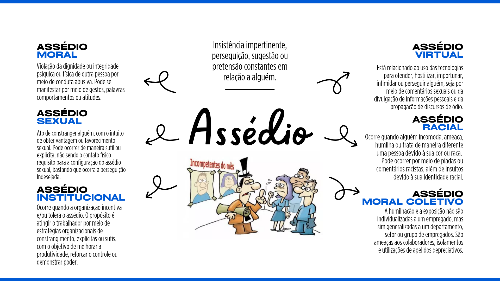 ASSÉDIO Insistência impertinente, ASSÉDIO MORAL perseguição, sugestão ou VIRTUAL Violação da dignidade ou integridade pretensão constantes em Está relacionado ao uso das tecnologias psíquica ou física de outra pessoa por relação a alguém. para ofender, hostilizar, importunar, meio de conduta abusiva. Pode se intimidar ou perseguir seja por manifestar por meio de gestos, palavras meio de comentários sexuais ou da comportamentos ou atitudes. divulgação de informações pessoais e da propagação de discursos de ódio. ASSÉDIO SEXUAL Ato de constranger com 0 intuito Assédio ASSÉDIO RACIAL de obter vantagem ou favorecimento Ocorre quando alguém incomoda, ameaça, sexual. Pode ocorrer de maneira sutil ou humilha ou trata de maneira diferente explícita, não sendo 0 contato físico uma pessoa devido à sua con ou raça. requisito para a configuração do assédio Incompetentes do mês Pode ocorrer por meio de piadas ou sexual, bastando que ocorra a perseguição comentários racistas, além de insultos indesejada. devido à sua identidade racial ASSÉDIO ASSÉDIO INSTITUCIONAL MORAL COLETIVO Ocorre quando a organização incentiva A humilhação e a exposição não são e/ou tolera 0 assédio. 0 propósito é individualizadas a um empregado, mas atingir 0 trabalhador por meio de sim generalizadas a um departamento, estratégias organizacionais de setor ou grupo de empregados. São constrangimento, explícitas ou sutis, ameaças aos colaboradores, isolamentos com 0 objetivo de melhorar a e utilizações de apelidos depreciativos. produtividade, reforçar 0 controle ou demonstrar poder.