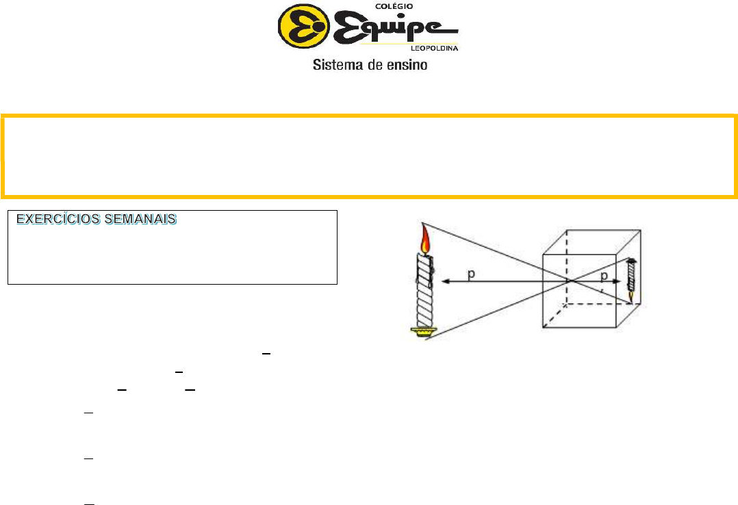 EXERCÍCIOS EXTRAS ALUNO: ____________________________________________ SÉRIE:PréEnem TURMA: __ DISCIPLINA: Física PROFESSOR: Angela DATA: ___/___/2020 NOTA: _____ PRÉ ENEM - 8ª AULA MATÉRIA: FÍSICA PROFESSOR: ANGELA JUSTIFIQUE SUAS RESPOSTAS 1) (FATEC) Em um dia ensolarado, um menino finca um cabo de vassoura verticalmente no chão, que é plano. A parte visível da haste tem altura h. A sombra da haste tem comprimento s, ao passo que a da torre tem comprimento S. A altura H da torre é: a) h S s H b) h s S H c) h s H d) H= (S – s) h e) H = (S+ s) h 2) (OSEC) Um observador na Terra vê um eclipse total do Sol. Quais das seguintes condições devem valer para que isso ocorra? I. A Terra, a Lua e o Sol estão alinhados. II. O observador se localiza no cone de penumbra da Lua. III. O observador se localiza no cone de sombra da Lua. IV. O cone de sombra da Lua não chega a atingir a Terra. a) I e II b) I e III c) I e IV d) I, II e III e) I, III e IV 3) (FAFEOD) A figura abaixo representa, esquematicamente, uma câmara escura fornecendo uma imagem de um objeto colocado diante dela. Sabendo-se que a distância do objeto ao orifício de entrada da câmara vale p = 3,00 m, que a distância do orifício à parede posterior vale p’ = 40 cm e que a altura do objeto é 15 cm, a altura da imagem será de a) 3,0 cm b) 4,0 cm c) 2,0 cm d) 5,0 cm e) 3,5 cm 4) (Mackenzie-SP) A altura da imagem de um objeto fornecida por uma câmara escura de orifício é diminuída quando: a) aumentamos o diâmetro do orifício. b) diminuímos o diâmetro do orifício. c) afastamos a câmara do objeto. d) aproximamos a câmara do objeto. e) diminuímos o comprimento da câmara. 5) Um aluno tem em suas mãos uma régua que iluminada por luz branca se apresenta branca com a palavra GINÁSIO em amarelo. Ao incidir nessa régua uma luz monocromática amarela, a régua: a) será vista toda preta b) será vista toda branca c) será vista toda amarela d) será vista amarela e preta 6) Suponha que a luz solar seja MONOCROMÁTICA ao invés de branca. Um fenômeno ótico causado por esta luz que não seria observado seria: a) a refração b) o arco-íris c) a reflexão d) a difração e) a sombra 7) (UNITAU) Dois raios de luz, que se propagam num meio homogêneo e transparente, se interceptam num certo ponto. A partir deste ponto, pode-se afirmar que: a) os raios luminosos se cancelam. b) mudam a direção de propagação. c) continuam se propagando na mesma direção e sentido que antes. d) se propagam em trajetórias curvas. e) retornam em sentidos opostos 8) (UEL) Considere as seguintes afirmativas: I. A água pura (limpa) é um meio translúcido. II. O vidro fosco é um meio opaco. III. O ar é um meio transparente. Sobre as afirmativas acima, assinale a alternativa CORRETA: a) Apenas a afirmativa I é verdadeira. b) Apenas a afirmativa II é verdadeira. c) Apenas a afirmativa III é verdadeira. d) Apenas as afirmativas I e a III são verdadeira. e) Apenas as afirmativas II e a III são verdadeira. 9) (UNIUBE) Segundo a Óptica geométrica, nos meios homogêneos e transparentes, a luz se propaga em linha reta (Princípio da Propagação Retilínea da Luz). Esse princípio pode ser utilizado para determinar grandes alturas de prédios, de montanhas etc. A figura abaixo mostra, de acordo com o referido princípio, as sombras, projetadas no solo, de um poste de luz e de uma torre elétrica cuja altura é de: a) 30 m b) 20 m c) 40 m d) 22 m 10)(UFRS) A imagem focada de uma árvore numa câmara escura dista 50 mm do orifício e tem uma altura de 20 mm. A árvore está a uma distância de 15m do orifício. Qual a altura da árvore? a) 2 m b) 4 m c) 6 m d) 8 m e) 10 m 11) (UEL) Durante uma eclipse solar, um observador: a) no cone de sombra, vê um eclipse parcial. b) na região da penumbra vê um eclipse total. c) na região plenamente iluminada, vê a Lua eclipsada. d) na região da sombra própria da Terra, vê somente a Lua. e) na região plenamente iluminada, não vê o eclipse solar. 12) (UFES) Um objeto amarelo, quando observado em uma sala iluminada com luz monocromática azul, será visto: a) amarelo b) azul c) preto d) violeta e) vermelho 13) (UFGO) Suponha que a bandeira do Brasil seja colocada em um quarto escuro e iluminada com luz monocromática amarela. De que cor será vista a bandeira? a) amarela e preta b) amarela e branca c) amarela verde e branca d) toda preta e) verde e amarela 14) (MACK) Uma folha P reflete apenas luz verde e uma folha Q absorve a luz de todas as cores, exceto a azul; iluminando as folhas com luz branca e observando através de um filtro vermelho, teremos: a) P parecerá vermelha e Q azul. b) P parecerá preta e Q branca. c) Ambas parecerão vermelhas. d) Ambas parecerão brancas. e) Ambas parecerão pretas. 15)(UNIRIO) Durante a final da Copa do Mundo, um cinegrafista, desejando alguns efeitos especiais, gravou cena em um estúdio completamente escuro, onde existia uma bandeira da “Azurra” (azul e branca) que foi iluminada por um feixe de luz amarela monocromática. Quando a cena foi exibida ao público, a bandeira apareceu: a) verde e branca b) azul e branca c) verde e amarela d) preta e branca e) preta e amarela 16) A figura abaixo mostra um eclipse solar no instante em que é fotografado em cinco diferentes pontos do planeta. Três dessas fotografias estão reproduzidas abaixo. As fotos poderiam corresponder, respectivamente, aos pontos: a) III, V e II b) II, III e V c) II, IV e III d) I, II e III e) I, II e V 17) (Faap-SP) Um quadro, coberto com uma placa de vidro plano, não pode ser visto tão nitidamente quanto outro não coberto, porque o vidro: a) é opaco b) é transparente c) não reflete a luz d) reflete parte da luz e) é uma fonte luminosa 18)(PUC-SP) Dois espelhos planos são colocados juntos, de modo que o ângulo entre suas superfícies refletoras seja de 45º. Um objeto é colocado entre as superfícies refletoras. O número de imagens do objeto é: a) 1 b) 2 c) 
