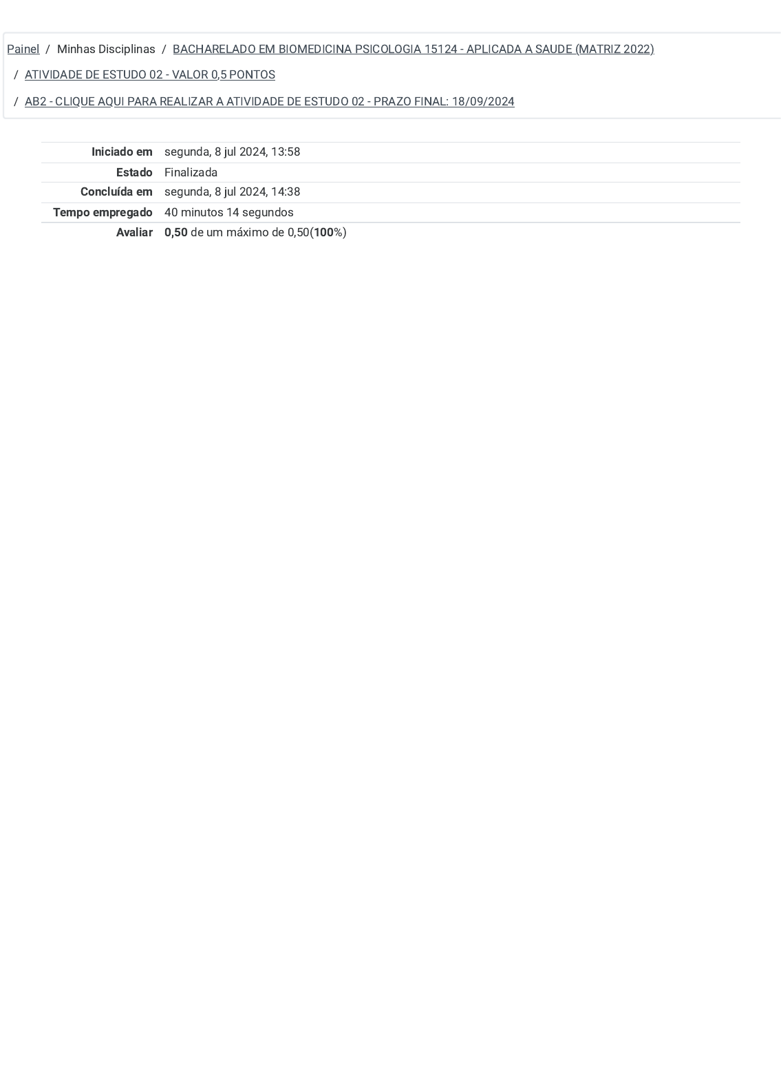 Iniciado em segunda, 8 jul 2024, 13:58 Estado Finalizada Concluída em segunda, 8 jul 2024, 14:38 Tempo empregado 40 minutos 14 segundos Avaliar 0,50 de um máximo de 0,50(100%) Painel / Minhas Disciplinas / BACHARELADO EM BIOMEDICINA PSICOLOGIA 15124 - APLICADA A SAUDE (MATRIZ 2022) / ATIVIDADE DE ESTUDO 02 - VALOR 0,5 PONTOS / AB2 - CLIQUE AQUI PARA REALIZAR A ATIVIDADE DE ESTUDO 02 - PRAZO FINAL: 18/09/2024 https://www.eadunifatecie.com.br/course/view.php?id=43378 https://www.eadunifatecie.com.br/course/view.php?id=43378 https://www.eadunifatecie.com.br/my/ https://www.eadunifatecie.com.br/course/view.php?id=43378 https://www.eadunifatecie.com.br/course/view.php?id=43378#section-7 https://www.eadunifatecie.com.br/mod/quiz/view.php?id=1420026 Questão 1 Completo Atingiu 0,05 de 0,05 “Todos os sistemas de saúde do mundo têm problemas. Não há nenhum perfeito. Entretanto, grandes esforços foram desenvolvidos por algumas nações desde o século passado para assegurarem um sistema de saúde mais digno para seus cidadãos. Nesse sentido, algumas perguntas são fundamentais para definirmos o tipo de sistema de saúde que pretendemos. Os serviços de saúde devem ser entendidos como um "bem" para aquele que necessita ou devem ser comprados no mercado por aqueles que podem pagar? Se a segunda opção for a correta, o que fazer com as pessoas que não podem comprar os serviços? Seriam atendidas pela caridade dos prósperos, pelo Estado, por ambos? Convém organizar um sistema de saúde separando o atendimento dos pobres, da classe média e dos ricos? Se a saúde for considerada um direito e não uma mercadoria, a oferta de serviços não deveria ser igual para todos? Na hipótese de os serviços de saúde serem disponíveis para todos, seria justo oferecer mais para aqueles que mais carecem? Como estabelecer prioridades em saúde diante de necessidades tão distintas, prementes e complexas?” PAIM, J. S. O Que é o SUS. Rio de Janeiro: Editora Fiocruz, 2015. Disponível em: http://www.livrosinterativoseditora.fiocruz.br/sus/. Acesso em: 16 abr. 2023. De acordo com os conhecimentos adquiridos ao longo da unidade sobre os TIPOS DE SISTEMAS DE SAÚDE, relacione as colunas abaixo I. Seguro Social; II. Seguridade; III. Assistência. ( ) Atendimento à saúde sob responsabilidade do mercado. ( ) Serviços garantidos para aqueles que contribuem com a previdência social. ( ) Vinculado a situação de cidadania. Agora, assinale a alternativa que traz a sequência correta: a. III - I - II. b. II - I - III. c. III - II - I. d. I - II - III. e. I - III - II. Sua resposta está correta. Questão 2 Completo Atingiu 0,05 de 0,05 “A forte pressão de movimentos civis e sociais na década de 80 fez com que a Constituição Federal de 1988 dedicasse um capítulo inteiro à saúde, prevendo que ela deveria ser universal, gratuita e de acesso igualitário a todos. Esse momento marcava o nascimento do Sistema Único de Saúde (SUS), que teve sua lei de criação regulamentada, a de nº 8080, dois anos mais tarde, no dia 19 de setembro de 1990.” Fonte: UNA-SUS. Maior sistema público de saúde do mundo, SUS completa 31 anos. UNA-SUS, Brasília, 2021. Disponível em: www.unasus.gov.br/noticia/maior-sistema-publico-de-saude-do-mundo-sus-completa-31-anos. Acesso em: 06 jul. 2023. Baseado no fragmento acima e nos conhecimentos adquiridos no decorrer da unidade, assinale a alternativa que responde corretamente à questão: Qual o maior desafio do SUS? a. Enfrentar endemias e pandemias. b. Adaptação tecnológica. c. Contratação de profissionais capacitados. d. Aceitação da comunidade. e. A oferta dos serviços de saúde para uma demanda sempre crescente. Sua resposta está correta. Questão 3 Completo Atingiu 0,05 de 0,05 “À medida que as pessoas interagem com os ambientes em que vivem, essas esferas, que compõem as pessoas, vão se constituindo e formando sua própria história, cada uma seguindo uma dinâmica própria com regras e parâmetros para um modo de viver específico. Paralelamente, as esferas influenciam umas às outras, e cada uma ao conjunto que é a pessoa, ou seja, embora autônomas, são interdependentes”. BRASIL. Ministério da Saúde. Secretaria de Atenção à Saúde. Departamento de Atenção Básica. Cadernos de Atenção Básica, n. 34. Brasília: Ministério da Saúde, 2013a. 173 p. Disponível em: https://bvsms.saude.gov.br/bvs/publicacoes/cadernos_atencao_basica_34_saude_mental.pdf. Acesso em: 25 jul. 2023. Baseado nos estudos sobre o SUS realizados ao longo da unidade, qual o grande desafio da proposta de atendimento proposto pela ESF? Assinale a alternativa correta. a. A integralidade, ou seja, compreender que os indivíduos não podem ser vistos separadamente do contexto que os permeia, das suas relações sociais e territórios que ocupam. b. A grande complexidade do sistema de saúde. c. A grande demanda de atendimentos do SUS. d. Universalidade, ou seja, conseguir atender todos os membros de uma família. e. Equidade, atender todos de modo igualitário. Sua resposta está correta. Questão 4 Completo Atingiu 0,05 de 0,05 “As ações a serem desenvolvidas pelas equipes da AB devem conformar um Projeto Terapêutico Singular (PTS) para cada criança ou adolescente, elaborado a partir da discussão em equipe multiprofissional e contextualizado na realidade de vida da criança ou adolescente e sua família.” BRASIL. Ministério da Saúde. Secretaria de Atenção à Saúde. Departamento de Atenção Básica. Cadernos de Atenção Básica, n. 34. Brasília: Ministério da Saúde, 2013a. 173 p. Disponível em: https://bvsms.saude.gov.br/bvs/publicacoes/cadernos_atencao_basica_34_saude_mental.pdf. Acesso em: 25 jul. 2023. Sobre o trabalho de equipes multiprofissionais dentro das estratégias de intervenção do SUS, assinale a alternativa que traz uma barreira presente nos dias atuais a essa prática. a. A falta de profissionais qualificados para o trabalho. b. A dualid