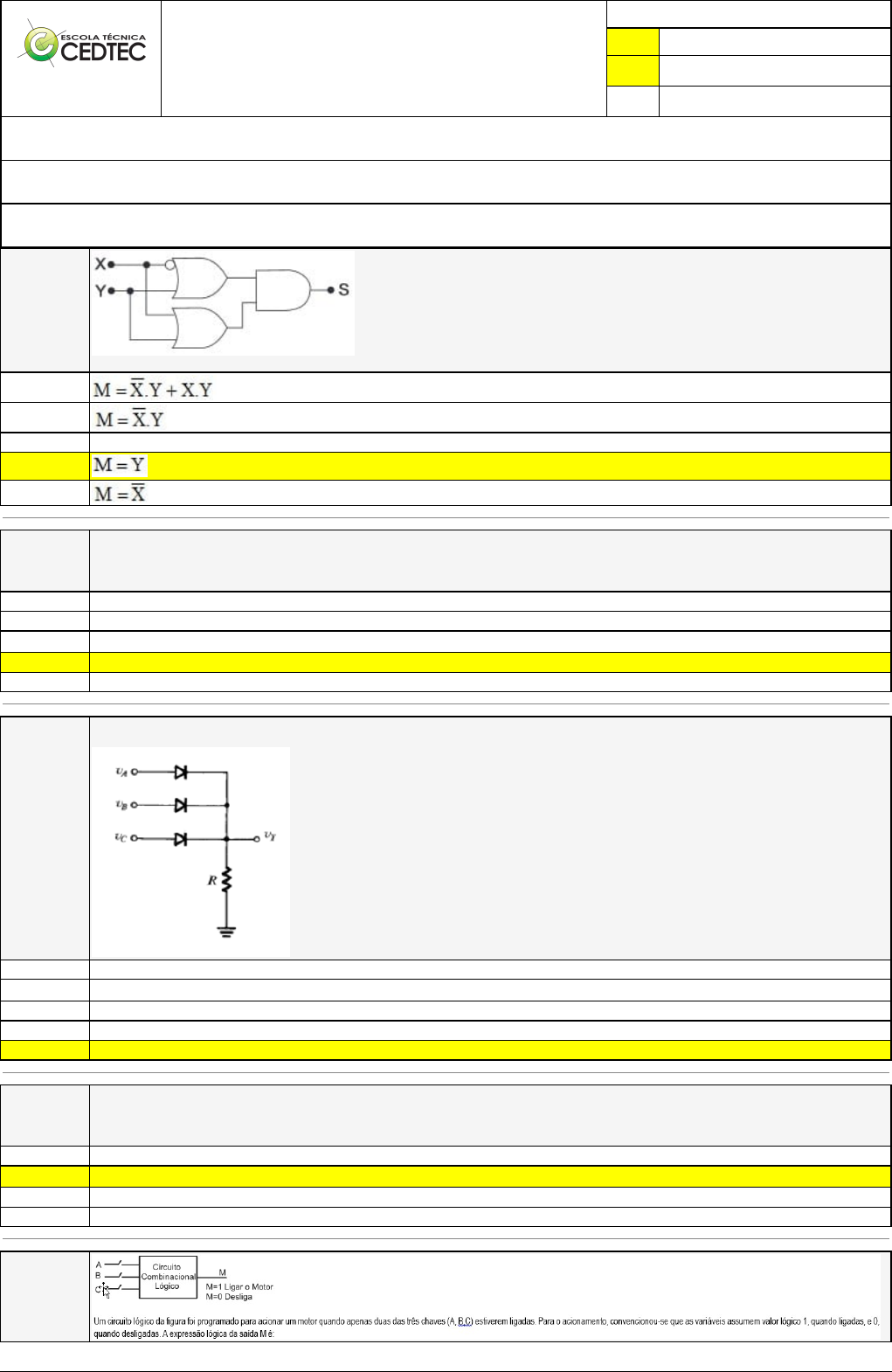 Pincel Atômico - 09/07/2024 20:05:07 1/5 VAGNER DA SILVA SOUZA Avaliação Presencial (EAD) Atividade finalizada em 25/05/2024 10:23:47 (1988032 / 1) LEGENDA Resposta correta na questão # Resposta correta - Questão Anulada X Resposta selecionada pelo Aluno Disciplina: ELETRÔNICA [881760] - Avaliação com 20 questões, com o peso total de 51,00 pontos [capítulos - Todos] Turma: Curso Técnico: Eletrotécnica - Grupo: EAD - 07/23 - EAD ELE [94181] Aluno(a): 91196403 - VAGNER DA SILVA SOUZA - Respondeu 9 questões corretas, obtendo um total de 22,95 pontos como nota [350115_1930] Questão 001 Utilizando o circuito lógico apresentado na figura acima, a expressão correspondente ao sinal S é: X M = X.Y [349998_14702 ] Questão 002 Assumindo que um TBJ possui β= 50, e o mesmo possui uma corrente de base igual a 150µA. Qual a corrente de coletor e de emissor respectivamente? Ic=7,65mA e Ie= 7,5mA Ic=7,65mA e Ie= 7,65mA X Ic= 7,5mA e ie= 150 µA Ic=7,5mA e Ie= 7,65mA Ic= 7,5µA e Ie= 7,5mA [349998_10746 ] Questão 003 O arranjo a seguir demonstra uma das funcionalidades do diodo chamada de: Porta Lógica E X Capacitor Amplificador Resistor Porta Lógica OU [349998_10272 ] Questão 004 De acordo com o que foi estudado, os circuitos integrados oferecem: Alto custo X Várias funções em um único dispositivo medindo menos de 5 cm Alto consumo de Potência Baixa velocidade de operação [350115_1924] Questão 005 Pincel Atômico - 09/07/2024 20:05:07 2/5 X [349998_14599 6] Questão 006 Os quadrinhos apresentam a sequência de certos dispositivos eletrônicos criados no decorrer da história, destacando: A alienação provocada pelo uso excessivo da tecnologia nas sociedades urbanas contemporâneas. X O estágio mais recente da evolução tecnológica para o armazenamento de dados digitais. O desperdício de matéria-prima proveniente da indústria tecnológica A comparação entre evolução humana e tecnológica. Os diferentes tipos de dispositivos usados atualmente para a gravação de dados digitais [349998_10740 ] Questão 007 Usando a segunda aproximação do diodo (modelo simplificado) no circuito apresentado na figura abaixo, sabendo que o resistor R1 = 220Ω e R2 = 470Ω e R3 = 470Ω, determine a tensão de alimentação E para produzir uma corrente de 8,9mA no diodo D1. X 9 V 0,7 V 3,6 V 18,4 V 9,2 V [349998_10752 ] Questão 008 Considere o circuito mostrado abaixo para o caso de R = 5 kΩ. A fonte de alimentação V+ tem um valor cc de 10 V, o qual tem sobreposta uma senóide de 60 Hz com amplitude de 1 V de pico. Calcule os valores da tensão cc e do sinal senoidal sobre o diodo. Suponha que o diodo tem 0,7 V de queda e 1 mA de corrente e n = 2. 5,35 V X 5,1 V 10,2 V 2,55 V Pincel Atômico - 09/07/2024 20:05:07 3/5 [349998_14598 1] Questão 009 Os circuitos lógicos dos sistemas digitais podem ser de dois tipos: circuitos combinacionais ou circuitos sequenciais. Sobre os circuitos combinacionais, marque a opção INCORRETA. O objetivo da análise de um circuito combinacional é determinar seu comportamento. Então, dado o diagrama de um circuito, deseja-se encontrar as equações que descrevem suas saídas. Uma vez encontradas tais equações, pode-se obter a tabela verdade, caso esta seja necessária. Um circuito combinacional realiza uma operação de processamento de informação a qual pode ser especificada por meio de um conjunto de equações Booleanas. X Um circuito combinacional emprega elementos de armazenamento denominados latches e flip-flops, além de portas lógicas. Um circuito combinacional é constituído por um conjunto de portas lógicas as quais determinam os valores das saídas diretamente a partir dos valores atuais das entradas. Todas estão incorretas [349998_14600 2] Questão 010 O tipo de porta lógica para o qual o circuito representado na figura pode ser simplificado é: Figura. Circuito Lógico porta E porta E EXCLUSIVO porta NÃO E X porta NÃO OU porta OU EXCLUSIVO [349999_14613 3] Questão 011 São 3 blocos básicos de um microprocessador: Acumulador, gerador de clock e pilha operacional. X Unidade de controle, unidade lógica e aritmética e registradores. Pilha operacional, contador de programa e DMA. Unidade lógica e aritmética, DMA e registradores. Contador de programa, pilha operacional e acumulador. [349999_10759 ] Questão 012 No circuito mostrado na figura abaixo, I é uma corrente cc e v_s é um sinal senoidal. C_1 〖e C〗_2 são capacitores extremamente grandes. Para n =2, VT = 50mV e v_s = 10 mV, encontre v_o para I = 1mA. X 3.333 mV 0.476 mV 9.804 mV 1 V [349999_10764 ] Questão 013 Se um diodo zener de 24V tem uma especificação de potência máxima de 600mW, qual será a corrente máxima permitida? 0,025 mA X 25 mA 14,4 mA 2.5 mA Pincel Atômico - 09/07/2024 20:05:07 4/5 [349999_10335 ] Questão 014 De acordo com o funcionamento do capacitor, o mesmo é um: Elemento responsável pela amplificação e filtragem de sinal em circuitos eletrônicos Elemento responsável por limitar a corrente de forma a proteger circuitos eletrônicos Elemento responsável pelo chaveamento lógico em circuitos eletrônicos. X Elemento capaz de acumular cargas elétricas e trabalhar efetuando carga e descarga de tensão [349999_14709 ] Questão 015 Aplica-se uma fonte de tensão senoidal de 120 µV na entrada não inversora de um amplificador operacional 741. Na entrada inversora, liga-se, para a terra, um resistor de 2,4 kΩ e, entre essa entrada inversora e a saída, liga-se um resistor de 240 kΩ. A tensão a ser obtida e medida no terminal de saída será: 121,12 Mv 200 mV 15 mV 12 mV X 12,12 mV [350116_1968] Questão 016 Assinale a alternativa que expressa a função lógica da saída y: X [349997_14713 ] Questão 017 Observando o circuito abaixo e supondo C1 carregado com o valor de 15V, após 0,5seg do processo de descarga qual será a tensão em C1? 12,12 V 5,17 V X 9,82 V 13,57 V 1,42 V Pincel Atômico - 09/07/2024 20:05:07 5/5 [349997_1303]