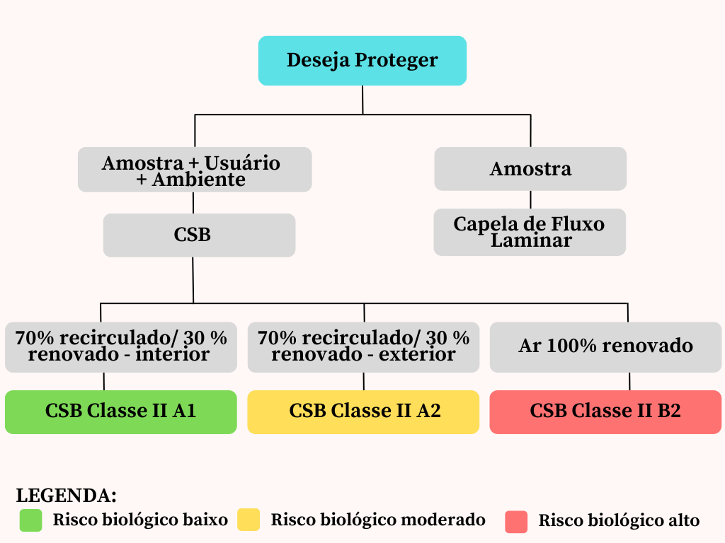 Deseja Proteger Amostra + Usuário Amostra + Ambiente CSB Capela de Fluxo Laminar 70% recirculado/ 70% recirculado/ renovado - interior renovado - exterior Ar 100% renovado CSB Classe II CSB Classe II A2 CSB Classe II B2 LEGENDA: Risco biológico baixo Risco biológico moderado Risco biológico alto