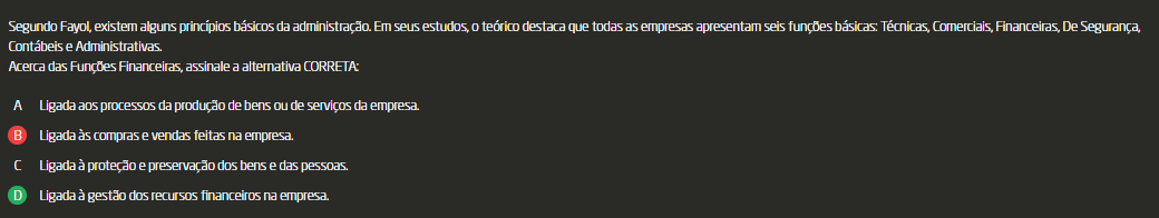 Segundo Fayol, existem alguns princípios básicos da administração. seus estudos, teórico destaca que todas as empresas apresentam seis funções Comerciais, Financeiras De Segurança, Contábeis e Acerca das Funções Financeiras, assinale a alternativa A Ligada aos processos da produção de bens ou de serviços da empresa Ligada às compras e vendas feitas na empresa Ligada à proteção e preservação dos bens e das pessoas Ligada à gestão dos recursos financeiros na empresa.