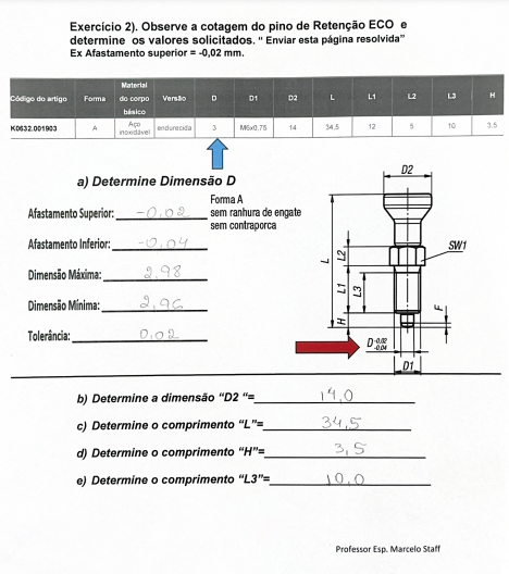 Exercício 2). Observe a cotagem do pino de Retenção ECO e determine os valores solicitados. Enviar esta página resolvida" Ex Afastamento superior = -0,02 mm. Material Código do artigo Forma do corpo Versão D D1 D2 L L1 L2 L3 H K0632.001903 A endurecida 3 14 12 5 10 3.5 D2 a) Determine Dimensão D Forma A Afastamento Superior: -0.02 sem ranhura de engate sem contraporca Afastamento Inferior: -0.04 SW1 I Dimensão Máxima: 2.98 Dimensão 2.96 H D 0.00 0.04 b) Determine a dimensão "D2"= c) Determine comprimento "L"= 34.5 d) Determine comprimento "H"= 3,5 e) Determine comprimento "L3"= Professor Esp. Marcelo Staff