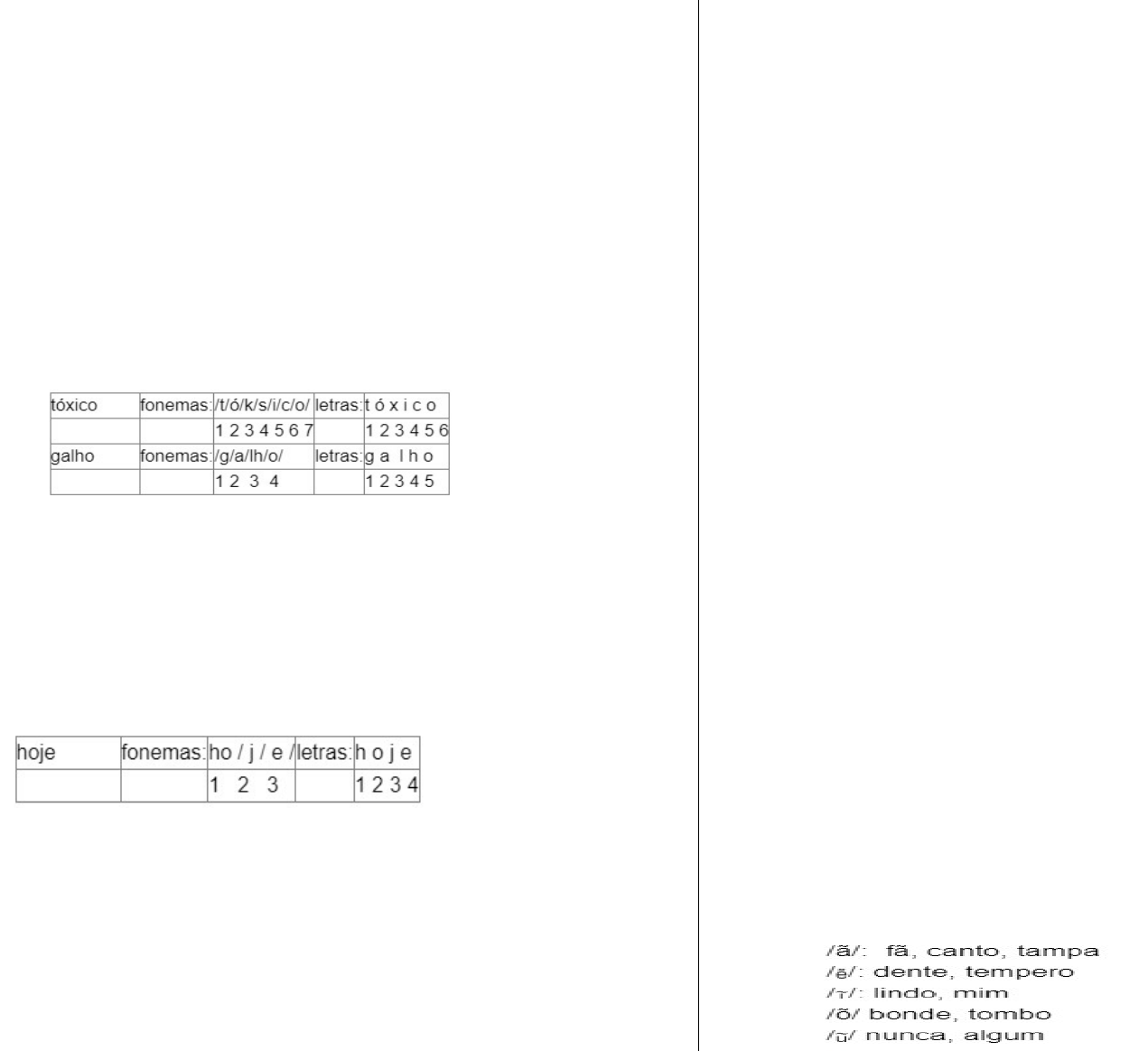 CURSO DUZERO - - Prof.ª Patrícia Rendall – Língua Portugues Fonema e letra 1) O fonema não deve ser confundido com a letra. Na língua escrita, representamos os fonemas por meio de sinais chamados letras. Portanto, letra é a representação gráfica do fonema. Na palavra sapo, por exemplo, a letra s representa o fonema /s/ (lê-se sê); já na palavra brasa, a letra s representa o fonema /z/ (lê-se zê). 2) Às vezes, o mesmo fonema pode ser representado por mais de uma letra do alfabeto. É o caso do fonema /z/, que pode ser representado pelas letras z, s, x. Ex: Zebra - casamento - exílio 3) Em alguns casos, a mesma letra pode representar mais de um fonema. A letra x, por exemplo, pode representar: - o fonema sê: texto - o fonema zê: exibir - o fonema chê: enxame - o grupo de sons ks: táxi 4) O número de letras nem sempre coincide com o número de fonemas. Exemplos: 5) As letras m e n, em determinadas palavras, não representam fonemas. Observe os exemplos: Compra - conta Nessas palavras, m e n indicam a nasalização das vogais que as antecedem. nave: o /n/ é um fonema; dança: o n não é um fonema; o fonema é /ã/, representado na escrita pelas letras a e n. 6) A letra h, ao iniciar uma palavra, não representa fonema. Exemplos: Atividades 1) Identifique o número de letras e de fonemas de cada palavra abaixo: a) Boca: ____________________________________________________________________ b) Hélice: ___________________________________________________________________ c) Alho: ____________________________________________________________________ d) Oferecimento: ____________________________________________________________ e) Tórax: ___________________________________________________________________ f) Pandemia: ________________________________________________________________ g) Canguru: _________________________________________________________________ h) Axila: ____________________________________________________________________ i) Nexo: ____________________________________________________________________ j) Baixa ____________________________________________________________________ 2) (ESA) O vocábulo cujo número de letras é igual ao número de fonemas está em: a) sucedida b) habitando c) grandes d) espinhos e) ressoou 3) (ESA) Nas palavras alma, pinto e porque, temos, respectivamente: a) 4 fonemas – 5 fonemas – 6 fonemas b) 5 fonemas – 5 fonemas – 5 fonemas c) 4 fonemas – 4 fonemas – 5 fonemas d) 5 fonemas – 4 fonemas – 6 fonemas e) 4 fonemas – 5 fonemas – 6 fonemas 4) (ESA) Indique a palavra que tem 5 fonemas: a) ficha b) molhado c) guerra d) fixo e) hulha Classificação dos fonemas Vogais: As vogais são os fonemas sonoros produzidos por uma corrente de ar que passa livremente pela boca. Em nossa língua, desempenham o papel de núcleo das sílabas. Assim, isso significa que em toda sílaba há necessariamente uma única vogal.Na produção de vogais, a boca fica aberta ou entreaberta. As vogais podem ser: a) Orais: quando o ar sai apenas pela boca. Ex: /a/, /e/, /i/, /o/, /u/. b) Nasais: quando o ar sai pela boca e pelas fossas nasais. Por exemplo: c) Átonas: pronunciadas com menor intensidade. Por exemplo: até, bola d) Tônicas: pronunciadas com maior intensidade. Por exemplo: até, bola Quanto ao timbre, as vogais podem ser: Abertas: Exemplos: pé, lata, pó - Fechadas: Exemplos: mês, luta, amor - Reduzidas - Aparecem quase sempre no final das palavras. Exemplos: dedo, ave, gente Semivogais: Os fonemas /i/ e /u/, algumas vezes, não são vogais. Aparecem apoiados em uma vogal, formando com ela uma só emissão de voz (uma sílaba). Nesse caso, esses fonemas são chamados de semivogais. A diferença fundamental entre vogais e semivogais está no fato de que estas últimas não desempenham o papel de núcleo silábico. Observe a palavra papai. Ela é formada de duas sílabas: pa-pai. Na última sílaba, o fonema vocálico que se destaca é o a. Ele é a vogal. O outro fonema vocálico i não é tão forte quanto ele. É a semivogal. Outros exemplos: saudade, história, série. Obs.: os fonemas /i/ e /u/ podem aparecer representados na escrita por "e", "o" ou "m". Veja: Consoantes: /b/, /t/, /d/, /v/, /l/, /m/, etc. Encontros Vocálicos: são agrupamentos de vogais e semivogais, sem consoantes intermediárias. São eles: Ditongo: É o encontro de uma vogal e uma semivogal (ou vice-versa) numa mesma sílaba. Pode ser: a) Crescente: quando a semivogal vem antes da vogal. Ex: sé-rie (i = semivogal, e = vogal) b) Decrescente: quando a vogal vem antes da semivogal. Ex: pai (a = vogal, i = semivogal) c) Oral: quando o ar sai apenas pela boca. Ex: pai, série d) Nasal: quando o ar sai pela boca e pelas fossas nasais. Ex: mãe Tritongo: É a sequência formada por uma semivogal, uma vogal e uma semivogal, sempre nessa ordem, numa só sílaba. Pode ser oral ou nasal. Exemplos: Paraguai - Tritongo oral - quão - Tritongo nasal Hiato: É a sequência de duas vogais numa mesma palavra que pertencem a sílabas diferentes, uma vez que nunca há mais de uma vogal numa sílaba. Ex: saída (sa-í-da) poesia (po-e-si-a) Saiba que: - Na terminação -em em palavras como ninguém, também, porém e na terminação -am em palavras como amaram, falaram ocorrem ditongos nasais decrescentes. - É tradicional considerar hiato o encontro entre uma semivogal e uma vogal ou entre uma vogal e uma semivogal que pertencem a sílabas diferentes, como em ge-lei-a, io-iô. Atividades 1) Marque a alternativa cujas palavras apresentem encontros vocálicos classificados como DITONGOS: a) Saíram – bebedouro – caranguejo; b) Extinguir – iguais – ação; c) Circuito – trouxeram – diáspora; d) Cabeleireiro – gênio – tireoide; e) Atuou – Mooca – alguém. 2) Em qual das alternativas as palavras apresentam, respectivamente, um Hiato, um Ditongo e um Tritongo? a) Diáspora – balões – Paraguai; b) Saíram – ruim – Paraguai; c) Caetano – mãe – saí