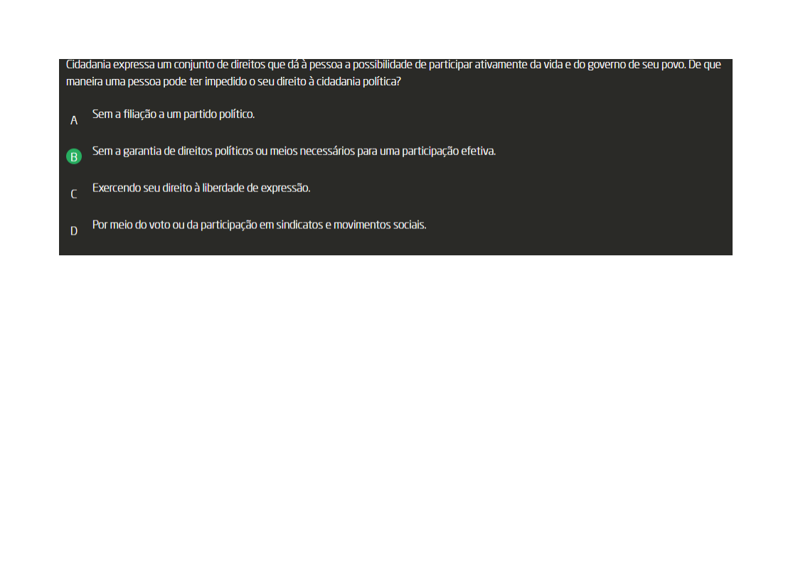 Cidadania expressa um conjunto de direitos que à pessoa a possibilidade de participar ativamente da vida e do governo de seu De que maneira uma pessoa pode ter impedido seu direito à cidadania política? A Sem a filiação a um partido político. B Sem a garantia de direitos políticos ou meios necessários para uma participação efetiva. C Exercendo seu direito à liberdade de expressão. D Por meio do voto ou da participação em sindicatos e movimentos sociais.