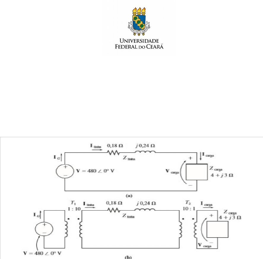 UNIVERSIDADE FEDERAL DO CEARÁ LISTA DE EXERCÍCIOS – CONVERSÃO ELETROMECÂNICA DE ENERGIA 1 - Um sistema de potência monofásico consiste em um gerador de 480 V e 60 Hz alimentando uma carga Zcarga = 4 + j3 Ω por meio de uma linha de transmissão de impedância Zlinha = 0,18 + j0,24 Ω. Responda às seguintes perguntas sobre esse sistema. Figura 1 a) Se o sistema de potência for exatamente como o recém-descrito (e mostrado na Figura 1) , qual será a tensão sobre a carga? Quais serão as perdas na linha de transmissão? (b) Suponha que um transformador elevador de tensão 1:10 seja colocado na extremidade da linha de transmissão que está junto ao gerador. Um outro transformador abaixador 10:1 é colocado na extremidade da linha de transmissão que está junto à carga (como mostrado na Figura 1-b). Agora, qual será a tensão sobre a carga? Quais serão as perdas na linha de transmissão? 2 – Um transformador de distribuição, com valor nominal de placa de identificação de 100 kVA, 1100/220V,60Hz,tem uma resistência no enrolamento de alta tensão de 0,1 Ω e uma reatância de dispersão de 0,3Ω. A resistência do enrolamento de baixa tensão é 0,012Ω. A fonte é aplicada no lado de alta tensão. a) Calcule a resistência e a reatância equivalente no lado de baixa e de alta tensão. b) Calcule a queda de tensão na resistência e na reatância equivalente no primário. 3 – Um transformador monofásico, 10KVA , 220 V/ 110V , 60 Hz é conectado a um alimentador de 220 V. O transformador drena da rede sua corrente nominal com fator de potência 0,8 adiantado. O transformador pode ser considerado ideal. a) Determine a potência aparente da carga. b)Determine a impedância da carga. Resolva a questão novamente colocando agora um fator de potência 0,8 atrasado. 4 - Um transformador monofásico, 10KVA , 2400 V/ 120V , 60 Hz tem os seguintes parâmetros de circuito equivalente : Zeq. Alta = 5 + j25 ; Rc.alta = 64KΩ ; Xm. Alta = 9,6 < 90 º. a) Calcule as medições realizadas no ensaio de curto circuito : Icc, Vcc, Pcc. b) Calcule as medições realizadas no ensaio de circuito aberto : Ica, Vca, Pca. c) Comente sobre a representação do transformador em seu modelo L e no modelo H. 5 - As impedâncias do circuito equivalente de um transformador de 20 kVA, 8.000/240 V e 60 Hz devem ser determinadas. O ensaio a vazio foi efetuado no lado secundário do transformador (para reduzir a tensão máxima a ser medida) e o ensaio de curto-circuito foi realizado no lado primário do transformador (para reduzir a corrente máxima a ser medida). Os seguintes dados foram obtidos: Vca =240 V ; Ica = 7,133 A ; Pca = 400 W; Vcc = 489 V ; Icc = 2,5A; Pcc = 240 W. Encontre as impedâncias do circuito equivalente aproximado, referido ao lado do primário, e faça um desenho esquemático desse circuito. 6 - Um transformador de 15 kVA e 2300/230 V deve ser testado para determinar os componentes do ramo de excitação, as impedâncias em série e a sua regulação de tensão. Os seguintes dados foram obtidos durante os ensaios com o transformador: Vca =230 V ; Ica = 2,1 A ; Pca = 50 W; Vcc = 47 V ; Icc = 6,0 A; Pcc = 160 W. a) Encontre o circuito equivalente desse transformador referido ao lado de alta-tensão. b) Calcule a regulação de tensão a plena carga para o fator de potência de 0,8 atrasado, o fator de potência 1,0 e o fator de potência 0,8 adiantado. e) Faça os diagramas fasoriais do item b. d) Qual é a eficiência do transformador a plena carga para um fator de potência 0,8 atrasado? 7 – Um autotransformador abaixador deve ser usado para dar partida em um motor de indução, a fim de limitar o modulo da corrente de partida a um nível aceitável, que é conhecido com 34A, para uma tensão nominal de linha de 230V, o autotransformador deve ser regulado em um ponto de derivação de 80%. a) Mostre o diagrama esquemático do arranjo do dispositivo de partida do autotransformador, com as tensões claramente indicados. b) Qual o valor da corrente na bobina comum. c) Determine a corrente na entrada do autotransformador. d) Determine a potência aparente dos transformadores. 8 - Um transformador monofásico ideal tem os seguintes dados nominais: 100KVA , 11,0kV/2,2KV. Uma carga de S = 120ej30º deve ser alimentado com uma tensão de 2,2 KV a partir de uma fonte de tensão de 13,2KV. a) Como os enrolamentos do transformador podem ser conectados para que a carga seja atendida ? b) Quais são as correntes nos enrolamentos e na carga ? 9 - Um transformador de 100VA e 120/12 V deve ser conectado de forma que opere como um autotransformador elevador. Uma tensão primária de 120 V é aplicada ao transformador. a) Qual é a tensão secundária do transformador? b) Qual é a máxima especificação nominal de volts-ampères nesse modo de operação? c) Calcule qual é a vantagem de potência aparente nominal dessa conexão como autotransformador sobre a potência aparente nominal do transformador quando está operando de forma convencional em 120/12 V. 10 – Um transformador monofásico, 10 KVA,460/120V, 60 Hz possui uma eficiência de 96% quando entrega 9KW e um fator de potência de 0,9. Este transformador é conectado como um autotransformador para fornecer carga a um circuito de 460V a partir de uma fonte de 580 V. a) Mostre a conexão do autotransformador. b) Determine a máxima potência aparente que o autotransformador pode fornecer a um circuito de 460 V. c) Determine a eficiência do autotransformador para carga total com um fator de potência de 0.9. 11 - Um engenheiro tem à sua disposição três transformadores idênticos com os seguintes dados e parâmetros nominais: 150kVA, 2400/240V e Zeq = 0,5 + j1,5Ω referida no lado de alta. Ele deve montar um banco 3φ 2400:240√3V para atender uma carga 3φ de 240√3V (linha), 450kVA e fator de potência 0,92 (atrasado). a) Qual deve ser a conexão do primário e a do secundário? Comente sobre este tipo de ligação. b) Qual deve