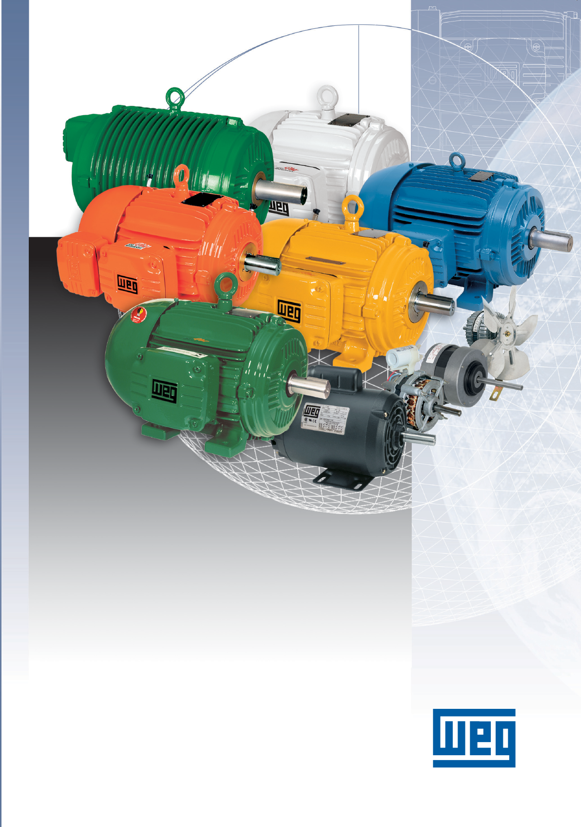 Motores Elétricos Linhas de Produtos Características Especificações Instalações Manutenções M o to re s E lé tr ic o s - Li nh as d e P ro du to s - C ar ac te rí st ic as - E sp ec ifi ca çõ es - In st al aç õe s - M an ut en çõ es GARANTIA A WEG oferece garantia contra defeitos de fabricação ou de materiais para seus produtos por um período de 18 meses contados a partir da data de emissão da nota fiscal fatura da fábrica ou do distribuidor/revendedor limitado a 24 meses da data de fabricação independentemente da data de instalação e desde que satisfeitos os seguintes requisitos: transporte, manuseio e armazenamento adequado; instalação correta e em condições ambientais especificadas e sem presença de agentes agressivos;operação dentro dos limites de suas capacidades; realização periódica das devidas manutenções preventivas;realização de reparos e/ou modificações somente por pessoas autorizadas por escrito pela WEG; o produto na ocorrência de uma anomalia esteja disponível para o fornecedor por um período mínimo necessário a identificação da causa da anomalia e seus devidos reparos; aviso imediato por parte do comprador dos defeitos ocorridos e que os mesmos sejam posteriormente comprovados pela WEG como defeitos de fabricação. A garantia não inclui serviços de desmontagem nas instalações do comprador, custos de transporte do produto e despesas de locomoção, hospedagem e alimentação do pessoal de Assistência Técnica quando solicitado pelo cliente. Os serviços em garantia serão prestados exclusivamente em oficinas de Assistência Técnica autorizados pela WEG ou na própria fábrica. Excluem-se desta garantia os componentes cuja vida útil em uso normal seja menor que o período de garantia. O reparo e/ou distribuição de peças ou produtos a critério da WEG durante o período de garantia, não prorrogará o prazo de garantia original. A presente garantia se limita ao produto fornecido não se responsabilizando a WEG por danos a pessoas, a terceiros, a outros equipamentos ou instalações, lucros cessantes ou quaisquer outros danos emergentes ou conseqüentes. ASSISTÊNCIA TÉCNICA Dispomos de assistentes técnicos abrangendo todo o território nacional WEG MOTORES Jaraguá do Sul - SC - Tel (47) 3276-4000 - Fax (47) 3276-4020 São Paulo - SP - Tel (11) 5053-2300 - Fax (11) 5052-4212 www.weg.net / motores@weg.net M od . 0 50 .0 5/ 04 20 07 - Su je ito a a lte ra çõ es s em a vi so p ré vi o. A s in fo rm aç õe s co nt id as s ão v al or es d e re fe rê nc ia . O motor elétrico tornou-se um dos mais notórios inventos do homem ao longo de seu desenvolvimento tecnológico. Máquina de construção simples, custo reduzido, versátil e não poluente, seus princípios de funcionamento, construção e seleção necessitam ser conhecidos para que ele desempenhe seu papel relevante no mundo de hoje. Através de uma linguagem simples e objetiva, este manual visa facilitar o trabalho de quem especifica, compra e vende motores elétricos. Este material abrange todos os motores de baixa tensão – assíncronos de indução, monofásicos e trifásicos, com rotor de gaiola – produzidos pela WEG, a maior fabricante de motores elétricos da América Latina e uma das maiores do mundo. Ta m pa d ef le to ra Pi no e lá st ic o Ve nt ila do r Ta m pa tr as ei ra An el V 'R in g Ol ha l Pl ac a de Id en tif ic aç ão Ca rc aç a Ar ru el a On du la da Ro la m en to Ro to r Ch av et a An el F ix aç ão Ta m pa D ia nt ei ra Ro la m en to An el V 'R in g Ca ix a de L ig aç ão Ta m pa d a Ca ix a de L ig aç ão Linhas de produtos Motor Trifásico IP55 ........................................................................... A-3 Motor Trifásico Alto Rendimento Plus ................................................. A-3 Motor Linha WELL (Alto Rendimento Plus) ......................................... A-4 Motor Wmining (Alto Rendimento Plus) ............................................. A-4 Motores Table Motor (Alto Rendimento Plus) ...................................... A-5 Motor Linha Wwash (Alto Rendimento Plus) ....................................... A-5 Motor Trifásico Inverter Duty TEBC ..................................................... A-6 Motor Trifásico à Prova de Explosão .................................................... A-6 Motor Trifásico Não Acendível ............................................................ A-7 Motor Trifásico para Bomba de Combustível ....................................... A-7 Motor Trifásico para Bomba Monobloco ............................................. A-8 Motor Trifásico tipo Motofreio ............................................................. A-8 Motor Trifásico tipo Motosserra .......................................................... A-9 Motor Trifásico Dahlander IP55 (duas velocidades) ............................. A-9 Motor Trifásico NEMA 56 ................................................................ A-10 Motor Trifásico Jet Pump .................................................................. A-10 Motores para Redutores - Tipo 1 ....................................................... A-11 Motofreio para Redutores - Tipo 1 .................................................... A-11 Motores Monofásicos com Capacitor Permanente ............................ A-12 Motor Monofásico IP55 – Uso Rural ................................................. A-12 Motor Monofásico Jet Pump com flange incorporada ....................... A-13 Motor Monofásico Jet Pump Split-phase .......................................... A-13 Motor Monofásico Jet Pump Capacitor de Partida ............................. A-14 Motores Monofásicos NEMA 48 e 56 ............................................... A-14 Motores para lavadoras automáticas e semi-automáticas .................. A-15 Motor para Condicionadores de Ar .................................................. A-15 Mini-motor 