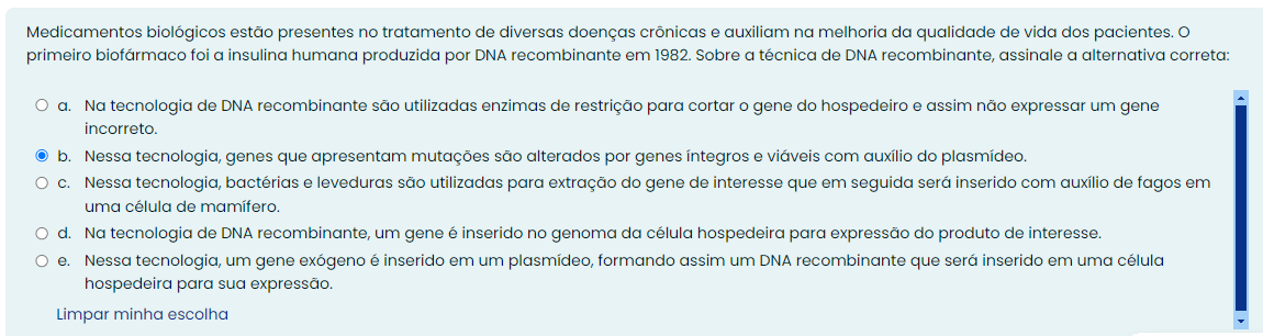 Medicamentos biológicos estão presentes no tratamento de diversas doenças crônicas e auxiliam na melhoria da qualidade de vida dos pacientes. primeiro foi a insuling humana produzida por DNA recombinante em 1982. Sobre a técnica de DNA recombinante, a alternativa correta: a. Na tecnologia de DNA recombinante são utilizadas enzimas de restrição para cortar O gene do hospedeiro e assim não expressar um gene incorreto. b. Nessa tecnologia, genes que apresentam mutações são alterados por genes e viáveis com auxílio do C. Nessa tecnologia, bactérias e leveduras são utilizadas para extração do gene de interesse que em seguida será inserido com auxílio de fagos em uma célula de mamifero. d. Na tecnologia de DNA recombinante, um gene é inserido no genoma da célula hospedeira para expressão do produto de interesse. e. Nessa tecnologia, um gene exógeno é inserido em um formando assim um DNA recombinante que será inserido em uma célula hospedeira para sua expressão. Limpar minha escolha