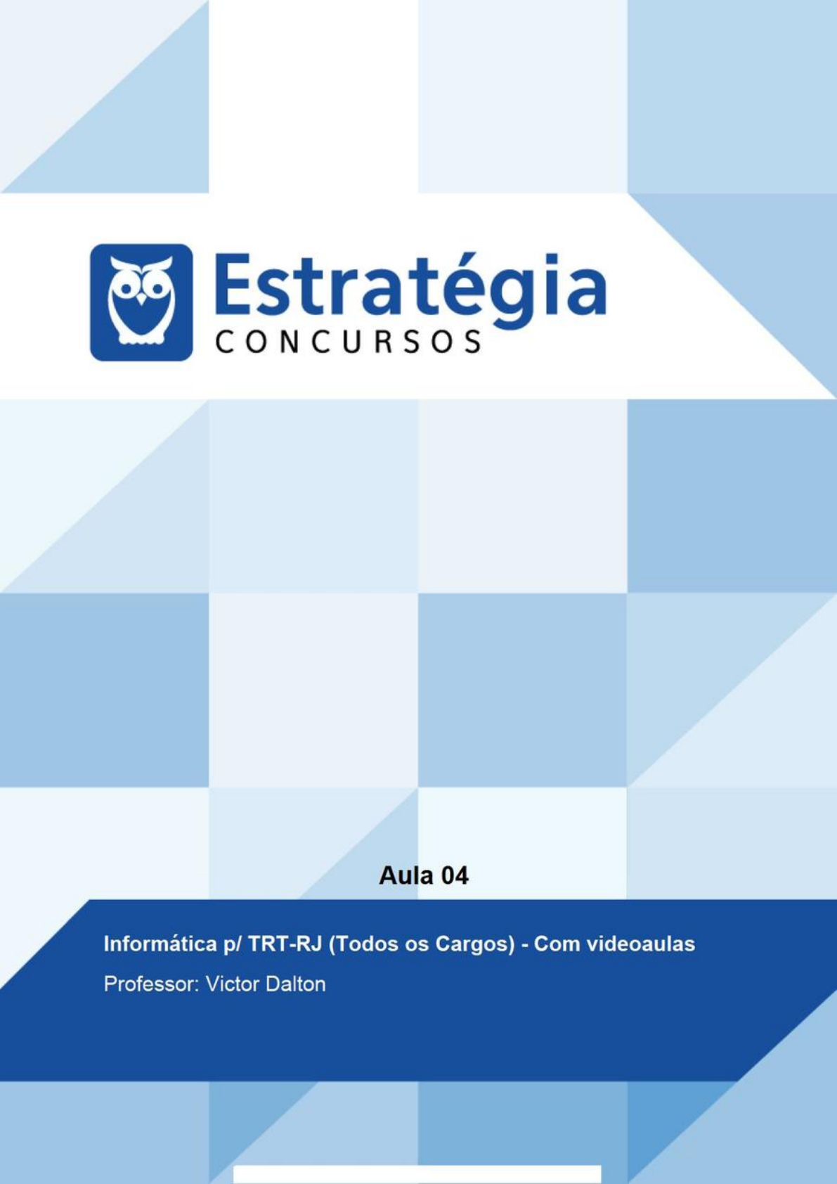 Informática para TRT 1ª Região Todos os Cargos Prof Victor Dalton ʹ Aula 04 Prof. Victor Dalton www.estrategiaconcursos.com.br 2 de 92 Olá amigos e amigas! Para esta aula, saiba que o Microsoft Powerpoint é a ferramenta da “tríade Office” que menos cai em provas. Mesmo assim, o nosso estudo possuirá a mesma qualidade das demais ferramentas Office já estudadas, não se preocupe. Aos estudos! Observação importante: este curso é protegido por direitos autorais (copyright), nos termos da Lei 9.610/98, que altera, atualiza e consolida a legislação sobre direitos autorais e dá outras providências. Grupos de rateio e pirataria são clandestinos, violam a lei e prejudicam os professores que elaboram os cursos. Valorize o trabalho de nossa equipe adquirindo os cursos honestamente através do site Estratégia Concursos ;-) Informática para TRT 1ª Região Todos os Cargos Prof Victor Dalton ʹ Aula 04 Prof. Victor Dalton www.estrategiaconcursos.com.br 5 de 92 1.1 Glossário Antes de conhecermos as funcionalidades do PowerPoint, é interessante destrincharmos alguns conceitos que serão essenciais para o nosso estudo. APRESENTAÇÃO É o arquivo que o PowerPoint trabalha e manipula. Seus principais formatos são o *.pptx e o *ppt (formato PowerPoint 97 - 2003). É o arquivo que você salva, e o mesmo que você “dá um clique duplo” quando deseja modificá-lo. Ao abrir uma apresentação em branco no PowerPoint, ele recebe automaticamente o nome de Apresentação1, até que o usuário opte por salvá-la com outro nome. À medida que novas apresentações são abertas, o PowerPoint automaticamente segue a sequência numérica, chamando-o de Apresentação2, Apresentação3, e assim sucessivamente. SLIDE É a unidade básica da apresentação. Uma apresentação é um conjunto de slides. Nos slides é que os dados e elementos audiovisuais são inseridos, de maneira lógica e organizada. FAIXA DE OPÇÕES A Faixa de Opções é a estrutura do PowerPoint que substitui a tradicional estrutura de Menu dos aplicativos. Por meio dela, os usuários interagem com as funcionalidades que o PowerPoint disponibiliza. A Faixa de Opções é mais vantajosa que a estrutura convencional de Menu. Ela é personalizável, e dotada de inteligência. Por exemplo, a Faixa Informática para TRT 1ª Região Todos os Cargos Prof Victor Dalton ʹ Aula 04 Prof. Victor Dalton www.estrategiaconcursos.com.br 6 de 92 de Opções se adapta ao tamanho disponível para a janela do aplicativo, e procura mostrar as funcionalidades mais importantes de acordo com o tamanho disponível. Além disso, a Faixa de Opções organiza suas ferramentas em Guias, que podem ser alternadas por meio do clique com o mouse sobre elas. Faixas de Opções em destaque. Perceba, na figura acima e abaixo, que os diferentes tamanhos de tela fazem a Faixa se ajustar automaticamente. Página Inicial, Inserir e Design, assim como os outros, são Guias. BACKSTAGE O Backstage, representado pela Guia Arquivo, não é considerado elemento da Faixa de Opções. É uma Guia diferenciada que serve para a utilização de funções rotineiras, como Abrir novo arquivo, Salvar, Imprimir, além de funções como a Conta do usuário ativa e a aba Opções, importantíssima para a configuração de vários aspectos do PowerPoint, de forma geral. Informática para TRT 1ª Região Todos os Cargos Prof Victor Dalton ʹ Aula 04 Prof. Victor Dalton www.estrategiaconcursos.com.br 8 de 92 GRUPO DE COMANDO O Grupo de Comando é um subconjunto de itens, dentro de alguma Guia, que organiza os comandos segundo algum critério lógico. FERRAMENTAS DE ACESSO RÁPIDO Situada acima da Faixa de Opções, oferece atalhos como Salvar (CTRL + B), Desfazer(CTRL + Z), Refazer(CTRL + Y), e pode ser personalizada, por meio do último botão à direita. Ferramentas de acesso rápido. BARRA DE STATUS Localizada na parte inferior do aplicativo. No canto esquerdo, informa o slide da apresentação que está sendo exibido, e o idioma padão do aplicativo. Na parte inferior direita, oferece formas de visualização e zoom da apresentação. Barra de Status: ilustração. Informática para TRT 1ª Região Todos os Cargos Prof Victor Dalton ʹ Aula 04 Prof. Victor Dalton www.estrategiaconcursos.com.br 9 de 92 2. Principais novidades da versão 2016 do PowerPoint 2.1 Em relação ao PowerPoint 2013 Diga-me Na Faixa de Opções, após as Guias tradicionais das ferramentas, encontra-se disponível uma caixa de busca rotulada Diga-me o que você deseja fazer. É uma caixa inteligente, para que o usuário digite qual recurso ou funcionalidade ele está procurando, para que a ferramenta aponte o que provavelmente irá ajudar o usuário. Diga-me o que você deseja fazer, no PowerPoint 2016. Ao buscar por “anima”, o PowerPoint dinamicamente apresentou itens relacionados à busca do usuário. Inserção de fórmulas matemáticas: No PowerPoint 2016, já é possível inserir uma fórmula matemática em um arquivo usando uma caneta ou o dedo em um dispositivo sensível ao toque. A inserção de notação matemática diretamente suplementa o Equation Editor. Informática para TRT 1ª Região Todos os Cargos Prof Victor Dalton ʹ Aula 04 Prof. Victor Dalton www.estrategiaconcursos.com.br 10 de 92 2.2 Em relação ao Powerpoint 2010 Funcionalidade Windows 8: Quando aberto no Windows 8, ele tem a nova aparência elegante do Windows 8 e incorpora as tecnologias de toque desenvolvidas para tablets e aparelhos eletrônicos móveis. Tela inicial: O PowerPoint abre em uma tela que dá acesso a modelos de apresentações, às apresentações recentes e aos locais nos quais apresentações já criadas podem estar armazenadas. Acesso à nuvem: Ao conectar o Office ou PowerPoint a uma conta da Microsoft ou a uma conta Office 365, você tem a opção de salvar as apresentações no SharePoint ou no SkyDrive. Após salvar uma apresentação em um local compartilhado, você e as pessoas que compartilham e