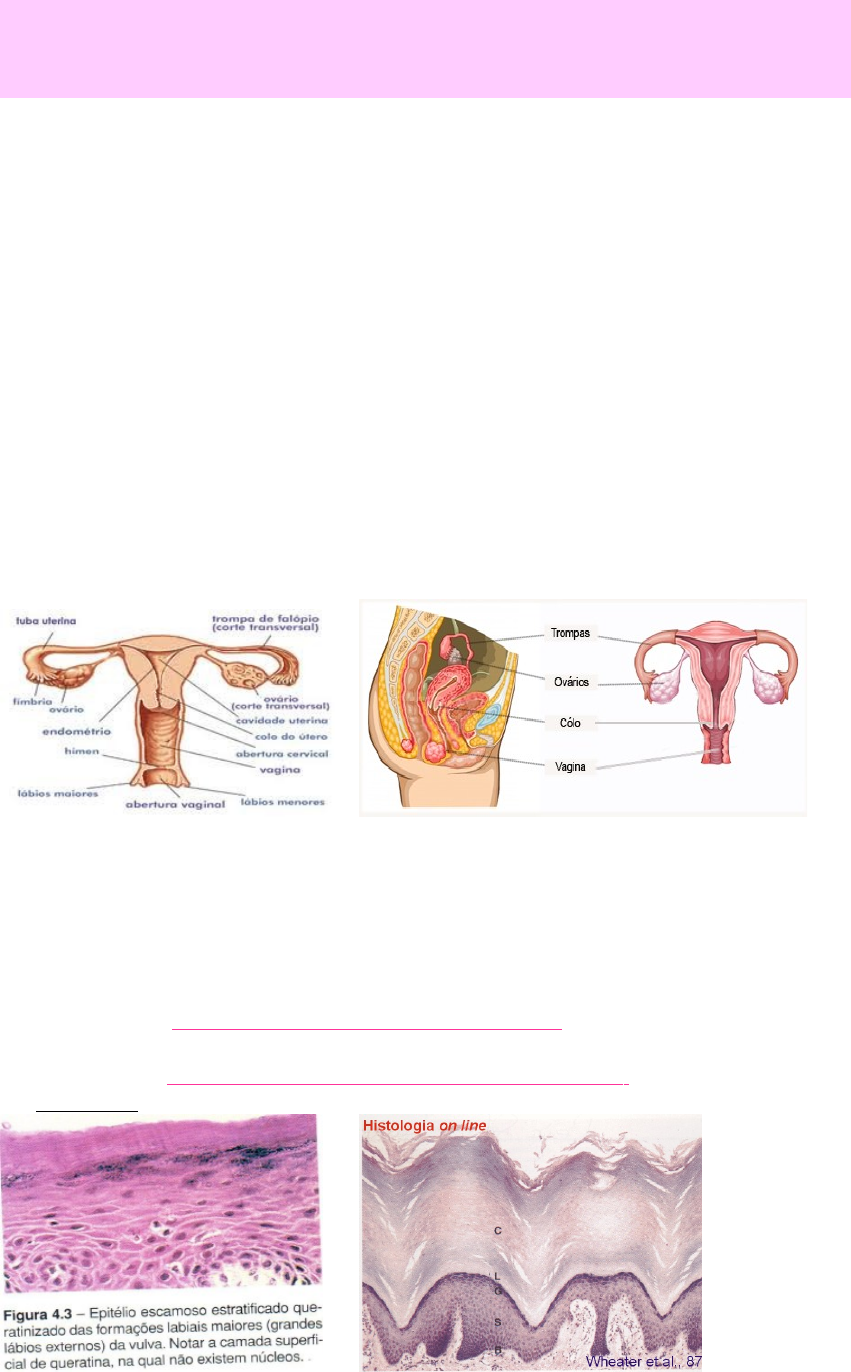 ANATOMIA E HISTOLOGIA DO TRATO GENITAL FEMININO O Sistema Genital Feminino é constituído por: Órgãos Externos: · Vulva: porção mais externa da genitália feminina. · Composta por: a) Monte pubiano: proeminência logo acima da sínfise púbica. b) Lábios maiores e lábios menores. c) Vestíbulo: espaço que compreende uretra e abertura vaginal d) Clitóris e) Meato uretral f) Glândulas de Bartholin (função importante durante o ato sexual, lubrificação inicial. Essas glândulas em algumas mulheres podem sofrer um processo de infecção, formando cistos, chamado cistos de Bartholin) Órgãos Internos: a) Vagina b) Útero c) Tubas ou trompas de falópio d) Ovários Histologia do TGF O trato genital feminino apresenta vários tipos de epitélio e tecidos de sustentação. 1) Epitélio Escamoso ou Queratinizado · Semelhante ao epitélio escamoso estratificado, com exceção da presença de uma camada superficial que contém células queratinizadas anucleadas. · Contém grânulos de eleidina, um pigmento derivado da queratina. · Este epitélio é encontrado na pele, nos lábios maiores da vagina, e em algumas condições patológicas da vagina, do colo e do endométrio. 2) Epitélio Escamoso Estratificado Não-Queratinizado · Reveste os pequenos lábios da vulva, a vagina (paredes internas), e uma porção do colo uterino (ectocérvice). · Pode ser dividido esquematicamente em quatro zonas ou camadas: · Camada Basal (A) · Parabasal (B) · Camada Intermediária (C) · Camada Superficial (D) · Camada Basal do epitélio (A): é composta por uma única camada de célula pequenas, situadas sobre a lâmina basal. · As células da camada basal representam a principal área de atividade mitótica, permitindo a renovação do epitélio a cada 4 dias em média. · Qualquer aumento anormal no número de células da camada basal é conhecido como hiperplasia de células basais do epitélio escamoso. · Em condições normais, as células da camada basal raramente aparecem nos esfregaços cérvico-vaginais de mulheres no período fértil. · Podem ser comuns em esfregaços atróficos produzidos por condições inflamatórias, pós-menopausa, ou antes do primeiro ciclo menstrual. -Principal área de atividade mitótica: é o que leva a célula a ser indiferenciada, pois ela sofre mitose e pela ação dos hormônios se diferencia em outras células, célula que tem alta capacidade de fazer mitose são células jovens e elas não possuem proteínas de defesa. (Proteína PRB e proteína B54, são as duas proteínas mais importantes e são chamadas de anti-oncogênicas, que são expressas por células maduras) - Células basais em condições normais não costumam aparecer no esfregaço de mulheres em período férteis - Podem aparecer em esfregaços atróficos (antes do primeiro ciclo menstrual ou mulheres em menopausa) - Pode aparecer em esfregaços com infecção e em processos inflamatórios intensos. · Camada Parabasal do epitélio (B): · Pode apresentar várias camadas de células, maiores que as da camada basal. · As células são esféricas com diâmetro de ± 15 μm, núcleos relativamente grandes (8 a 10 μm). · Os núcleos são circundados por pouco citoplasma. (Características de célula jovem) · A diferenciação e a maturação das células parabasais levam à formação da camada de células intermediárias. · Camada Intermediária do epitélio (C): é constituída por várias camadas de células, cujo tamanho vai aumentando à medida que se aproximam da superfície epitelial. · As células medem de 15 a 40 μm de diâmetro e seus núcleos de 8 a 10 μm. · Os núcleos são esféricos e sua cromatina é finamente granular. · O citoplasma é basofílico e contém glicogênio. · A quantidade de glicogênio aumenta sob efeito da progesterona e pode ser significativa durante a gravidez. · Estas células estão unidas entre si por numerosas junções celulares (desmossomos), fato que explica sua descamação na forma de agrupamentos. 2° fase do ciclo (progesterona) se tem a maior quantidade de células intermediárias, se tem um fenômeno fisiológico que é chamado de citólise, a citólise é produzida por bacilos de doderlein ou lactobacilos, para os lactobacilos consumirem o glicogênio eles precisam lisar as células, e esse fenômeno é característica da segunda fase do ciclo. Aparece em áreas da lâmina resto de membrana celular rodeado por lactobacilos e núcleos nus (núcleo sem citoplasma). O lactobacilo quebra o glicogênio para consumo, nessa quebra do glicogênio é feito ácido lático, e esse ácido é responsável por manter o pH vaginal ácido. Comum em final de segunda fase e na gestação. (Quanto mais citólise acontecer mais acidifica o Ph. Gestante tem muito consumo de glicogênio, e a candidíase se prolifera em pH ácido. A vaginose é uma síndrome; alcaliniza o pH vaginal, pois não tem o lactobacilos para realizar o controle desequilíbrio. · Camada Superficial do epitélio (D): é composta por 3 a 6 camadas de células maiores (50 a 60 μm). · Constituem a fase final de maturação do epitélio escamoso. · Nas camadas mais superficiais apresentam núcleos picnóticos (5 a 6 μm), circundados por área de citoplasma mais claro (halo), que corresponde ao espaço antes ocupado pelo núcleo. · Nas camadas superficiais, as junções celulares deixam de existir e as células descamam isoladas. · Ao contrário do epitélio queratinizado, as células conservam seus núcleos e não sofrem queratinização, exceto em condições patológicas. · Lâmina basal: · O epitélio escamoso repousa sobre uma membrana basal, a qual serve como elemento de separação entre ele e a lâmina basal. · A lâmina basal é composta por colágeno e outras proteínas fibrilares. · Eventuais rupturas da membrana basal são importantes na definição do caráter invasivo das alterações epiteliais malignas. · As células malignas precisam atravessar a membran