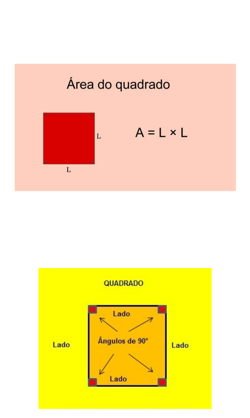Área do quadrado Área é a medida de uma superfície plana. Os quadrados são figuras geométricas planas que possuem quatro lados iguais e quatro ângulos internos de mesma medida. Fórmula da área do quadrado A = L × L Em que: A: área do quadrado; L: medida do lado do quadrado. Exemplo: Calcule a área de uma quadrado cujo lado mede 6 cm. A = 6 cm × 6 cm = 36 cm² O que significa a área do quadrado? Se um quadrado possui lado igual a 4 m, pela fórmula que aprendemos, podemos ver que sua área é igual a 16 m². A = 4 m × 4 m = 16 m² Mas o que isso significa? A unidade padrão de medida de área é o metro quadrado (m²). Cada 1 m² equivale ao espaço ocupado por um quadrado de lado 1 m. Assim, a área de um quadrado ser igual a 16 m², significa que sua superfície pode ser preenchida exatamente com 16 quadrados de lado 1 m. Veja a representação na figura abaixo. Cabem exatamente 16 quadrados azuis no quadrado maior, cuja área é 16 m². Área do Retângulo Exemplo Dado o retângulo a seguir, medindo 40 cm de base e 4 cm de altura. Calcule a área do retângulo. Para realizar o cálculo, basta aplicar a fórmula apresentada acima: A = b . h A = 40 . 4 A = 160 cm² ATIVIDADES 1) Qual é a área da região retangular cujas medidas são 24 m por 12,5 m? 2) Calcule a área de um retângulo cujo comprimento é 45 metros e a largura é 38 metros. 3) Qual a área de um quadrado que tem 8m de lado? 4) Um quadrado tem 400m² de área. Qual a medida do lado? 5) A área de um quadrado é 25m². Qual a medida do lado? 6) Calcule a área de um retângulo cujo comprimento é 45 metros e a largura é 38 metros. 7) O perímetro de um quadrado mede 40 cm. Calcule a área do quadrado. 8) Calcule a área de um retângulo cuja base mede 8cm e a altura é igual a quinta parte da base. image1.jpeg image2.jpeg image3.jpeg image4.jpeg
