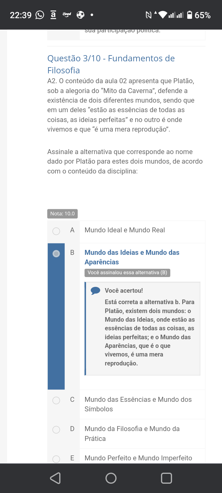 22:39 a N A all 65% sua par Questão 3/10 - Fundamentos de Filosofia A2. o conteúdo da aula 02 apresenta que Platão, sob a alegoria do "Mito da Caverna", defende a existência de dois diferentes mundos, sendo que em um deles "estão as essências de todas as coisas, as ideias perfeitas" e no outro é onde vivemos e que "é uma mera reprodução". Assinale a alternativa que corresponde ao nome dado por Platão para estes dois mundos, de acordo com o conteúdo da disciplina: Nota: 10.0 A Mundo Ideal e Mundo Real B Mundo das e Mundo das Aparências Você assinalou essa alternativa (B) Você acertou! Está correta a alternativa b. Para Platão, existem dois mundos: o Mundo das Ideias, onde estão as essências de todas as coisas, as perfeitas; e o Mundo das Aparências, que é o que vivemos, é uma mera reprodução. C Mundo das Essências e Mundo dos Símbolos D Mundo da Filosofia e Mundo da Prática E Mundo Perfeito e Mundo Imperfeito