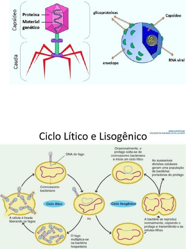 MICROBIOLOGIA E PARASITOLOGIA GERAL VÍRUS Os vírus são organismos simples, formados por material genético envolvido em uma cápsula protetora. Por dependerem de outros seres para desempenharem suas atividades e pela capacidade de infectar organismos vivos, os vírus são considerados parasitas intracelulares obrigatórios. Por tanto, a seguir temos algumas características principais dos vírus: · VÍRUS NÃO POSSUEM CÉLULAS Os vírus são seres acelulares, ou seja, não apresentam membrana plasmática, citoplasma e nem organelas. Pelo fato de não possuírem organização celular, muitos autores dizem que os vírus não são seres vivos e, por isso, eles não estão inseridos na classificação dos domínios (Archaea, Bacteria e Eukarya) e reinos (Monera, Protista, Fungi, Plantae e Animalia) da natureza. Entretanto, os que defendem que os vírus são seres vivos levam em consideração a presença de material genético, sua capacidade de se reproduzir, através de uma célula viva, e a ocorrência de mutações, que os fazem evoluir. · VÍRUS SÃO SERES MICROSCÓPICOS O tamanho de um vírus varia de 20 a 300 nm. Eles são menores que as bactérias, que apresentam 0,2 a 1,5 μm de comprimento, e, por isso, existem vírus que são parasitas desses seres. Por possuírem dimensões ultramicroscópicas, os microscópios eletrônicos, que ampliam em mais de 100 000 vezes uma imagem, são os aparelhos utilizados para visualizar a estrutura de um vírus. · VÍRUS POSSUEM ESTRUTURA SIMPLES O vírus é composto de material genético, a maioria possui DNA ou RNA, revestido por uma cápsula de proteínas protetora chamada de capsídeo. Quimicamente, um vírus é formado basicamente por proteínas e ácido nucleico. Entretanto, outros componentes, como carboidratos e lipídios, podem estar presentes em um envoltório que envolve o capsídeo. Embora possuam estrutura simples, os vírus possuem formas diversificadas. · VÍRUS SÃO PARASITAS INTRACELULARES Como os vírus não possuem células e nem metabolismo próprio, esses seres desenvolvem suas atividades ao invadir uma célula viva para aproveitar seus recursos e se multiplicarem. Durante uma infecção viral, o vírus incorpora o seu material genético no DNA da célula infectada. A estrutura do vírus é formada por substâncias em sua superfície que reconhecem o tipo de célula que ele é capaz de penetrar e parasitar. · VÍRUS PARASITAM DETERMINADOS TIPOS DE CÉLULAS Os vírus podem ser classificados de acordo com os tipos de organismos que infectam. Confira alguns exemplos: · Vírus de animais · Vírus de plantas · Bacteriófagos: vírus que infectam bactérias · Micófagos: Vírus que infectam fungos · Virófagos: Vírus que infectam outros vírus · Vírus se reproduzem em células vivas Os vírus necessitam de uma célula viva para se reproduzirem, pois eles não são capazes de se multiplicarem sozinhos. Para invadir uma célula, os vírus fixam-se na parede celular e injetam seu material genético, que é replicado enquanto a célula desempenha suas funções. Quando se multiplicam, os vírus rompem a célula hospedeira e liberam novas estruturas em um processo chamado de ciclo lítico. Os vírus também podem manter seu material genético na célula parasitada e transmitirem para células criadas em um mecanismo chamado de ciclo lisogênico. · Vírus provocam doenças chamadas de viroses Embora existam vírus que não são agentes patogênicos, muitos vírus são causadores de doenças. Uma doença provocada por um vírus é chamada de virose. São exemplos de doenças causadas por vírus: · COVID-19: causada pelo coronavírus SARS-CoV-2 · AIDS: causada pelo vírus da imunodeficiência humana (HIV) · Gripe comum: causada pelo vírus Influenza · Catapora: causada pelo vírus varicela zoster (VZV) As viroses são doenças prevenidas com a utilização de uma vacina e muitas delas ainda não possuem uma. · Vírus podem sofrer mudanças e evoluir O material genético de um vírus pode mudar geneticamente, produzindo variabilidade genética, através de mutação ou recombinação. Na mutação de um vírus ocorre a alteração de sua sequência de ácido nucleico, DNA ou RNA. Já a recombinação é resultado da troca de trechos do material genético. a) Fora de uma célula os vírus são inertes. Quando um vírus não se encontra dentro de uma célula de um organismo vivo, a partícula viral recebe o nome de vírion. O vírion é a forma completa e isolada de um vírus, que pode se cristalizar por tempo indeterminado. image1.jpeg image2.jpeg