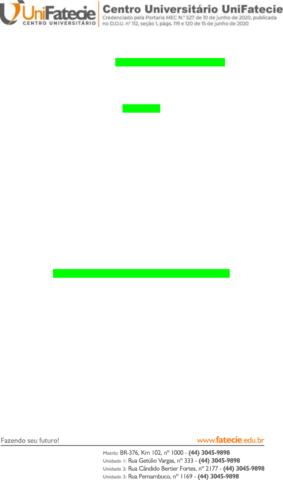 BACHAREL EM (COLOCAR NOME DO CURSO) ALUNO (A) RELATÓRIO FINAL DO ESTÁGIO SUPERVISIONADO COLOCAR O PERÍODO E A MATRIZ CURRICULAR UNIFATECIE 2023 ALUNO (A) RELATÓRIO FINAL DO ESTÁGIO SUPERVISIONADO COLOCAR O PERÍODO E A MATRIZ CURRICULAR Relatório de conclusão do Estágio, apresentado ao Curso de (colocar nome do curso ), como requisito final para cumprimento das atividades exigidas na disciplina do Estágio Supervisionado. Professor Coordenador do Curso: UNIFATECIE 2023 SUMÁRIO 1. INTRODUÇÃO 2. DESENVOLVIMENTO 2.1 .... 2.2 .... 3. ATIVIDADES DESENVOLVIDAS CONSIDERAÇÕES FINAIS 4. REFERÊNCIAS BIBLIOGRAFÍCAS 5. ANEXOS 1. INTRODUÇÃO Visando superar os desafios presentes na formação desse profissional, tem-se como exigência curricular no curso de Pedagogia da UNIFATECIE - Centro Universitário Faculdade de Tecnologia e Ciências do Norte do Paraná a realização do Estágio Supervisionado (colocar período e matriz curricular se houver), por se constituir como uma possibilidade de articulação entre teoria e prática e de desenvolvimento das habilidades necessárias à docência. Consequentemente, refletindo na prática de ensino desse profissional. Este estágio é uma exigência curricular, de caráter obrigatório, para os(as) acadêmicos(as) regularmente matriculados no curso de (colocar o nome do curso) da UNIFATECIE. Representa um momento de formação, no qual o(a) acadêmico(a) deverá vivenciar e consolidar as aptidões exigidas para o exercício da atividade docente associando, consequentemente, os conceitos teóricos à vivência profissional e reforçando os conhecimentos construídos ao longo dos períodos letivos . 2.DESENVOLVIMENTO APRESENTAÇÃO DA EMPRESA/ORGÃO 2.1 IDENTIFICAÇÃO DA ÁREA DE ATUAÇÃO ABORDADA NO ESTÁGIO (Deve-se fazer uma discrição da instituição) 2.2 LEVANTAMENTO DO AMBIENTE DE ESTÁGIO (Deve-se fazer um breve histórico da instituição que está sendo realizado o estágio, objetivo do ensino, estrutura organizacional, contextualização sócio cultural do local do estágio e diagnóstico da infra-estrutura. Analise se esses aspectos contribuem para o processo de aprendizagem) 2.3 ORGANIZAÇÃO PEDAGÓGICA (Descreva como é feito a organização do trabalho pedagógico). 2.4 OBSERVAÇÕES E REGÊNCIAS (Relate as observações e regências durante o período de estágio, aponte os conhecimentos obtidos e as principais dificuldades encontradas, como por exemplo: a escolha de campo, suporte pedagogíco, elaboração das aulas). 3. ATIVIDADES DESENVOLVIDAS Realize uma descrição DETALHADA dos pontos que mais se destacaram durante a realização da regência, incluindo fotos (MÍNIMO DE 2 FOTOS). Analise e descreva os pontos a seguir em forma de texto corrido: · A regência aconteceu conforme previsto inicialmente? · Todos os objetivos do plano de aula foram alcançados; · Quais os pontos positivos e os pontos que precisam ser melhorados, segundo sua percepção. · Como foi a execução da aula e a participação dos envolvidos; · A metodologia utilizada foi adequada; · Escreva a sua conclusão sobre a regência. 3. CONSIDERAÇÕES FINAIS Discorra sobre a importância da realização do estágio de maneira geral; As contribuições das atividades do estágio para você (observações, orientações, planejamento etc.); Como foi seu desenvolvimento e o que aprendeu durante sua realização (análise crítica e pessoal do trabalho executado e de sua validade e oportunidade para a sua formação profissional). 4. REFERÊNCIAS BIBLIOGRAFÍCAS Citar apenas as referências utilizadas, seguindo, por exemplo, os modelos a seguir. Apague essas informações após incluir suas referências, em casos de pesquisa em sites colocar a data assim como o exemplo em destaque: SOBRENOME, Nome. Título do livro. Local de edição: Editora, ano da publicação. SOBRENOME, Nome (do autor do capítulo). Título do capítulo. In: SOBRENOME, Nome (Org.). Título do livro. Local de edição: Editora, ano de publicação. p. (página inicial) - (página final do capítulo). SOBRENOME, Nome. Título do Artigo. Nome da revista, Local de edição, v. 1, n. 10, p. (página inicial) - (página final), ano da publicação. SOBRENOME, Nome. Título do texto da internet. Disponível em: https://www. Acesso em: 24 jul. 2020. 5. ANEXOS UM POR FOLHA ,SIGA A ORDEM ABAIXO : 1. Formulário de controle do Estágio Supervisionado; 2. Ficha de frequência; 3. Relatório de observação e participação 4. Plano(s) de aula(s); 5. Relatório de regência; 6. Formulário de avaliação de regência – preenchido pela escola. 7. Fotos e atividades atentem-se para não mostrar o nome do aluno ou rosto. TODO O RELATÓRIO DEVE ESTAR DENTRO DAS NORMAS DA ABNT! image1.jpeg image2.emf