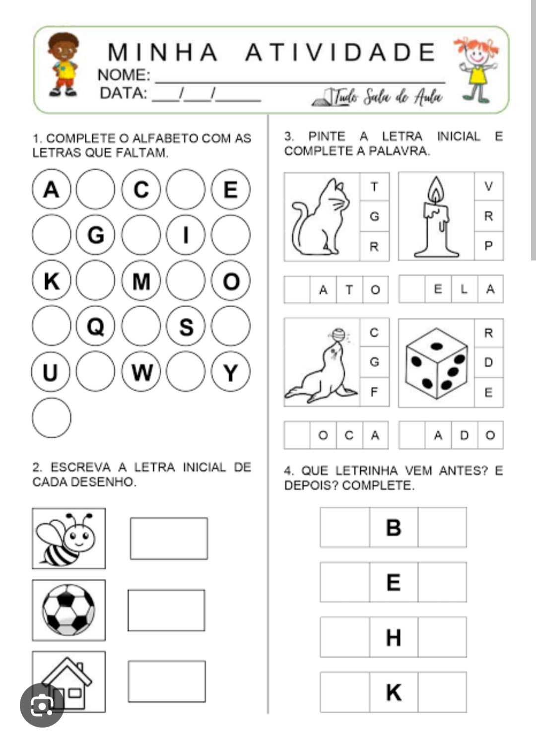 MINHA ATIVIDADE NOME: DATA: / Sala do 1. COMPLETE O ALFABETO COM AS 3. PINTE A LETRA INICIAL E LETRAS QUE FALTAM. COMPLETE A A T V G R R P K M ATO EL A C R G D U W Y F E OCA ADO 2. ESCREVA A LETRA INICIAL DE 4. QUE LETRINHA VEM ANTES? E CADA DESENHO. DEPOIS? B E H K