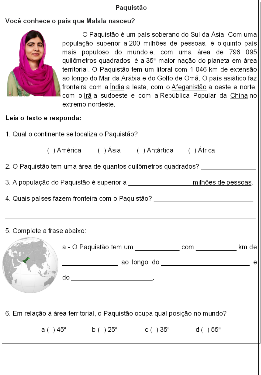 Atividade de Geografia Malala, “a menina que queria ir para a escola” Localização Geográfica Malala Yousafzai é uma jovem ativista do Paquistão. Malala Yousafzai nasceu em 12 de julho de 1997, em Mingora, no vale de Swat, no Paquistão. Também denominado vale do Suate, é uma região do Paquistão que margeia o rio Suate. Conhecido como a "Suíça do Oriente" por conta de suas paisagens semelhantes aos Alpes, o lugar foi, durante muito tempo, um destino popular, até se tornar uma fortaleza para o Talibã em 2007. O vale do Swat tem campos verdejantes, cercados por montanhas gigantes, que a neve pinta de branco quase o ano inteiro. No verão, quando o sol aquece os picos, a neve derrete e se junta ao rio Swat, que desce serpenteando a serra até o encontro do rio Cabul, este vindo do país vizinho, o Afeganistão. Ali, entre a magnífica cordilheira de Hindu Kush e as águas cristalinas dos rios, com um pé no Paquistão e outro no Afeganistão, Responda: 1. Malala é de qual país? _______________________________________________________ 2. Qual a cidade e região Malala nasceu? ____________________________________________________________________________ 3. Qual a data de nascimento de Malala? __________________________________________ 4. De acordo com o texto, como é a região vale do Swat? _____________________________ ____________________________________________________________________________ ____________________________________________________________________________ 5. A região onde Malala morava é conhecida como? Por quê? _________________________ ____________________________________________________________________________ 6. Complete a frase abaixo: - No verão, quando o _____________ aquece os______________, a neve derrete e se junta ao rio _______________, que desce serpenteando a serra até o encontro do rio______________, este vindo do país vizinho, o_____________________. Atividade de História Malala Yousafzai é uma ativista do Paquistão. Ela ganhou o Prêmio Nobel da Paz aos 17 anos de idade, por sua militância a favor da educação. O Prêmio Nobel da Paz é um prêmio internacional para reconhecer pessoas ou instituições que realizaram pesquisas, descobertas ou contribuições notáveis para a humanidade, é considerado o mais prestigiado prêmio disponível nas áreas de literatura, medicina, física, química, economia e ativismo pela paz. Vida sob o regime do Talibã Em 2007, o vale de Swat foi invadido pelo Talibã, um grupo islâmico extremista. As escolas para meninas começaram a ser fechadas. O Talibã proíbe as mulheres de participar da sociedade em geral. A invasão trouxe muita violência para a região. Malala Yousafzai e sua família fugiram, porém retornaram quando a violência diminuiu. O Talibã é um grupo político que atua no Afeganistão e no Paquistão. O grupo fortemente armado se formou em 1994 e exerce grande influência nesses países. As características desse grupo são: ter uma interpretação muito rígida dos textos islâmicos (fundamentalismo religioso), incluindo proibição à cultura ocidental e a obrigação ao uso da burca pelas mulheres, a utilização de táticas de guerrilha e ataques de homem-bomba. Islamismo ou Islã é uma doutrina do monoteísmo embasada pelos ensinamentos do Alcorão, livro sagrado com as revelações de Alá (Deus). Criada pelo profeta Maomé, a religião prega a crença nos anjos e no fatalismo, isto é, no dia do julgamento final. Os extremistas islâmicos podem ser considerados grupos que se opõem à paz. 1. Porque Malala Yousafzai ganhou o Prêmio Nobel da Paz? 2. Quais são as características do Talibã? 3. O que o regime Talibã fez no vale de Swat? 4. Quais são os países em que o Talibã atua? 5. O que é o Islamismo? 6. Qual é a diferença do Islamismo para os extremistas islâmicos? 7. O Islamismo é embasado pelos ensinamentos de que livro? 8. No Alcorão tem revelações de quem? 9. O Islamismo é uma religião criada por qual profeta? 10. Escreva um texto falando o que você achou da história de Malala. Você gostou dela? Você achou que ela te inspirou a estudar e lutar por seus direitos?