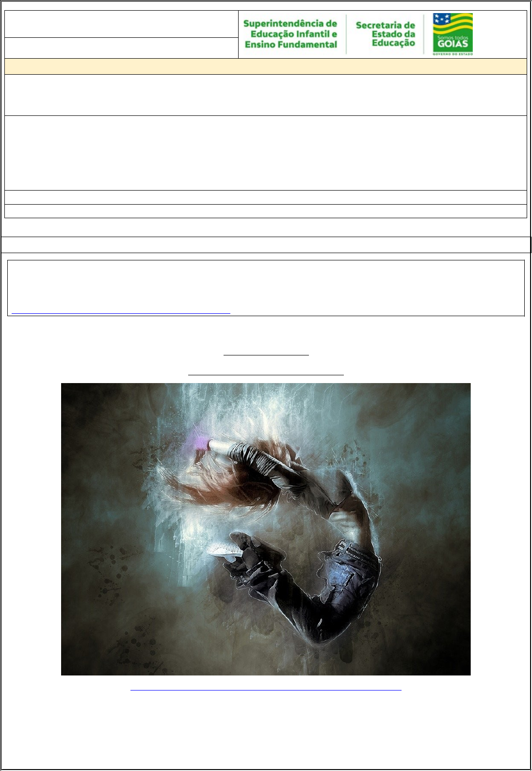 6º ANO ARTE - DANÇA ATIVIDADE 5 Tema: Contextos e Práticas/ Manifestações das danças tradicionais, sociais e contemporâneas, repertório corporal, práticas e produções artísticas, produções em dança, produção goiana e seus contextos, gesto e movimento Habilidades Essenciais: (GO-EF06AR08-A) Contextualizar, apreciar e experimentar manifestações das danças tradicionais, sociais e contemporâneas, cultivando a percepção, o imaginário, a dimensão brincante e a capacidade de simbolizar. Ampliar o repertório corporal, valorizar as expressões das tradições e das culturas contemporâneas e periféricas, em âmbito regional e nacional e internacional. NOME: UNIDADE ESCOLAR: Olá, estudantes! Vamos começar nossa atividade de hoje com uma poesia: Parte da aula será disponibilizada em formato podcast (áudio), acesse o endereço: https://www.podbean.com/ew/pb-2xumk-e90e15 e acompanhe. A dança e a alma Carlos Drummond de Andrade https://pixabay.com/pt/photos/hip-hop-dan%C3%A7a-menina-mulher-jovem-2159913/ A dança? Não é movimento súbito gesto musical é concentração, num momento, da humana graça natural. No solo não, no éter pairamos, nele amaríamos ficar. A dança-não vento nos ramos seiva, força, perene estar um estar entre céu e chão, novo domínio conquistado, onde busque nossa paixão libertar-se por todo lado... Onde a alma possa descrever suas mais divinas parábolas sem fugir a forma do ser por sobre o mistério das fábulas. 1) Vamos transformar nosso dia com um pouquinho de dança! Você sabia que a dança é uma das primeiras formas de expressão do homem?! E que ao dançar ativamos nosso corpo, melhoramos nossa saúde e nossas emoções! Nesse momento de isolamento social que estamos vivendo necessitamos de reservar um tempinho do nosso dia para dançar aliviar as tensões. Para aquecer nosso corpo na aula de hoje vamos precisar de um corpo disponível. Aquecimento Corporal A) Posicione seu corpo deitado com as costas no chão e barriga para cima, braços soltos ao longo do corpo e pernas estendidas. Perceba cada parte do seu corpo. Sinta o peso da cabeça, dos braços e pernas. Perceba a temperatura do chão. E esteja atento a sua respiração. B) Feche seus olhos, perceba a sua respiração e batimento do seu coração. Permaneça por alguns instantes nessa posição. Esteja atento aos movimentos provocados pela respiração e pela batida do coração no corpo. C) Bem lentamente, vá se espreguiçando como se tivesse acabado de acordar de manhã. Mantenha-se deitado no chão, mas vá mudando de posição: de um lado, de outro, de barriga para baixo. Aproveite o chão para realizar movimentos de esticar e encolher o corpo, fazendo movimentos de expansão e contração. D) Aos poucos, continue fazendo movimentos de espreguiçar, não pare, até passar para a posição de sentar e finalmente ficar em pé. Perceba o corpo mais alongado e pronto para prosseguir ... E) Na posição de pé, afaste as pernas na abertura do seu quadril com os pés paralelos e descalços. Braços ao longo do corpo. Joelhos semiflexionados e coluna ereta (sem rigidez); Descance alguns instantes... F) Inspire fundo e elevar os braços em direção ao céu. Segure-os na posição 1, 2, 3, 4. Expira soltando o ar e retorne os braços ao longo do corpo. Repita essa movimentação 4 vezes; Agora, nossa atenção será direcionada para os pés. Vamos construir a imagem de amassar o barro com os pés na sua memória. Vamos elevar os pés do solo como se estivéssemos amassando o barro. G) 1 pé de cada vez direito 1,2, Pé esquerdo 3, 4; Repita essa movimentação várias vezes. Perceba a vibração do movimento em todo o seu corpo, veja com reverbera nas pernas, tronco, braços e cabeça; H) Com a intenção de amassar o barro você fará um exercício de levar um pé à frente e retornar à posição inicial que é com os pés paralelos na abertura do seu quadril. Uma vez pé direito, outra vez pé esquerdo. Pé direito à frente 1, 2; volta 3, 4. Pé esquerdo à frente 5,6; volta 7, 8; I) Deixe o movimento solto e perceba como seu quadril segue o movimento, não trave o quadril. J) Para finalizar, com a sensação de amassar o barro o desafio é sair andando ao ritmo da música pelo espaço onde você se encontra, e depois acelere o caminhar até chegar a correr. Você pode começar mais devagar e ir acelerando aos poucos, siga a batida da percussão. Não se esqueça de observar quais são as sensações que você tem ao andar, correr pelo espaço. 2) Agora com seu corpo disponível, vamos relembrar a sequência que você criou e gravou em formato vídeo na atividade 8. Após, ensaiar a coreografia repita a gravação do vídeo. 3) Assista aos dois vídeos produzidos por você e compare um com o outro, como exercício. E mantenha seu olhar aguçado. Escreva em seu caderno o que você achou de cada vídeo e o que pode ser melhorado. BONS ESTUDOS! BOAS DANÇAS! Professor (a), É importante aguçar a consciência corporal repetindo as movimentações trabalhadas. Isto permitirá que os estudantes construam seu repertório corporal de forma apropriada. Desenvolver a consciência corporal é importante para o processo ensino aprendizagem, para Imbassaí (2003) a consciência corporal é um instrumento pedagógico, cuja proposta é abrir os canais da percepção sensorial, trabalhando com elementos constitutivos de uma organização corpo-mente sadia, equilibrada, reguladora das tensões, organizadora da postura, promovendo uma inter-relação entre o mover, o sentir e o pensar. Sugiro a leitura do texto: Contribuições da consciência corporal através da dança para alunos do ensino médio, para uma reflexão da nossa prática, o texto pode ser acessado em: https://www.efdeportes.com/efd148/consciencia-corporal-atraves-da-danca.htm. Aproveite para aprofundar os conhecimentos e desenvolver ainda potencialmente as habilidades complementares GO-EF06AR10-A) Explorar as diversas a