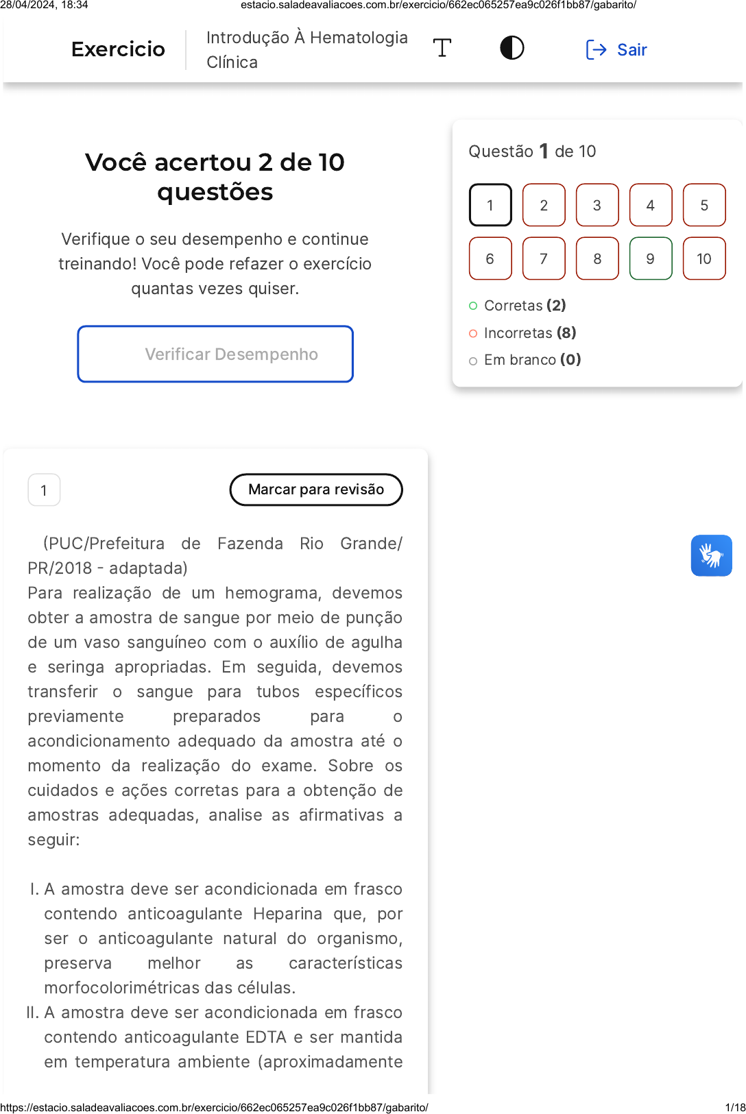 Você acertou 2 de 10 questões Verifique o seu desempenho e continue treinando! Você pode refazer o exercício quantas vezes quiser. Verificar Desempenho 1 Marcar para revisão �PUC/Prefeitura de Fazenda Rio Grande/ PR/2018 � adaptada) Para realização de um hemograma, devemos obter a amostra de sangue por meio de punção de um vaso sanguíneo com o auxílio de agulha e seringa apropriadas. Em seguida, devemos transferir o sangue para tubos específicos previamente preparados para o acondicionamento adequado da amostra até o momento da realização do exame. Sobre os cuidados e ações corretas para a obtenção de amostras adequadas, analise as afirmativas a seguir: I� A amostra deve ser acondicionada em frasco contendo anticoagulante Heparina que, por ser o anticoagulante natural do organismo, preserva melhor as características morfocolorimétricas das células. II� A amostra deve ser acondicionada em frasco contendo anticoagulante EDTA e ser mantida em temperatura ambiente (aproximadamente Questão 1 de 10 Corretas �2� Incorretas �8� Em branco �0� 1 2 3 4 5 6 7 8 9 10 Exercicio Introdução À Hematologia Clínica Sair 28/04/2024, 18:34 estacio.saladeavaliacoes.com.br/exercicio/662ec065257ea9c026f1bb87/gabarito/ https://estacio.saladeavaliacoes.com.br/exercicio/662ec065257ea9c026f1bb87/gabarito/ 1/18 A B C D E 25°C� até o momento da realização do exame, independentemente do tempo necessário, pois a temperatura de refrigeração provoca hemólise. II� A amostra deve ser acondicionada em frasco contendo anticoagulante EDTA, observando- se a proporção mínima e máxima indicada. Marque a alternativa que apresenta as afirmativas corretas. I, apenas. II, apenas. III, apenas. I e II, apenas. I e III, apenas. Resposta correta Parabéns, você selecionou a alternativa correta. Confira o gabarito comentado! Gabarito Comentado A amostra deve ser acondicionada em frasco contendo anticoagulante EDTA e caso não seja analisado no momento é recomendado que a amostra fique na geladeira, pois quanto mais tempo a amostra ficar à temperatura ambiente, mais se eleva o VCM. Essa elevação pode ser diminuída caso a amostra fique armazenada em geladeira. Para realizar a 28/04/2024, 18:34 estacio.saladeavaliacoes.com.br/exercicio/662ec065257ea9c026f1bb87/gabarito/ https://estacio.saladeavaliacoes.com.br/exercicio/662ec065257ea9c026f1bb87/gabarito/ 2/18 A B C análise do hemograma devemos coletar o sangue total, por venopunção, em tubos de tampa roxa, que tem como anticoagulante o EDTA, pois conserva as células por mais tempo e sempre devemos respeitar o volume que é indicado no frasco, não ultrapassando e nem coletando menos que o estipulado. 2 Marcar para revisão Durante o estágio em um laboratório de hematologia, o aluno ao realizar a distensão sanguíneas na lâmina de vidro, encontrou o seguinte resultado. Fonte: Elen Oliveira. Marque a alternativa que apresenta o erro de resultado durante a distensão atribuído ao ler a lamina pelo professor responsável pelo aluno. Pausas durante a distensão. Gota seca. Gota concentrada no meio da lâmina. 28/04/2024, 18:34 estacio.saladeavaliacoes.com.br/exercicio/662ec065257ea9c026f1bb87/gabarito/ https://estacio.saladeavaliacoes.com.br/exercicio/662ec065257ea9c026f1bb87/gabarito/ 3/18 D E Amostra lipêmica. Gota muito pequena. Resposta incorreta Opa! A alternativa correta é a letra E. Confira o gabarito comentado! Gabarito Comentado Como a distensão realizada pelo aluno ficou muito curta, ele preparou a lâmina com uma gota muito pequena. No momento da distensão as pausas realizadas, geram um esfregaço falhado. Quando a amostra é lipêmica, temos um esfregaço com gotas, que são referentes aos lipídeos durante a execução do esfregaço. O esfregaço realizado com a gota que já está seca, provoca uma distensão com uma falha no meio da lâmina e a gota concentrada no meio da lâmina irá concentrar o esfregaço no meio da lâmina, não ocupando todo a largura da lâmina necessária para a realização do esfregaço. 3 Marcar para revisão �SESA/2013 � adaptada) As hemácias são os elementos figurados mais abundantes do sangue. As análises qualitativas e quantitativas das hemácias auxiliam o diagnóstico dos pacientes com doenças hematológicas. A respeito dos índices hemantimétricos, analise as afirmativas a seguir: 28/04/2024, 18:34 estacio.saladeavaliacoes.com.br/exercicio/662ec065257ea9c026f1bb87/gabarito/ https://estacio.saladeavaliacoes.com.br/exercicio/662ec065257ea9c026f1bb87/gabarito/ 4/18 A B C D E I. A avaliação do micro-hematócrito é indicado em casos de dificuldade de contagem de eritrócitos devido a presença de crioaglutininas. II. Quanto mais a temperatura ambiente, mais se diminui o VCM. III. O excesso de EDTA pode induzir a desidratação e consequentemente aumenta o VCM. Marque a alternativa que apresenta as afirmativas corretas. I, apenas. II, apenas. III, apenas. I e II, apenas. I e III, apenas. Resposta incorreta Opa! A alternativa correta é a letra A. Confira o gabarito comentado! Gabarito Comentado O excesso de EDTA em relação ao volume de sangue coletado por induzir a desidratação das células e consequentemente diminuir o VCM. Quanto mais tempo a amostra ficar à temperatura ambiente, mais se eleva o VCM. Essa elevação pode ser diminuída caso a amostra fique armazenada em geladeira. 28/04/2024, 18:34 estacio.saladeavaliacoes.com.br/exercicio/662ec065257ea9c026f1bb87/gabarito/ https://estacio.saladeavaliacoes.com.br/exercicio/662ec065257ea9c026f1bb87/gabarito/ 5/18 A B C Crioaglutininas são autoanticorpos em geral de classe IgM que possuem atração por antígenos da membrana eritrocitária, promovendo a aglutinação dessas células quando em temperatura inferior a 37°C, podendo contar duas células como uma única célula. 4 Marcar para revisão �CONSULPLAN/ Prefeitura de Cascavel/ PR/ 2016 � adaptada) A avaliação qualitativa do hemograma tem o obje