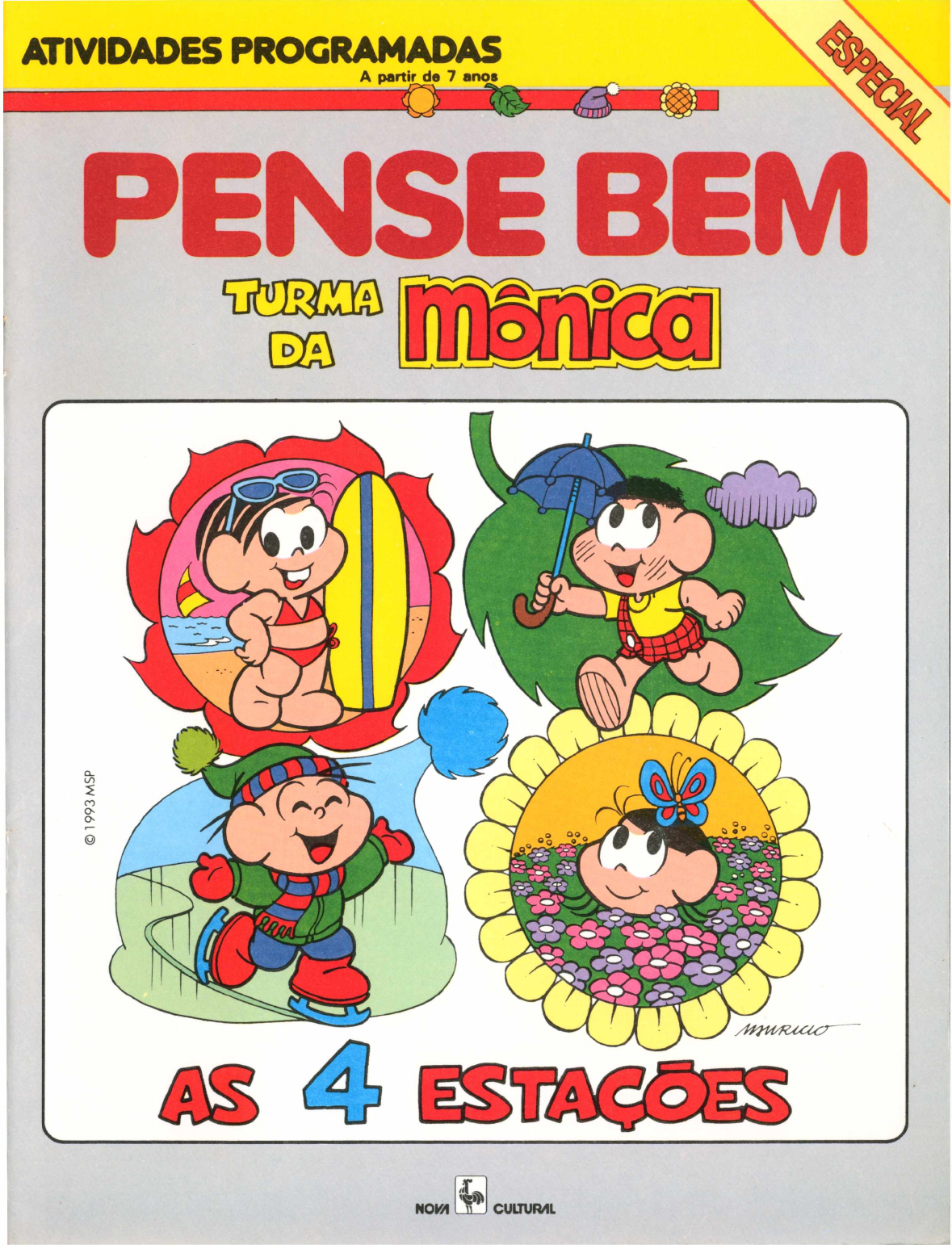 — v. ATIVIDADES PROGRAMADAS A partir de 7 anos PENSE BEML.. NOW CULTUR/IL Fundador: VICTOR CIVITA (1907-1990) © 1987 Video Technology Electronics Ltd. TODOS OS DIREITOS RESERVADOS. SMART START™ (Título original da obra) é uma marca registrada da Vídeo Technology Ind., Inc. USA. © 1993, Editora Nova Cultural Ltda. Direitos cedidos pela TEC TOY — Indústria de Brinquedos S.A., licenciada pela Video Technology Ind. Edição organizada pela Editora Nova Cultural Ltda. — Al. Ministro Rocha Azevedo, 346 — CEP 01410-901 - São Paulo, SP — Brasil (Art. 15 da Lei 5 988 de 14/12/1973.) A Editora Nova Cultural Ltda. é uma empresa do Grupo CLC — Comunicações, Lazer, Cultural S/A Texto: Regina Gomes de Sousa Ilustrações: Mauricio de Sousa Produções Ltda. Obra composta na Editora Nova Cultural Ltda. e impressa na Gráfica Círculo. PENSE BEM PENSE BEM é uma série de livros de atividades destinadas a crian ças de 6 a 12 anos. Com eles, vocês se divertem e, ao mesmo tem po, aprendem noções básicas de cores, formas, números, palavras etc. Os livros podem ser utilizados com o equipamento eletrônico PENSE BEM ou sem ele. Com o equipamento eletrônico PENSE BEM Cada livro é dividido em cinco seções de atividades, mais uma (Pro grama 6) de avaliação geral. Cada programa pode ser feito separa damente. 1. Para começar, leia atentamente as instruções que estão na aber tura do programa escolhido. Pressione as teclas indicadas na ordem correta. Imediatamente aparecerá no visor do PENSE BEM o núme ro da primeira questão a ser respondida. 2. Cada questão apresenta quatro possibilidades de resposta. Sele cione aquela que lhe parece certa e pressione a tecla do equipamen to que tem a mesma cor da resposta escolhida. Se você acertou, o PENSE BEM passará à questão seguinte; se você errou, ele repetirá a pergunta. IMPORTANTE: responda as questões na ordem em que elas apare cem no visor. 3. Depois de terminar as atividades de uma seção, automaticamente aparecerá no visor a contagem dos pontos. Escreva, no lugar indica do no livro, quantos pontos você fez. Sem o equipamento eletrônico Assinale as respostas certas e conte 1 ponto para cada acerto. Es creva, no lugar indicado no livro, no final de cada seção, quantos pon tos você fez. Repita duas ou três vezes cada seção, depois peça ao papai para fazer trinta perguntas, escolhendo-as ao acaso. Dispense a última seção (Programa 6). Para brincar com seus amiguinhos Se você quer jogar com seus amiguinhos para ver quem sabe mais, cada um deve responder sozinho a um Programa inteiro. Marque os pontos que cada um fez no final da seção, no lugar indicado no livro. Veja quem fez mais pontos. 1 Programa 1 Para entrar este programa, pressione as teclas de seu equipamento na ordem indicada abaixo. Digite: 0 0 2 Em que estação estamos? Há quatro épocas diferentes que se repetem todos os anos. São as quatro estações: verão, outono, inverno e primavera. Identifique em que estação está cada um dos desenhos citados nas questões. Marque a resposta certa pela cor. 1 Cebolinha bem agasalhado 2 folhas caindo 3 flores e borboletas 4 5 6 Magali tomando sorvete sol brilhando coelhinhos correndo VERÃO OUTONO INVERNO A influência do Sol o oO 12 8 estacao do ano dura 9 0 primeiro mês do 2 O ®e O o O U dezembro janeiro I maio D junho ° Você sabe por que acontecem as quatro estações? É que durante o ano, enquanto a Terra gira em torno do Sol, em certas épocas um lado recebe mais luz e calor e fica mais quente. Enquanto isso, o outro lado fica mais frio porque está mais afastado do Sol. Complete as frases com a resposta certa. ano tem 5 10 Cada semana Depois do sábado vem o terça-feira cachorro dia domingo 11 □ □ 0 último dia do ano é LI 1 de abril □ 30 de agosto 5 de maio 31 de dezembro A Terra leva .... ano para dar uma volta completa em torno do Sol. □ □ 4 Rimas para o ano todo . —O— Complete o versinho escolhendo o que rima com a palavra em destaque. 14 0 sol brilha no verão vou nadar só de □□□ calção camiseta bota boné 16 No recreio lá da escola nós vamos jogar barco carro relógio 19 Para ser um bom atleta vou andar de □■□ bicicleta tênis patim panela LJ flores O coelho ■ xícara 17 Na primavera são lindas as cores de todas as ...... morango D escada D casa □ caminhão ü árvore Fugindo da chuva eu perdi a minha .. 18 O sabiá feriu a asa e caiu na minha luva bola borboleta boneca 20 ☆ <1 Cai, cai, balão na noite de São Pedro & □ João Antônio Brás "U 9 5 A estação preferida \ inverno verão inverno verão inverno verão primavera outono verão primavera outono inverno Cada personagem da Turma gosta de uma das estações do ano. Olhando os desenhos, descubra qual é a estação predileta de cada um 21 ■ primavera □ outono L—l outono O primavera O inverno I primavera H outono □ primavera I verão outono 6 Que horas são? Os desenhos abaixo mostram um dia na vida da Mônica. Escolha o relóaio que marca a hora certa de cada atividade. Programa 2 Para entrar este programa, pressione as teclas de seu equipamento na ordem indicada abaixo. Digite: No clube Hoje está um belo dia dè verão! A Turma aproveitou para passar o dia no clube. Mônica e Magali foram direto para a piscina, Cascão e Cebolinha correram para o campinho de futebol e o Franjinha resolveu dar uma corrida na pista — só que o Bidu foi junto! Vamos descobrir o que se usa para praticar cada esporte? 31 destas se usa para jogar tênis?Qual Qual destas você leva para a aula de balé? □ 33 Qual destas é a bola de futebol? 34 □ 0 que o surfista usa para pegar ondas? □ Qual destes objetos se usa para fazer musculação? 9 Aproveitando o verão maleta árvore de natal laranjeira raquete peteca barco lancha cancha bombeiro sinaleiro carteiro salva-vidas trombone megafone violino guarda-chuva guarda-sol I lanterna coqueiro flor. . . Hoje o dia amanheceu ensolarado e o pai da M