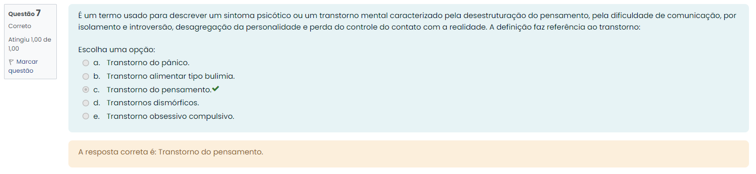 Questão 7 É um termo usado para descrever um sintoma psicótico ou um transtorno mental caracterizado pela desestruturação do pensamento, pela dificuldade de comunicação, por Correto isolamento e introversão, desagregação da personalidade e perda do controle do contato com a A definição faz referência ao transtorno: Atingiu 1,00 de 1,00 Escolha uma opção: P Marcar a. Transtorno do pânico. questão b. Transtorno alimentar tipo bulimia C. Transtorno do pensamento. d. Transtornos dismórficos. e. Transtorno obsessivo compulsivo. A resposta correta é: Transtorno do pensamento.