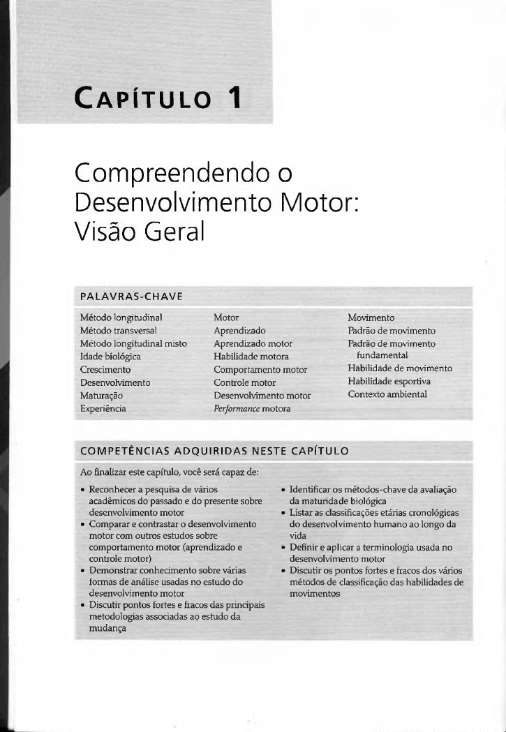 C a p í t u l o 1 Compreenden do o Desenvolvimento Motor: Visão Geral PA L A V R AS-C H A V E Método longitudinal Motor Movimen to Método transversal Aprendizado Padrão de movimento Método longitudinal misto Aprendizado motor Padrão de movimento Idade biológica Habilidade motora fundamental Crescimento Comportamento motor Habilidade de movimento Desenvolvimento Controle motor Habilidade esportiva Maturação Desenvolvimento motor Contexto ambiental Experiência Performance motora C O M P E T E N C IA S A D Q U I R I D A S N E S T E CAPITULO Ao finalizar este capítulo, você será capaz de: • Reconhecer a pesquisa de vários acadêmicos do passado e do presente sobre desenvolvimento motor • Comparar e contrastar o desenvolvimento motor com outros estudos sobre comportamento motor (aprendizado e controle motor) • Demonstrar conhecimento sobre várias formas de análise usadas no estudo do desenvolvimento motor • Discutir pontos fortes e fracos das principais metodologias associadas ao estudo da mudança Identificar os métodos-chave da avaliação da maturidade biológica Listar as classificações etárias cronológicas do desenvolvimento humano ao longo da vida Definir e aplicar a terminologia usada no desenvolvimento m o tor Discutir os pontos fortes e fracos dos vários métodos de classificação das habilidades de movimentos Compreende ndo o Desenvolvimento Motor 21 CONCEITO-CHAVE 0 desenvolvimento motor é a mudança contínua do comportamento motor ao longo do ciclo da vida, provocada pela interação entre as exigências da ta refa motora, a biologia do indivíduo e as condições do ambiente. Movimento é vida. Tudo o que fazemos no trabalho e no lazer envolve movi mento. A nossa própria existência depende das batidas de nosso coração, da inalação e exalação de nossos pulmões e de um conjunto de outros processos de movimentos voluntários, semiau- tomáticos e automáticos. Compreender como adquirimos o controle motor e a coordenação dos movimentos é fundamental para compre endermos como vivemos. Q uando compreen demos o processo de desenvolvimento de um indivíduo típico, assimilamos orientações fun damentais importantes para a eficácia do ensino e da aprendizagem. Feira indivíduos com defi ciências de desenvolvimento, a compreensão do desenvolvimento motor fomece uma base sólida de intervenção, terapia e medicação. O conheci mento dos processos do desenvolvimento está na essência do ensino, seja ele em sala de aula, no ginásio ou no campo esportivo. Sem noções sólidas sobre os aspectos do desenvolvimento do comportamento humano, podemos apenas intuir técnicas educativas e procedimentos de intervenção apropriados. As instruções com base no desenvolvimento envolvem experiências de aprendizado que são não apenas adequadas à idade, mas também apropriadas e divertidas em termos de desenvolvimento. O fornecimento de instruções é um aspecto importante do processo ensino-aprendizado. As instruções, entretan to, não explicam o aprendizado; o desenvolvi mento, sim. Conceito 1.1 As instruções não explicam o aprendizado; o desen volvimento, sim. Até uma cpoca relativamente recente, as pesquisas a respeito de aspectos do desenvol vimento do comportamento m otor eram muito mais limitadas em abrangência e magnitude do que aquelas sobre o desenvolvimento cognitivo e afetivo. Historicamente, os psicólogos do de senvolvimento tendem a interessar-se apenas de m odo superficial pelo desenvolvimento motor e, portanto, em geral o consideram apenas indi cador visível do funcionamen to cognitivo ou do estado socioemocional. O primeiro impulso para pesquisas sobre o desenvolvimento motor foi dado por ramos da psicologia; portanto, é natural que esse tema te nha sido observado com frequência do ponto de vista das potenciais influências de outras áreas do comportamento e na qualidade de recursos convenientes e imediatamente observáveis para o estudo do comportamento c não como um fe nômeno digno de investigações por si só. Conceito 1 .2 No passado, o estudo do desenvolvimento motor foi ofuscado pelo interesse pe lo desenvolvimento cog nitivo e afetivo. O estudo do desenvolvimento motor per passa os campos da fisiologia do exercício, bio- m ecânica, aprendizado e controle motor, assim como os campos da psicologia do desenvolvi mento e da psicologia social (Thomas eThomas, 1989). A busca por conhecim entos progTediu a passos lentos, mas regulares, na década de 1960, e foi aum entando gradativamente, à medida que os cinesiólogos e os psicólogos do desen volvimento mudavam o seu foco, passando da abordagem normativo-descritiva ao estudo dos processos de desenvolvimento subjacentes. Durante a dccada de 1980, o corpo crescente de pesquisas realizadas por uma nova geração de acadêmicos fez aum entar o interesse pelo estudo do desenvolvimento motor. Uma quan tidade sem precedentes de pesquisas com base teórica foi conduzida desde os anos de 1980, c pesquisadores do desenvolvimento originários de diversas áreas associaram-se a acadêmicos do desenvolvimento motor. O estudo do desenvol vimento m otor assumiu o seu lugar como área de investigação científica dentro dos limites da cinesiologia e da psicologia do desenvolvimento. Agora, no século XXI, os acadêmicos estão estu 22 Gallahue , Ozmun & Goodway dando os processos de desenvolvimento subja centes e os seus muitos e variados produtos. Eles estão fazendo isso de modo coordenado para entender melhor o controle e a coordenação do movimento a partir da perspectiva desenvolvi- mental. Os resultados de suas pesquisas têm sido aplicados em cenários práticos de ensino- -aprendizado por dedicados pais, professores, treinadores e fisioterapeutas. O termo cinesiólogo do desenvolvimento, usado inicialmente por Smoll (1982), popularizou-se e é utilizado hoje em dia para descrever aqueles que estudam o desenvolvimento motor. Esses profissionais do desenvolvimento recon