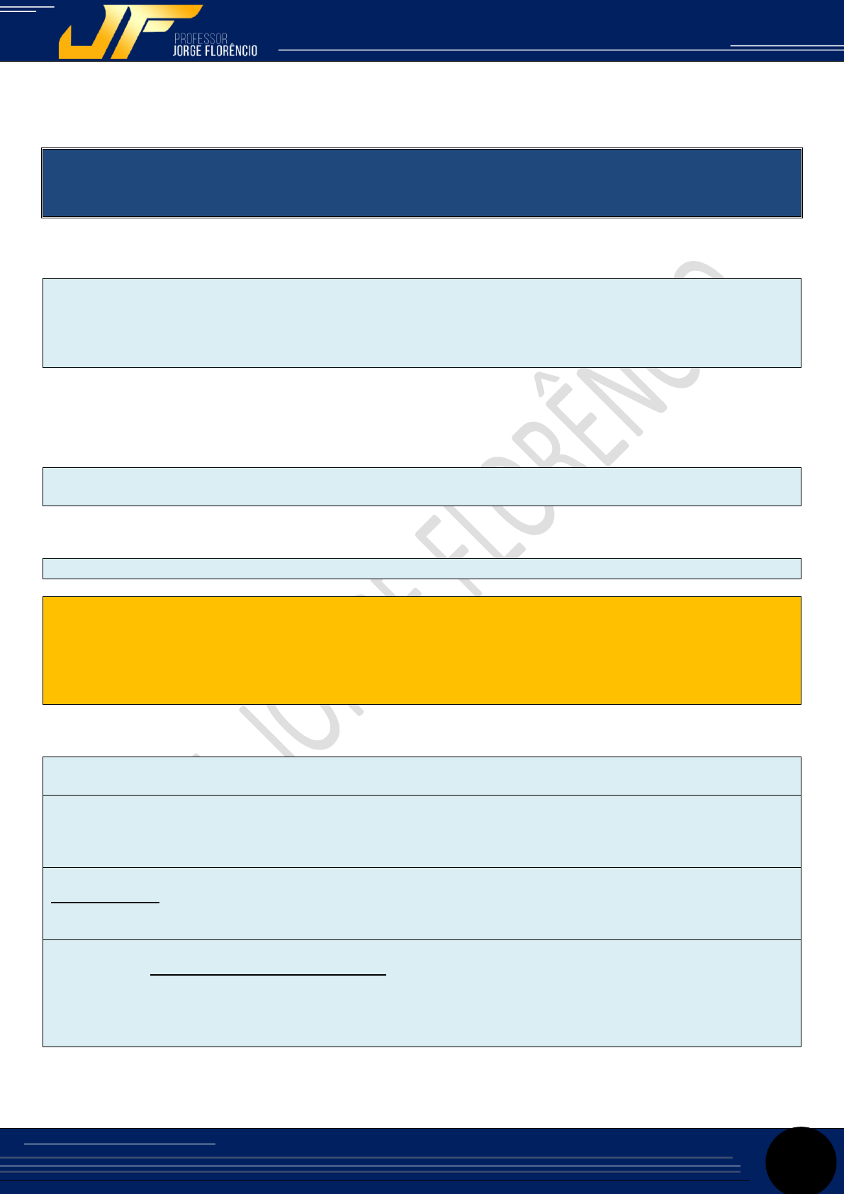 www.jorgeflorencio.com.br - Prof. Jorge Florêncio Concursos Carreiras Policiais – Atualizado em 27/02/20 Violação de Direitos Autorais é crime (art. 184 do CP) Material Exclusivo do Aluno 1 DISCIPLINA: DIREITO CONSTITUCIONAL PROFESSOR: JORGE FLORÊNCIO TÍTULO V - DA DEFESA DO ESTADO E DAS INSTITUIÇÕES DEMOCRÁTICAS - CAPÍTULO II - DAS FORÇAS ARMADAS (142 a 143) 1. NOÇÕES GERAIS: Art. 142. As FORÇAS ARMADAS, constituídas pela MARINHA, PELO EXÉRCITO E PELA AERONÁUTICA, são instituições nacionais permanentes e regulares, organizadas com base na HIERARQUIA E NA DISCIPLINA, sob a AUTORIDADE SUPREMA DO PRESIDENTE DA REPÚBLICA, e destinam-se à defesa da Pátria, à garantia dos poderes constitucionais e, por iniciativa de qualquer destes, da lei e da ordem. 2. PREVISÃO CONSTITUCIONAL: 2.1. LEI COMPLEMENTAR ESTABELECERÁ AS NORMAS GERAIS: § 1º LEI COMPLEMENTAR estabelecerá as NORMAS GERAIS a serem adotadas na organização, no preparo e no emprego das Forças Armadas. 2.2. NÃO CABIMENTO DO HC: § 2º Não caberá habeas corpus em relação a punições disciplinares militares. JURISPRUDÊNCIA: Esta vedação constitucional não é absoluta, estando restrita às hipóteses em que se pretenda discutir o MÉRITO DA PUNIÇÃO. Em outras palavras, o que esse art. 142, § 2º afirma é que não cabe habeas corpus para debater a procedência ou não do mérito da punição disciplinar militar. O Poder Judiciário poderá, no entanto, avaliar os aspectos relacionados com os pressupostos de legalidade. Logo, nada impede a impetração quando presentes vícios formais que tornem a punição ilegal. (HC 108268) 2.3. PATENTES, COM PRERROGATIVAS, DIREITOS E DEVERES: § 3º Os membros das FORÇAS ARMADAS são denominados MILITARES, aplicando-se- lhes, além das que vierem a ser fixadas em lei, as seguintes disposições: I - as Patentes, com prerrogativas, direitos e deveres a elas inerentes, são conferidas pelo PRESIDENTE DA REPÚBLICA e asseguradas em plenitude aos oficiais da ativa, da reserva ou reformados, sendo-lhes privativos os títulos e POSTOS MILITARES e, juntamente com os demais membros, o uso dos uniformes das Forças Armadas; II - o militar em atividade que tomar posse em cargo ou emprego público civil PERMANENTE, RESSALVADA a hipótese prevista no art. 37, inciso XVI, alínea "c" (exceção: dois cargos ou empregos privativos de profissionais de saúde, com profissões regulamentadas), será TRANSFERIDO PARA A RESERVA, nos termos da lei; III - o MILITAR DA ATIVA que, de acordo com a lei, tomar posse em cargo, emprego ou função pública civil TEMPORÁRIA, NÃO ELETIVA, ainda que da administração indireta, ressalvada a hipótese prevista no art. 37, inciso XVI, alínea "c", ficará AGREGADO ao respectivo quadro e somente poderá, enquanto permanecer nessa situação, ser promovido por ANTIGUIDADE, contando-se-lhe o tempo de serviço apenas para aquela promoção e transferência para a reserva, sendo DEPOIS DE DOIS (2) ANOS DE AFASTAMENTO, contínuos ou não, transferido para a reserva, nos termos da lei; ATENÇÃO ESPECIAL: MILITAR EM ATIVIDADE QUE TOMAR POSSE EM CARGO OU EMPREGO PÚBLICO www.jorgeflorencio.com.br - Prof. Jorge Florêncio Concursos Carreiras Policiais – Atualizado em 27/02/20 Violação de Direitos Autorais é crime (art. 184 do CP) Material Exclusivo do Aluno 2 CARÁTER PERMANENTE: TRANSFERIDO PARA A RESERVA CARÁTER TEMPORÁRIO OU NÃO ELETIVO: AGREGADO (somente pode ser promovido por ANTIGUIDADE, contando-se-lhe o tempo de serviço apenas para aquela promoção e transferência para a reserva, sendo DEPOIS DE 2 ANOS DE AFASTAMENTO, contínuos ou não, transferido para a reserva, nos termos da lei); 2.4. PROIBIÇÃO A SINDICALIZAÇÃO E A GREVE: IV - ao militar são proibidas a sindicalização e a greve; V - o militar, enquanto em serviço ativo, NÃO PODE ESTAR FILIADO A PARTIDOS POLÍTICOS; 2.5. JULGAMENTO PELO TRIBUNAL MILITAR PERMANENTE OU TRIBUNAL ESPECIAL: VI - o OFICIAL só perderá o posto e a patente se for julgado indigno do oficialato ou com ele incompatível, por decisão de TRIBUNAL MILITAR DE CARÁTER PERMANENTE, EM TEMPO DE PAZ, ou de TRIBUNAL ESPECIAL, EM TEMPO DE GUERRA; VII - o oficial condenado na justiça comum ou militar a PENA PRIVATIVA DE LIBERDADE superior a DOIS (2) ANOS, por SENTENÇA TRANSITADA EM JULGADO, será submetido ao julgamento previsto no inciso anterior; SÚMULA 694 STF: Não cabe habeas corpus contra a imposição da pena de exclusão de militar ou de perda de patente ou de função pública. OBS: O STF entende que nesses casos não há risco ou ameaça à liberdade de locomoção. 2.6. DIREITOS ESTENDIDOS AOS MILITARES DAS FORÇAS ARMADAS: VIII - aplica-se aos militares o disposto no art. 7º, incisos VIII, XII, XVII, XVIII, XIX e XXV, e no art. 37, incisos XI, XIII, XIV e XV, bem como, na forma da lei e com prevalência da atividade militar, no art. 37, inciso XVI, alínea "c"; Art. 7º São direitos dos trabalhadores urbanos e rurais, além de outros que visem à melhoria de sua condição social: VIII - décimo terceiro salário com base na remuneração integral ou no valor da aposentadoria; XII - salário-família pago em razão do dependente do trabalhador de baixa renda nos termos da lei; XVII - gozo de férias anuais remuneradas com, pelo menos, um terço a mais do que o salário normal; XVIII - licença à gestante, sem prejuízo do emprego e do salário, com a duração de cento e vinte dias; XIX - licença-paternidade, nos termos fixados em lei; XXV - assistência gratuita aos filhos e dependentes desde o nascimento até 5 (cinco) anos de idade em creches e pré-escolas; Art. 37. A administração pública direta e indireta de qualquer dos Poderes da União, dos Estados, do Distrito Federal e dos Municípios obedecerá aos princípios de legalidade, impessoalidade, moralidade, publicidade e eficiência e, também, ao seguinte: XI - a remuneração e o subsídio dos ocupantes de cargos, funç