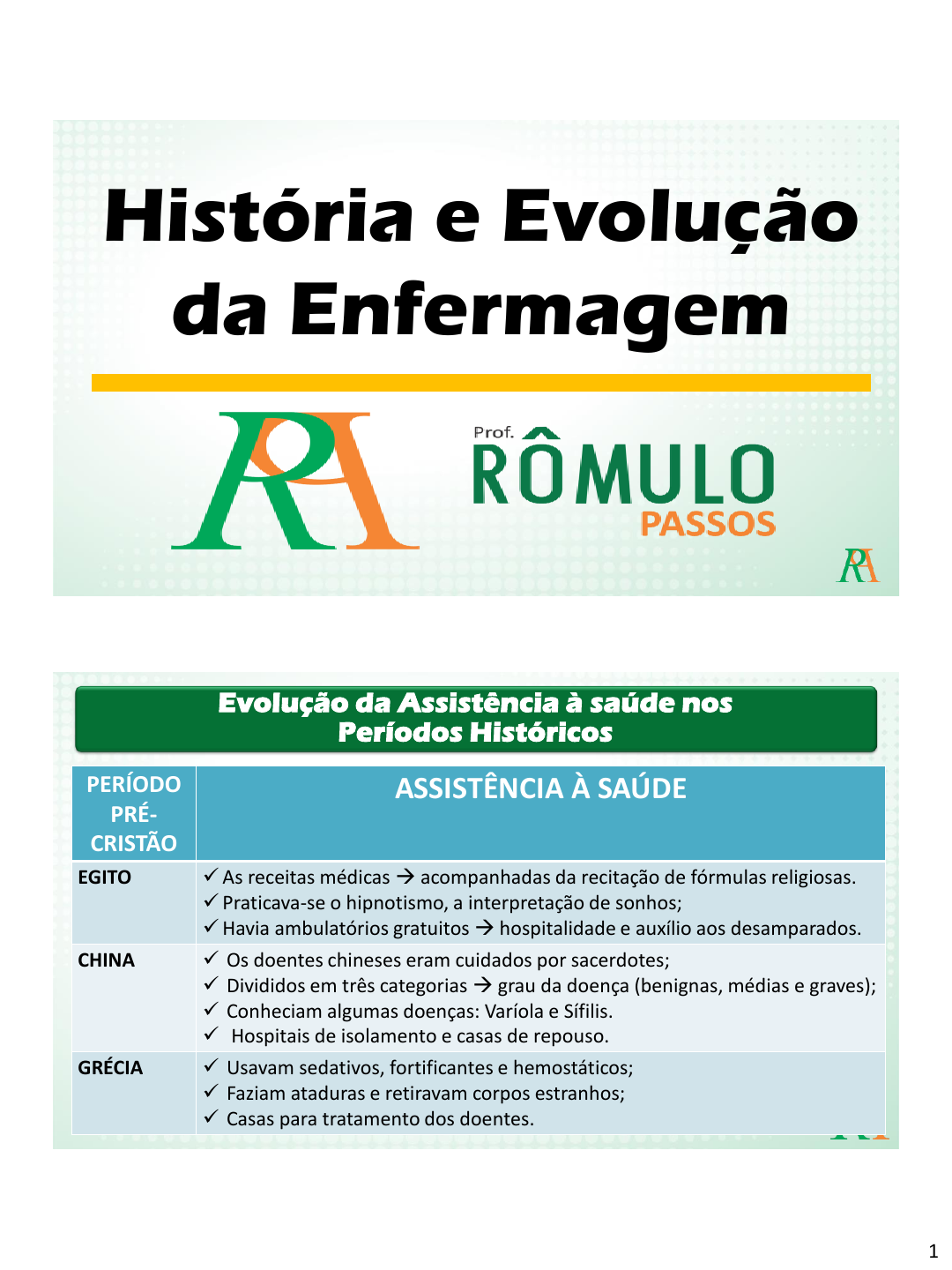 1 História e Evolução da Enfermagem Evolução da Assistência à saúde nos Períodos Históricos PERÍODO PRÉ- CRISTÃO ASSISTÊNCIA À SAÚDE EGITO As receitas médicas acompanhadas da recitação de fórmulas religiosas. Praticava-se o hipnotismo, a interpretação de sonhos; Havia ambulatórios gratuitos hospitalidade e auxílio aos desamparados. CHINA Os doentes chineses eram cuidados por sacerdotes; Divididos em três categorias grau da doença (benignas, médias e graves); Conheciam algumas doenças: Varíola e Sífilis. Hospitais de isolamento e casas de repouso. GRÉCIA Usavam sedativos, fortificantes e hemostáticos; Faziam ataduras e retiravam corpos estranhos; Casas para tratamento dos doentes. - 2 Origem da Profissão Prática domiciliar de partos e a atuação pouco clara de mulheres de classe social elevada FASE DE EMPIRISMO – Enfermagem como prática leiga - entre os séculos V e XIII Surgiu do desenvolvimento e evolução das práticas de saúde no decorrer dos períodos históricos Associadas ao trabalho feminino, caracterizado pela prática do cuidar Práticas de saúde instintivas As ações de saúde e, em especial, as de enfermagem, sob a ótica do sistema político-econômico da sociedade capitalista. - Revolução Industrial no século XVI - Surgimento da Enfermagem Moderna O avanço da Medicina vem favorecer a reorganização dos hospitais. Origem da Profissão É neste cenário que a Enfermagem passa a atuar, quando Florence Nightingale é convidada para trabalhar na Guerra da Criméia. - 3 Enfermagem Moderna Nascida em 12 de maio de 1820 Florença, Itália Inteligência incomum, tenacidade de propósitos, determinação e perseverança Desejo de realizar-se como enfermeira Florence Nightingale Trajetória - Florence Nightingale 1844 – Roma, estudar as atividades das Irmandades Católicas 1849 – Viaja ao Egito, e decide-se a servir a Deus Visita o Hospital de Dublin dirigido pela Irmãs de Misericórdia Conhece as Irmãs de Caridade de São Vicente de Paulo, em Paris - 4 Trajetória - Florence Nightingale "Dama da Lâmpada" GUERRA DA CRIMÉIA 1854 – A Inglaterra, a França e a Turquia declaram guerra à Rússia Florence + 38 voluntárias (religiosas e leigas vindas de diferentes hospitais ) Scutari Mortalidade 40% para 2% Prêmio do Governo Inglês 1859 – Escola De Enfermagem no Hospital Saint Thomas 1820 - 1910 Escola de Enfermagem Nightingaleana Disciplina rigorosa, do tipo militar, bem como a exigência de qualidades morais das candidatas. FILOSOFIA 1 -Treinamento de enfermeiras 2 - Escolas de treinamento 3 - Enfermeiras profissionais 4 - Estudantes PONTOS ESSENCIAIS 1. Direção da escola por uma Enfermeira 2. Mais ensino metódico, em vez de apenas ocasional. 3. Seleção de candidatos do ponto de vista físico, moral, intelectual e aptidão profissional. Sistema Nightingale de ensino - 5 Primeiras Escolas de Enfermagem no Mundo ENFERMAGEM SURGE: Não mais como uma atividade empírica, desvinculada do saber especializado, Mas como uma ocupação assalariada Atender a necessidade de mão-de-obra nos hospitais Constituindo-se como uma prática social institucionalizada e específica. INGLATERRA 1873 - EUA História da Enfermagem no Brasil A organização da Enfermagem na Sociedade Brasileira começa no período colonial e vai até o final do século XIX. Anna Nery Ana Justina Ferreira - Nasceu em 13 de dezembro de 1814 - Cachoeira, na Província da Bahia Ficou viúva aos 30 anos de Isidoro Antônio Nery Teve 2 filhos (médico militar; oficial do exército) - 6 Trajetória – Anna Nery GUERRA DO PARAGUAI (1864 – 1870) Seus dois filhos Servir a Pátria Não resiste à separação da família coloca-se à disposição da Pátria Em 15 de agosto campos de batalha Improvisa hospitais; Não mede esforços no atendimento aos feridos 5 anos depois Volta ao Brasil Recebe uma coroa de louros; Sua imagem é pintada por Victor Meireles e é colocada no edifício do Paço Municipal; Recebe uma pensão do governo imperial; Medalhas humanitárias e de campanha. Trajetória – Anna Nery Faleceu no Rio de Janeiro a 20 de maio de 1880. A primeira Escola de Enfermagem fundada no Brasil recebeu o seu nome: Anna Nery Assim como Florence Nightingale, rompeu com os preconceitos da época que faziam da mulher prisioneira do lar. Foto de Museu Nacional de Enfermagem Anna Nery - 7 Primeiras Escolas de Enfermagem no Brasil 1890 - Escola de Enfermagem "Alfredo Pinto" •O curso tinha três anos de duração e era dirigida por enfermeiras diplomadas. 1916 - Escola da Cruz Vermelha do Rio de Janeiro • Iniciou com um curso de socorrista, para atender às necessidades prementes da 1ª Guerra Mundial. 1923 - Escola Anna Nery • Iniciou com 14 alunas; • Instalou-se pequeno internato próximo ao Hospital São Francisco de Assis, onde seriam feitos os primeiros estágios. Primeiras Escolas de Enfermagem no Brasil 1933 - Escola de Enfermagem Carlos Chagas • A primeira a funcionar fora da Capital da República e a diplomar religiosas no Brasil. 1939 - Escola de Enfermagem "Luisa de Marillac" • Representou um avanço na Enfermagem Nacional; • Abriu largamente suas portas, não só às jovens estudantes seculares, como também às religiosas de todas as Congregações. - 8 Primeiras Escolas de Enfermagem no Brasil 1939 - Escola Paulista de Enfermagem • Pioneira da renovação da enfermagem na Capital paulista; • Acolheu também religiosas de outras Congregações; • Uma das importantes contribuições dessa escola foi início dos Cursos de Pós-Graduação em Enfermagem Obstétrica. 1944 - Escola de Enfermagem da USP • Fundada com a colaboração da Fundação de Serviços de Saúde Pública (FSESP); • faz parte da Universidade de São Paulo. Significado da Lâmpada para Enfermagem Sentinela Vigília constante Cuidado contínuo - 9 (Questões) História e Evolução da Enfermagem 1. (EBSERH/ IADES/ 2014) Desde o tempo de Florence Nightingale, o enfermeiro usa