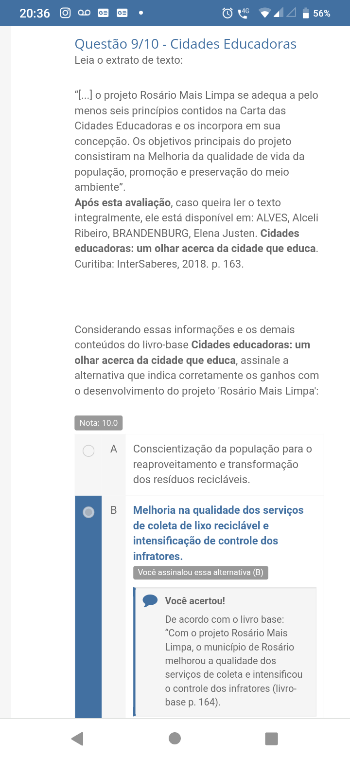 20:36 56% Questão 9/10 - Cidades Educadoras Leia o extrato de texto: "[...] o projeto Rosário Mais Limpa se adequa a pelo menos seis princípios contidos na Carta das Cidades Educadoras e os incorpora em sua concepção. Os objetivos principais do projeto consistiram na Melhoria da qualidade de vida da população, promoção e preservação do meio ambiente". Após esta avaliação, caso queira ler o texto integralmente, ele está disponível em: ALVES, Alceli Ribeiro, BRANDENBURG, Elena Justen. Cidades educadoras: um olhar acerca da cidade que educa. Curitiba: InterSaberes, 2018. p. 163. Considerando essas informações e os demais conteúdos do livro-base Cidades educadoras: um olhar acerca da cidade que educa, assinale a alternativa que indica corretamente os ganhos com o desenvolvimento do projeto Mais Nota: 10.0 A Conscientização da população para o reaproveitamento e transformação dos resíduos recicláveis. B Melhoria na qualidade dos serviços de coleta de lixo reciclável e intensificação de controle dos infratores. Você assinalou essa alternativa (B) Você acertou! De acordo com o livro base: "Com o projeto Rosário Mais Limpa, o município de Rosário melhorou a qualidade dos serviços de coleta e intensificou o controle dos infratores (livro- base p. 164).