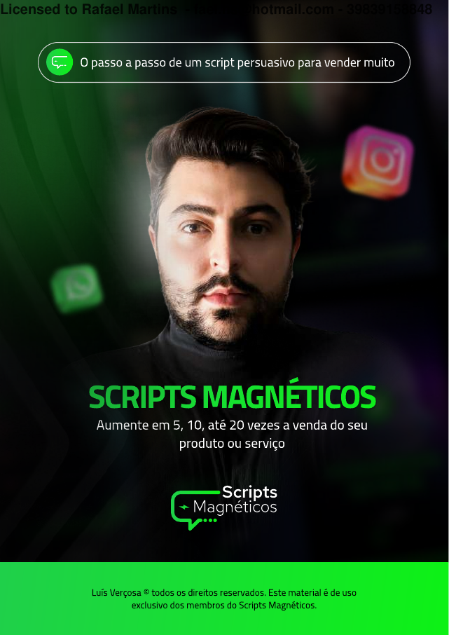 Luís Verçosa © ️todos os direitos reservados. Este material é de uso exclusivo dos membros do Scripts Magnéticos. Scripts magnéticos Aumente em 5, 10, até 20 vezes a venda do seu produto ou serviço Scripts Magnéticos O passo a passo de um script persuasivo para vender muito Licensed to Rafael Martins - fael.hs@hotmail.com - 39839158848 Nunca se deve entrar oferecendo o produto direto. O primeiro passo é criar uma conexão com o cliente. Ele precisa sentir que você está interessado em ajudá-lo a resolver um problema ou satisfazer um desejo. E antes de continuar, eu quero que você entenda porque eu usei a palavra “conexão” ao invés da tradicional “relacionamento”. Há algumas semanas atrás, eu vi um afiliado se gabando que havia estabelecido um relacionamento tão forte com uma cliente a ponto dela contar segredos íntimos da vida dela. E o vendedor afiliado continuava a conversa, enviando áudios e texto. Bem, na minha opinião, ele perdeu tempo e energia numa conversa improdutiva. Veja que eu não tenho nada contra ajudar pessoas, mesmo porque esse é o meu trabalho. Mas, é importante que você entenda que criar conexão humana com seu cliente é muito diferente de ficar amigo dele. Tendo esclarecido este ponto, voltemos ao Script de Vendas. Se apresente, diga sua especialidade (te traz autoridade) e sua função (cargo, trabalho, empresa). Também pergunte o nome do cliente, mesmo que o nome do cliente esteja no WhatsApp ou no Direct: Passo 1: Estabeleça conexão Luís Verçosa © ️todos os direitos reservados. Este material é de uso exclusivo dos membros do Scripts Magnéticos. Scripts Magnéticos O passo a passo de um script persuasivo para vender muito É importante que você entenda que não basta apenas enviar mensagens cheias de "gatilhos mentais" para o cliente. Existe uma sequência de mensagens estrategicamente pensadas para conduzir o cliente numa jornada que vai da apatia e desconfiança para um estado excitante de compra. Por isso, siga o passo a passo abaixo: Você Olá! Tudo bem? Eu sou o Gabriel, especialista em emagrecimento saudável e consultor da Eleve. Qual seu nome? Licensed to Rafael Martins - fael.hs@hotmail.com - 39839158848 Luís Verçosa © ️todos os direitos reservados. Este material é de uso exclusivo dos membros do Scripts Magnéticos. Scripts Magnéticos O passo a passo de um script persuasivo para vender muito Após o cliente responder, peça permissão para fazer algumas perguntas. Você Fulana, você me permite fazer algumas perguntas para poder te ajudar melhor? Sempre peça permissão para fazer perguntas. Porque quando alguém começa a nos fazer perguntas, em algum momento nos sentimos invadidos e surge uma ponta de desconfiança “O que essa pessoa, que eu nem conheço, está querendo?”. Porém, quando consentimos que um estranho nos faça perguntas, este desconforto desaparece, pelo menos por algum tempo. Ao contrário das típicas perguntas exploratórias e de qualificação da estratégia de vendas clássica, as perguntas que são feitas nesta etapa do Script têm o propósito de criar conexão com o cliente e, ao mesmo tempo, despertar emoções ao lembrá-lo da situação atual na qual ele se encontra. E a parte mais estranha do Script de Vendas com copywriting é que as respostas do cliente não importam. Raramente elas farão diferença, porque o Script de Vendas seguirá em frente conforme foi planejado. O que importa é que as perguntas façam o cliente refletir sobre os desconfortos que ele enfrenta. Vejamos a alguns exemplos: Fazendo perguntas persuasivas Licensed to Rafael Martins - fael.hs@hotmail.com - 39839158848 Luís Verçosa © ️todos os direitos reservados. Este material é de uso exclusivo dos membros do Scripts Magnéticos. Scripts Magnéticos O passo a passo de um script persuasivo para vender muito → Lembra ela do estado de obesidade atual Você Fulana, quantos quilos você quer perder? → Faz com que ela pense na vida que ela leva e a situação que ela está Você E qual sua maior dificuldade para perder peso? (má alimentação, ansiedade, falta de disposição, sobrepeso, etc...) Aqui é importante adotar uma abordagem empática, mesmo que o cliente forneça respostas diferentes do esperado ou acrescente informações por conta própria. Mas evite cair no erro de fazer comentários excessivos sobre a dor que ele te apresentou. A ideia é manter o controle da conversa de maneira profissional, sem perder a sensibilidade e sem envolver-se na vida pessoal do cliente. É preciso focar em aplicar o Script de Vendas e, ao mesmo tempo, jogo de cintura para não ser vítima das objeções ocultas ou perder o controle da conversa para o cliente. Esse é um dos passos mais do seu Script de Vendas. Agora é hora da Promessa criar no cliente sentimentos de esperança e expectativa. Por outro lado, criar uma promessa irresistível que seja boa, não é uma tarefa fácil. Lembre-se: Não use os já batidos modelos usados pela maioria das pessoas. importantes Passo 2: Revele sua Promessa Irresistível Licensed to Rafael Martins - fael.hs@hotmail.com - 39839158848 Luís Verçosa © ️todos os direitos reservados. Este material é de uso exclusivo dos membros do Scripts Magnéticos. Scripts Magnéticos O passo a passo de um script persuasivo para vender muito Essa é a parte que mais requer conhecimento sobre o seu produto ou serviço e dedicação, pois ela irá determinar se o cliente continuará a prestar atenção ou entrará em modo “ouvidor de blá-blá-blá”. Uma boa promessa, além de despertar desejo, esperança e criar expectativa (emoções), ela tem o propósito de iniciar o processo de ancoragem de valor. Ou seja, quando o cliente é impactado pelos benefícios da promessa, ele vai desconfiar que seu produto é caro. E, quando você apresentar o preço na etapa de oferta, ele vai achar barato. Existem diversos modelos de Promessas, mas um que eu gosto é: Você Se eu te ajudasse a
