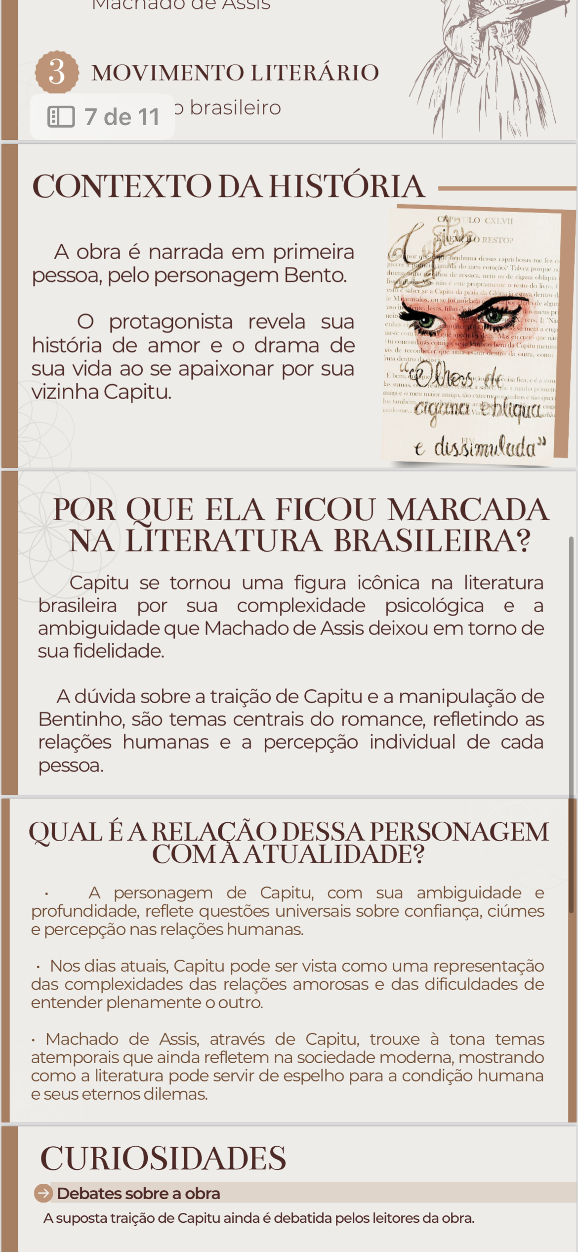 ASSIS 3 MOVIMENTO LITERÁRIO 7 de 11 brasileiro CONTEXTO DA HISTÓRIA CXLVII A obra é narrada em primeira dessas hosas pessoa, pelo personagem Bento. do men coração? Talvez porque de nem de oblique propriamente resto do livro saber a da praia dentro algun meus protagonista revela sua enha história de amor e drama de que não de como dentro sua vida ao se apaixonar por sua Others las sumas vizinha Capitu. meu los e POR QUE ELA FICOU MARCADA NA LITERATURA BRASILEIRA? Capitu se tornou uma figura na literatura brasileira por sua complexidade psicológica e a ambiguidade que Machado de Assis deixou em torno de sua fidelidade. A dúvida sobre a traição de Capitu e a manipulação de Bentinho, são temas centrais do romance, refletindo as relações humanas e a percepção individual de cada pessoa. QUAL DESSA PERSONAGEM COM ATUALIDADE? A personagem de Capitu, com sua ambiguidade e profundidade, reflete questões universais sobre confiança, ciúmes e percepção nas relações humanas. Nos dias atuais, Capitu pode ser vista como uma representação das complexidades das relações amorosas e das dificuldades de entender plenamente outro. Machado de Assis, através de Capitu, trouxe à tona temas atemporais que ainda refletem na sociedade moderna, mostrando como a literatura pode servir de espelho para a condição humana e seus eternos dilemas. CURIOSIDADES Debates sobre a obra A suposta traição de Capitu ainda é debatida pelos leitores da obra.