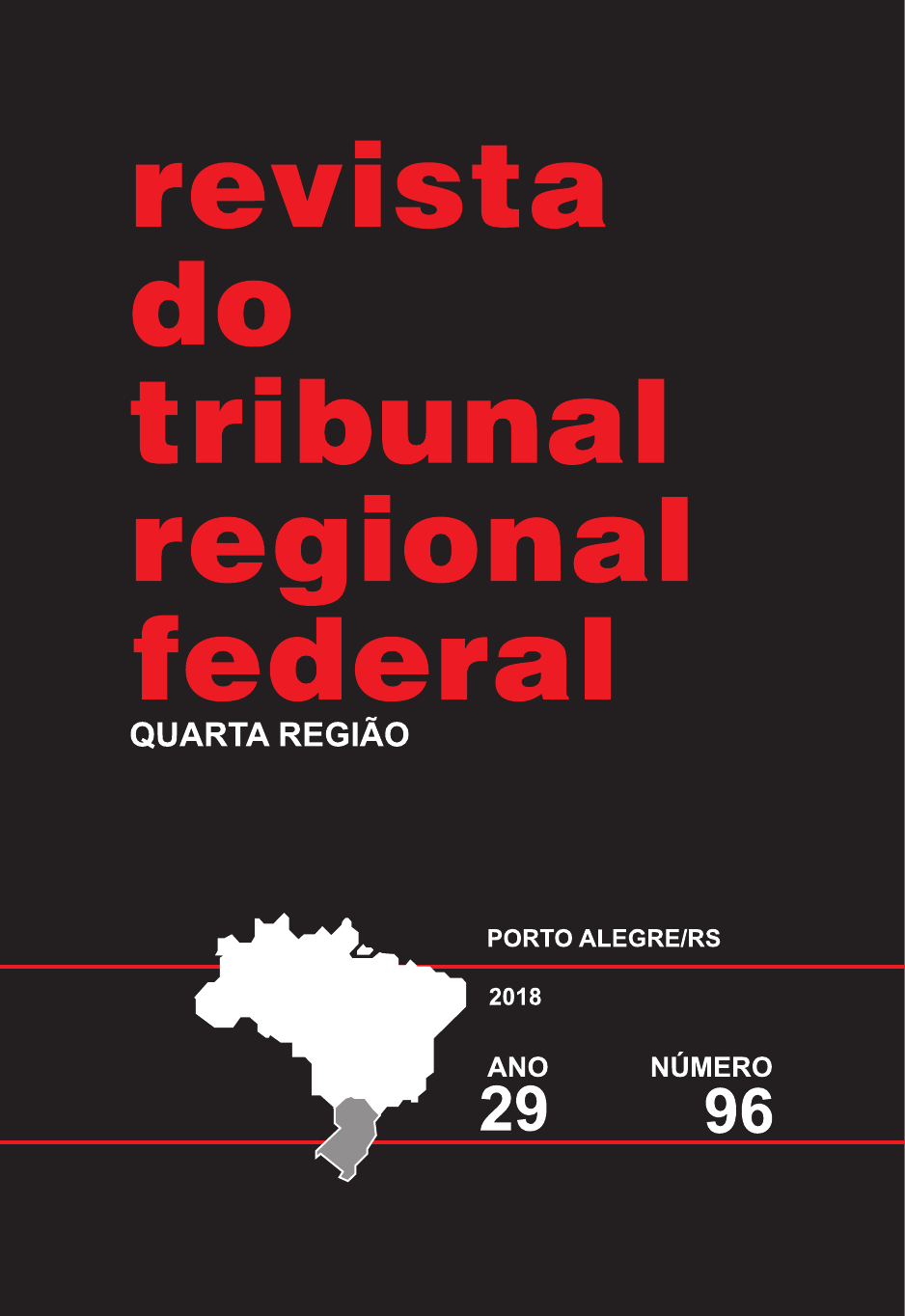 QUARTA REGIÃO revista do tribunal regional federal QUARTA REGIÃO revista do tribunal regional federal R. Trib. Reg. Fed. 4ª Reg. Porto Alegre, a. 29, n. 96, p. 1-424, 2018 Ficha Técnica Diretor Des. Federal Victor Luiz dos Santos Laus Vice-Diretor Des. Federal Márcio Antônio Rocha Conselho Consultivo Des. Federal Sebastião Ogê Muniz Desa. Federal Vânia Hack de Almeida Assessoria Isabel Cristina Lima Selau Direção da Divisão de Publicações Arlete Hartmann Análise e Indexação Giovana Torresan Vieira Marta Freitas Heemann Revisão e Formatação Carlos Campos Palmeiro Leonardo Schneider Marina Spadaro Jacques TRIBUNAL REGIONAL FEDERAL 4ª Região Rua Otávio Francisco Caruso da Rocha, 300 CEP 90.010-395 – Porto Alegre – RS PABX: 0 XX 51-3213-3000 www.trf4.jus.br/revista e-mail: revista@trf4.jus.br Tiragem: 850 exemplares Os textos publicados nesta revista são revisados pela Escola da Magistratura do Tribunal Regional Federal da 4ª Região Revista do Tribunal Regional Federal 4. Região. – Vol. 1, n. 1 (jan./mar. 1990)- . – Porto Alegre: Tribunal Regional Federal da 4. Região, 1990- . v. ; 23 cm. Quadrimestral. Inicialmente trimestral. Repositório Oficial do TRF4 Região. ISSN 0103-6599 1. Direito – Periódicos. I. Título. II. Brasil. Tribunal Regional Federal. Região, 4ª. CDU 34(051) VICTOR LUIZ DOS SANTOS LAUS Des. Federal Diretor da Escola da Magistratura QUARTA REGIÃO revista do tribunal regional federal Des. Federal Diretor da Escola da Magistratura TRIBUNAL REGIONAL FEDERAL DA 4ª REGIÃO JURISDIÇÃO Rio Grande do Sul, Santa Catarina, Paraná COMPOSIÇÃO Em 12 de março de 2018 Des. Federal Carlos Eduardo Thompson Flores Lenz – 28.06.2001 – Presidente Desa. Federal Maria de Fátima Freitas Labarrère – 05.02.1997 – Vice-Presidente Des. Federal Ricardo Teixeira do Valle Pereira – 11.12.2006 – Corregedor Regional Desa. Federal Marga Inge Barth Tessler – 09.12.1994 Des. Federal Paulo Afonso Brum Vaz – 28.06.2001 Des. Federal Luiz Fernando Wowk Penteado – 28.06.2001 Des. Federal Victor Luiz dos Santos Laus – 03.02.2003 – Diretor da Emagis Des. Federal João Batista Pinto Silveira – 06.02.2004 Des. Federal Celso Kipper – 29.03.2004 Des. Federal Luís Alberto d’Azevedo Aurvalle – 27.04.2005 Des. Federal Rômulo Pizzolatti – 09.10.2006 Desa. Federal Luciane Amaral Corrêa Münch – 26.11.2007 Des. Federal Fernando Quadros da Silva – 23.11.2009 – Coordenador dos JEFs Des. Federal Márcio Antônio Rocha – 26.04.2010 – Vice-Diretor da Emagis Des. Federal Rogerio Favreto – 11.07.2011 – Coordenador-Geral do Sistema de Conciliação Des. Federal Jorge Antonio Maurique – 24.02.2012 – Vice-Corregedor Regional Des. Federal Cândido Alfredo Silva Leal Júnior – 22.06.2012 Desa. Federal Vivian Josete Pantaleão Caminha – 08.11.2012 Desa. Federal Claudia Cristina Cristofani – 09.07.2013 Des. Federal João Pedro Gebran Neto – 16.12.2013 Des. Federal Leandro Paulsen – 16.12.2013 Des. Federal Sebastião Ogê Muniz – 16.12.2013 – Conselheiro da Emagis Desa. Federal Vânia Hack de Almeida – 07.08.2014 – Conselheira da Emagis Des. Federal Roger Raupp Rios – 16.05.2016 – Ouvidor Desa. Federal Salise Monteiro Sanchotene – 16.05.2016 Des. Federal Luiz Carlos Canalli – 15.09.2017 Juíza Federal Taís Schilling Ferraz (convocada) Juiz Federal Marcelo De Nardi (convocado) Juiz Federal Altair Antonio Gregorio (convocado) Juíza Federal Gisele Lemke (convocada) Juiz Federal Artur César de Souza (convocado) Juíza Federal Eliana Paggiarin Marinho (convocada) Juiz Federal Alexandre Rossato da Silva Ávila (convocado) Juiz Federal Danilo Pereira Junior (convocado) CORTE ESPECIAL Em 12 de março de 2018 Des. Federal Carlos Eduardo Thompson Flores Lenz – Presidente Desa. Federal Marga Inge Barth Tessler Desa. Federal Maria de Fátima Freitas Labarrère – Vice-Presidente Des. Federal Paulo Afonso Brum Vaz Des. Federal Luiz Fernando Wowk Penteado Des. Federal Victor Luiz dos Santos Laus Des. Federal João Batista Pinto Silveira Des. Federal Ricardo Teixeira do Valle Pereira – Corregedor Regional Des. Federal Fernando Quadros da Silva Des. Federal Márcio Antônio Rocha Des. Federal Rogerio Favreto Des. Federal Jorge Antonio Maurique Des. Federal Cândido Alfredo Silva Leal Júnior Desa. Federal Vivian Josete Pantaleão Caminha Suplentes: Desa. Federal Claudia Cristina Cristofani Des. Federal João Pedro Gebran Neto Des. Federal Leandro Paulsen CONSELHO DE ADMINISTRAÇÃO Em 12 de março de 2018 Des. Federal Carlos Eduardo Thompson Flores Lenz – Presidente Desa. Federal Maria de Fátima Freitas Labarrère – Vice-Presidente Des. Federal Ricardo Teixeira do Valle Pereira – Corregedor Regional Des. Federal João Pedro Gebran Neto Des. Federal Leandro Paulsen Suplentes: Desa. Federal Salise Monteiro Sanchotene – 1ª Suplente Desa. Federal Marga Inge Barth Tessler – 2ª Suplente PRIMEIRA SEÇÃO Desa. Federal Maria de Fátima Freitas Labarrère – Presidente Des. Federal Rômulo Pizzolatti Desa. Federal Luciane Amaral Corrêa Münch Des. Federal Sebastião Ogê Muniz Des. Federal Roger Raupp Rios SEGUNDA SEÇÃO Desa. Federal Maria de Fátima Freitas Labarrère – Presidente Desa. Federal Marga Inge Barth Tessler Des. Federal Luís Alberto d’Azevedo Aurvalle Des. Federal Rogerio Favreto Des. Federal Cândido Alfredo Silva Leal Júnior Desa. Federal Vivian Josete Pantaleão Caminha Desa. Federal Vânia Hack de Almeida TERCEIRA SEÇÃO Desa. Federal Maria de Fátima Freitas Labarrère – Presidente Des. Federal Paulo Afonso Brum Vaz Des. Federal Luiz Fernando Wowk Penteado Des. Federal João Batista Pinto Silveira Des. Federal Celso Kipper Des. Federal Fernando Quadros da Silva Des. Federal Jorge Antonio Maurique Des. Federal Luiz Carlos Canalli Juiz Federal Danilo Pereira Junior (convocado em decorrência do falecimento do Des. Federal Amaury Chaves de Athayde) QUARTA SEÇÃO Desa. Federal Maria de F