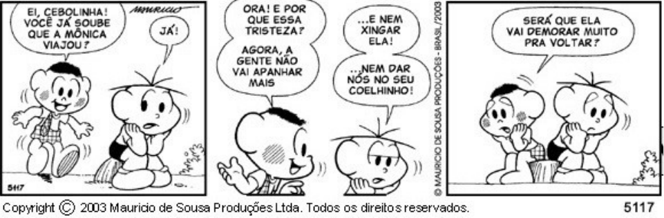 1. A frase: “Ei, Cebolinha!” da fala do Cascão no primeiro quadrinho revela: