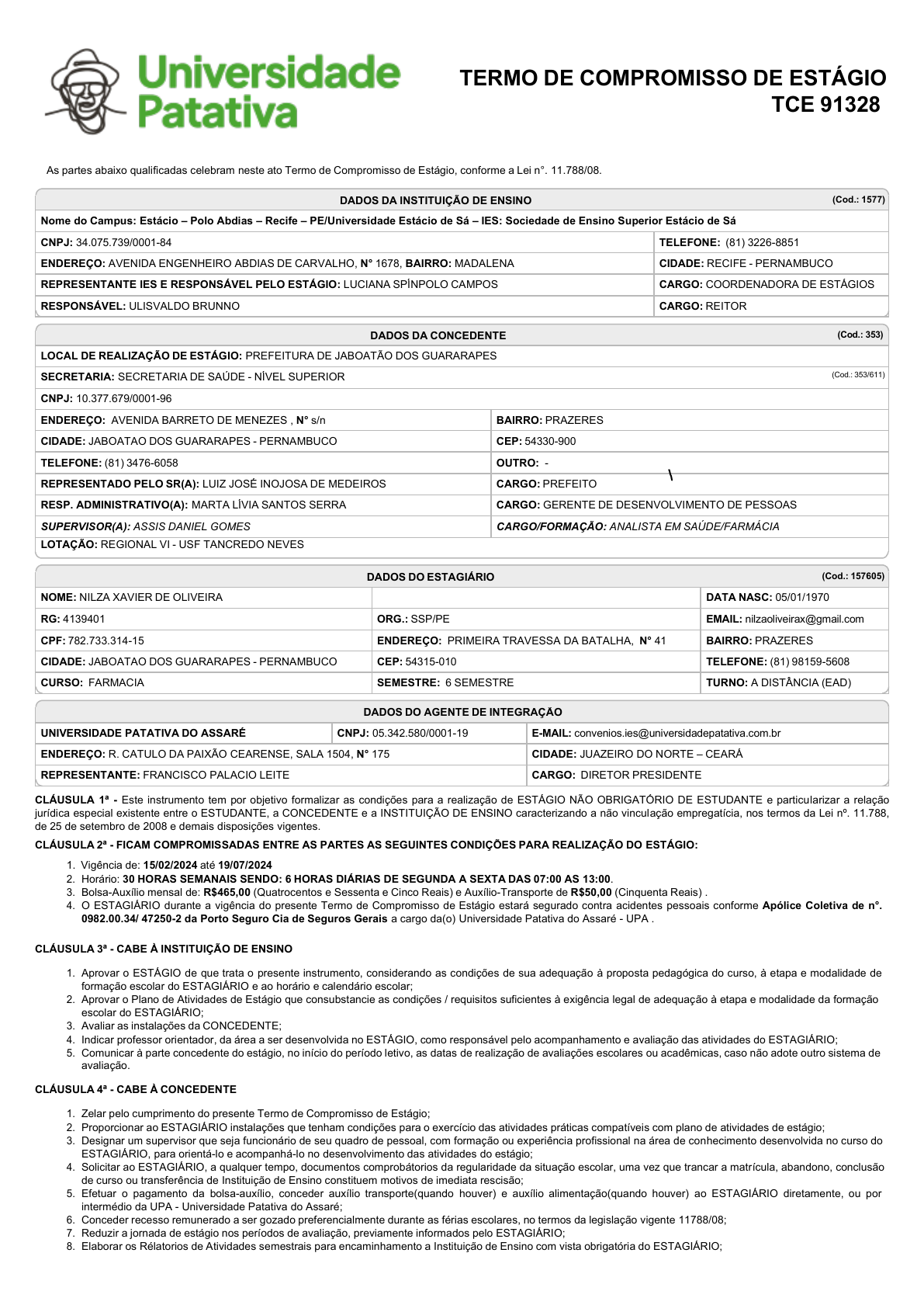 TERMO DE COMPROMISSO DE ESTÁGIO TCE 91328 As partes abaixo qualificadas celebram neste ato Termo de Compromisso de Estágio, conforme a Lei n°. 11.788/08. DADOS DA INSTITUIÇÃO DE ENSINO (Cod.: 1577) Nome do Campus: Estácio – Polo Abdias – Recife – PE/Universidade Estácio de Sá – IES: Sociedade de Ensino Superior Estácio de Sá CNPJ: 34.075.739/0001-84 TELEFONE: (81) 3226-8851 ENDEREÇO: AVENIDA ENGENHEIRO ABDIAS DE CARVALHO, N° 1678, BAIRRO: MADALENA CIDADE: RECIFE - PERNAMBUCO REPRESENTANTE IES E RESPONSÁVEL PELO ESTÁGIO: LUCIANA SPÍNPOLO CAMPOS CARGO: COORDENADORA DE ESTÁGIOS RESPONSÁVEL: ULISVALDO BRUNNO CARGO: REITOR DADOS DA CONCEDENTE (Cod.: 353) LOCAL DE REALIZAÇÃO DE ESTÁGIO: PREFEITURA DE JABOATÃO DOS GUARARAPES SECRETARIA: SECRETARIA DE SAÚDE - NÍVEL SUPERIOR (Cod.: 353/611) CNPJ: 10.377.679/0001-96 ENDEREÇO: AVENIDA BARRETO DE MENEZES , N° s/n BAIRRO: PRAZERES CIDADE: JABOATAO DOS GUARARAPES - PERNAMBUCO CEP: 54330-900 TELEFONE: (81) 3476-6058 OUTRO: - REPRESENTADO PELO SR(A): LUIZ JOSÉ INOJOSA DE MEDEIROS CARGO: PREFEITO RESP. ADMINISTRATIVO(A): MARTA LÍVIA SANTOS SERRA CARGO: GERENTE DE DESENVOLVIMENTO DE PESSOAS SUPERVISOR(A): ASSIS DANIEL GOMES CARGO/FORMAÇÃO: ANALISTA EM SAÚDE/FARMÁCIA LOTAÇÃO: REGIONAL VI - USF TANCREDO NEVES DADOS DO ESTAGIÁRIO (Cod.: 157605) NOME: NILZA XAVIER DE OLIVEIRA DATA NASC: 05/01/1970 RG: 4139401 ORG.: SSP/PE EMAIL: nilzaoliveirax@gmail.com CPF: 782.733.314-15 ENDEREÇO: PRIMEIRA TRAVESSA DA BATALHA, N° 41 BAIRRO: PRAZERES CIDADE: JABOATAO DOS GUARARAPES - PERNAMBUCO CEP: 54315-010 TELEFONE: (81) 98159-5608 CURSO: FARMACIA SEMESTRE: 6 SEMESTRE TURNO: A DISTÂNCIA (EAD) DADOS DO AGENTE DE INTEGRAÇÃO UNIVERSIDADE PATATIVA DO ASSARÉ CNPJ: 05.342.580/0001-19 E-MAIL: convenios.ies@universidadepatativa.com.br ENDEREÇO: R. CATULO DA PAIXÃO CEARENSE, SALA 1504, N° 175 CIDADE: JUAZEIRO DO NORTE – CEARÁ REPRESENTANTE: FRANCISCO PALACIO LEITE CARGO: DIRETOR PRESIDENTE CLÁUSULA 1ª - Este instrumento tem por objetivo formalizar as condições para a realização de ESTÁGIO NÃO OBRIGATÓRIO DE ESTUDANTE e particularizar a relação jurídica especial existente entre o ESTUDANTE, a CONCEDENTE e a INSTITUIÇÃO DE ENSINO caracterizando a não vinculação empregatícia, nos termos da Lei nº. 11.788, de 25 de setembro de 2008 e demais disposições vigentes. CLÁUSULA 2ª - FICAM COMPROMISSADAS ENTRE AS PARTES AS SEGUINTES CONDIÇÕES PARA REALIZAÇÃO DO ESTÁGIO: 1. Vigência de: 15/02/2024 até 19/07/2024 2. Horário: 30 HORAS SEMANAIS SENDO: 6 HORAS DIÁRIAS DE SEGUNDA A SEXTA DAS 07:00 AS 13:00. 3. Bolsa-Auxílio mensal de: R$465,00 (Quatrocentos e Sessenta e Cinco Reais) e Auxílio-Transporte de R$50,00 (Cinquenta Reais) . 4. O ESTAGIÁRIO durante a vigência do presente Termo de Compromisso de Estágio estará segurado contra acidentes pessoais conforme Apólice Coletiva de n°. 0982.00.34/ 47250-2 da Porto Seguro Cia de Seguros Gerais a cargo da(o) Universidade Patativa do Assaré - UPA . CLÁUSULA 3ª - CABE À INSTITUIÇÃO DE ENSINO 1. Aprovar o ESTÁGIO de que trata o presente instrumento, considerando as condições de sua adequação à proposta pedagógica do curso, à etapa e modalidade de formação escolar do ESTAGIÁRIO e ao horário e calendário escolar; 2. Aprovar o Plano de Atividades de Estágio que consubstancie as condições / requisitos suficientes à exigência legal de adequação à etapa e modalidade da formação escolar do ESTAGIÁRIO; 3. Avaliar as instalações da CONCEDENTE; 4. Indicar professor orientador, da área a ser desenvolvida no ESTÁGIO, como responsável pelo acompanhamento e avaliação das atividades do ESTAGIÁRIO; 5. Comunicar à parte concedente do estágio, no início do período letivo, as datas de realização de avaliações escolares ou acadêmicas, caso não adote outro sistema de avaliação. CLÁUSULA 4ª - CABE À CONCEDENTE 1. Zelar pelo cumprimento do presente Termo de Compromisso de Estágio; 2. Proporcionar ao ESTAGIÁRIO instalações que tenham condições para o exercício das atividades práticas compatíveis com plano de atividades de estágio; 3. Designar um supervisor que seja funcionário de seu quadro de pessoal, com formação ou experiência profissional na área de conhecimento desenvolvida no curso do ESTAGIÁRIO, para orientá-lo e acompanhá-lo no desenvolvimento das atividades do estágio; 4. Solicitar ao ESTAGIÁRIO, a qualquer tempo, documentos comprobátorios da regularidade da situação escolar, uma vez que trancar a matrícula, abandono, conclusão de curso ou transferência de Instituição de Ensino constituem motivos de imediata rescisão; 5. Efetuar o pagamento da bolsa-auxílio, conceder auxílio transporte(quando houver) e auxílio alimentação(quando houver) ao ESTAGIÁRIO diretamente, ou por intermédio da UPA - Universidade Patativa do Assaré; 6. Conceder recesso remunerado a ser gozado preferencialmente durante as férias escolares, no termos da legislação vigente 11788/08; 7. Reduzir a jornada de estágio nos períodos de avaliação, previamente informados pelo ESTAGIÁRIO; 8. Elaborar os Rélatorios de Atividades semestrais para encaminhamento a Instituição de Ensino com vista obrigatória do ESTAGIÁRIO; mailto:nilzaoliveirax@gmail.com mailto:convenios.ies@universidadepatativa.com.br 9. Entregar, por ocasião do desligamento, Termo de Realização do Estágio com indicação resumida das atividades desenvolvidas, dos períodos e da avaliação de desempenho; 10. Manter em arquivo e à disposição da fiscalização os documentos firmados que comprovem a relação de estágio; 11. Informar a Universidade Patativa do Assaré - UPA a rescisão antecipada deste instrumento, para as devidas providencias administrativas que se fizerem necessárias; 12. Permitir que o estudante inicie o estágio, somente quando o Termo de Compromisso estiver devidamente assinado por todas as partes envolvidas. CLÁUSULA 5ª 