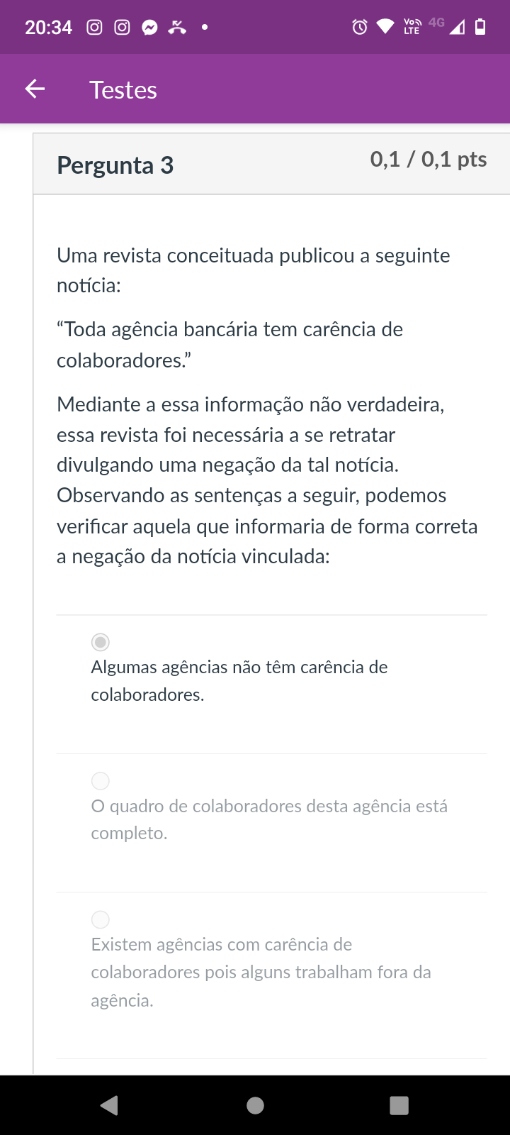20:34 O 4G LTE I Testes Pergunta 3 0,1 / 0,1 pts Uma revista conceituada publicou a seguinte notícia: "Toda agência bancária tem carência de colaboradores." Mediante a essa informação não verdadeira, essa revista foi necessária a se retratar divulgando uma negação da tal notícia. Observando as sentenças a seguir, podemos verificar aquela que informaria de forma correta a negação da notícia vinculada: Algumas agências não têm carência de colaboradores. O quadro de colaboradores desta agência está completo. Existem agências com carência de colaboradores pois alguns trabalham fora da agência.
