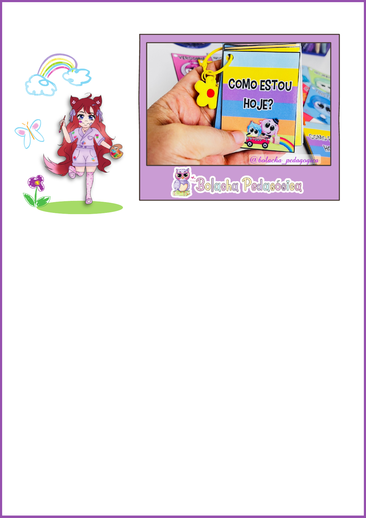 www.bolachapedagogica.com @bolacha_pedagogica Chaveiro das emoções Divertidamente Para montar o chaveiro, deve plastificar e unir com argola ou fitinha de cetim. No post tem sugestões de dinâmicas para fazer utilizando o chaveiro. Acesse: https://bolachapedagogica.com/chaveiro-das-emocoes- divertidamente/ Instagram: @bolacha_pedagogica Para mais recursos gratuitos, acesse: www.bolachapedagogica.com Chaveiro das emoções Divertidamente Instagram: @bolacha_pedagogica Para mais recursos gratuitos, acesse: www.bolachapedagogica.com Chaveiro das emoções Divertidamente Direitos Autorais Este material foi produzido pela Pâmela Fumagalli, autora e criadora do portal bolachapedagogica.com. Este material está sendo disponibilizado gratuitamente no site, não sendo autorizada a venda ou alteração do arquivo seja de todo o conteúdo ou parte dele. Caso tenha a intenção de indicar este material para qualquer pessoa, ao invés de compartilhar o arquivo, sugerimos que deve ser compartilhado o link do site www.bolachapedagogica.com para que o interessado obtenha o material a partir do site. A venda ou alteração deste material ou parte dele por pessoa física, jurídica, sites, blogs, canais, páginas/perfis “sociais” sem a autorização previa da autora, incorre em violação de direito autoral conforme Código Penal Art 184, e haverá a denúncia em órgão de proteção global como DMCA o que poderá acarretar em penalizações judiciais, bloqueio de sua conta em perfil social e bloqueio de conta do Google Adsense. Material Disponibilizado Gratuitamente Recursos, ferramentas e ideias pedagógicas! O portal preferido dos professores da educação @bolacha_pedagogica Apoie o projeto compartilhando o endereço: www.bolachapedagogica.com Venda Proibida Se este material te ajudou de alguma forma, compartilhe as artes nas redes sociais e marque o perfil Página 1 Página 2 Página 3 Página 4